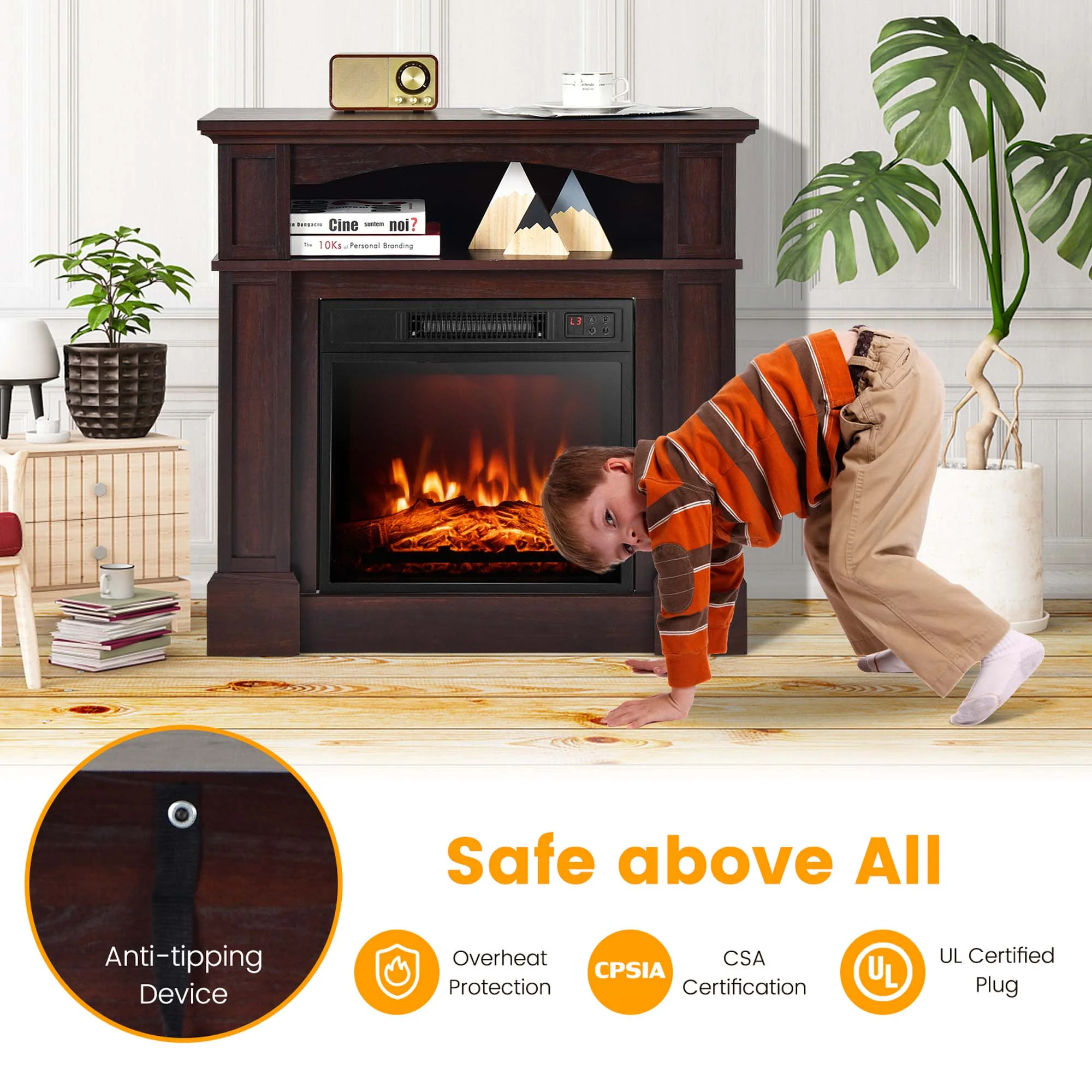 Realistic Flame Effect: The electric fireplace features vivid 3D dancing flame which adds a piece of elegance to your living space and creates a soothing and clean environment for you to relax. Plus, 3-level flame brightness allows you freely adjust the flame to satisfy multiple demands. Efficient Heating Device: The fireplace also possesses a premium heating device with 1400W heating, 5000 BTU heat output and 400 Sq.Ft heating area. The high-efficiency heating will quickly drive away your coldness in winter. 2-Way Operation: This mantel fireplace is CSA listed, UL certificated and designed with overheat protection, so the high-level safety will be ensured. There are double controlling ways for you to choose: panel control and remote control with 26 ft effective control distance. Note: the remote control requires 2 x AAA batteries (not included). Elegant & Stylish Mantel: The wood-like countertop and elegant appearance make the fireplace mantel an appealing eye-catcher in your living space. Moreover, the wide countertop and open shelf provide perfect places to store your daily items like plants, decorations and books. User-Friendly Design: The fireplace mantel comes with an anti-tip design for higher safety. Moreover, the electric fireplace operates with low noise, and features 0.5-6H timer and 62°F-82°F thermostat control, allowing you to sleep at ease. And there are 2 operating ways: flame only which can decorate your room in all seasons, or flame and heat mode which will make you warm in cold weather.