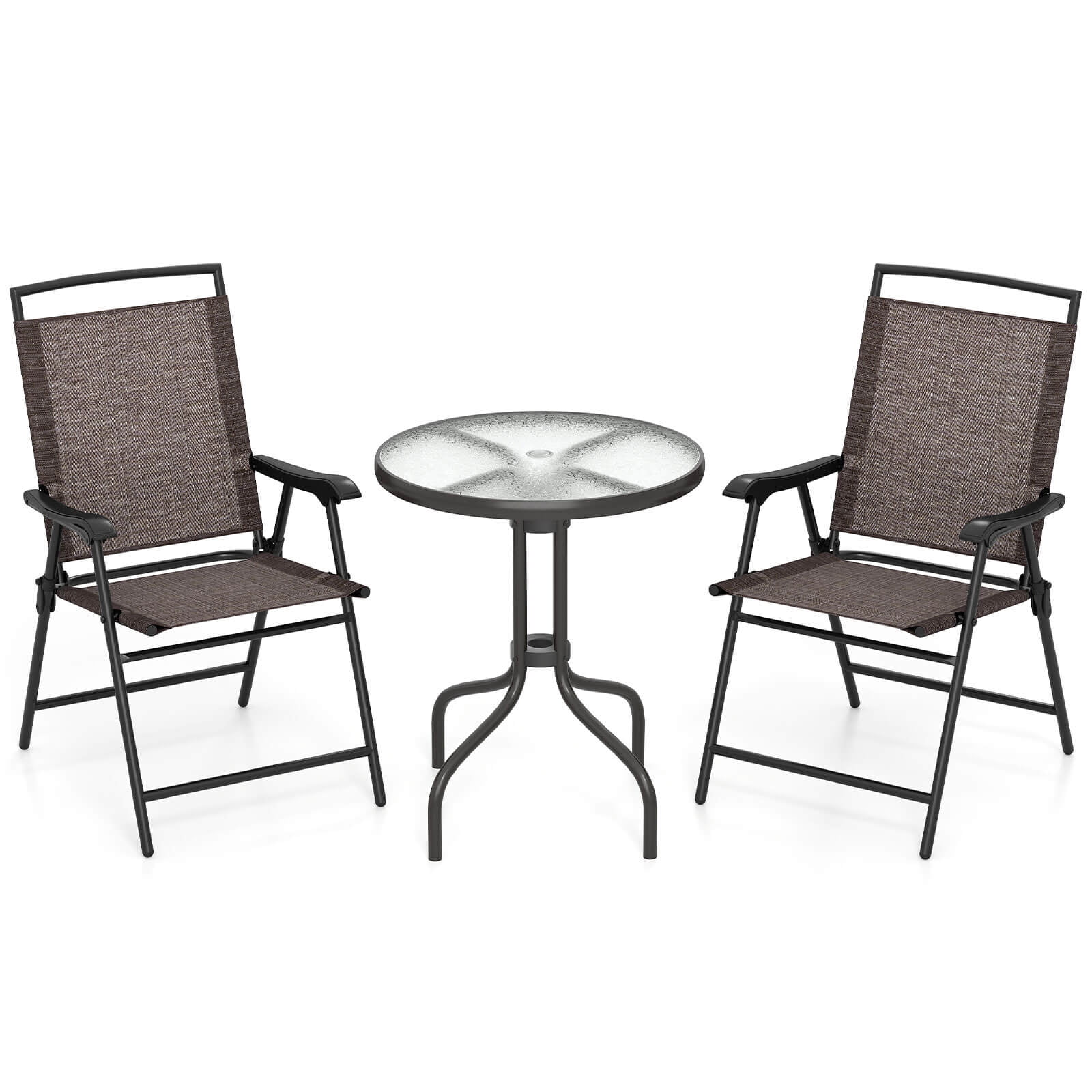 Enjoy outdoor leisure time with our beautiful yet practical 3pc bistro table set. Bistro sets are perfect for outdoor and indoor use. And it offers you a quiet, cozy space to host a conversations, read a book, enjoy morning coffee or whatever else you like. Lightweight and constructed of breathable fabric and sturdy steel, which ensure it can last throughout the seasons. Besides, the table with elegant glass top which ensures practical and decor. This bistro set is best decor to your garden and give your guest a deep impress. It’s also versatile, simply add some throw pillows to add color and pattern, or you can mix and match this outdoor patio furniture with other pieces from the collection. Plus, the chair is foldable and you can use it alone So, buy it now, it would never let you down. Feature Brand new and high quality This is 3 pieces outdoor table chairs set, including 1 round table and 2 folding chairs. With the armrest, this chair can provide extreme comfortable seat. Folding chairs are simple and convenient for storage and transport Round table with a tempered glass, smooth and flat Smart and compact design for space saving Perfect for outdoor, such as garden, patio and pool side Easy to clean and easy to assemble Specification Color: Brown & Black Material: Fabric Tempered Glass Steel pipe Dimension of chair:W21.5”xD25.5”xH35” Dimension of folding chair: W21.5”xH33” Dimension of table:W23.5”xH27.5” Table weight:14lbs Chair weight:8.5lbs Table capacity:110lbs Chair capacity:300lbs Package include: 1x Round table 2x Folding chair 1xInstruction