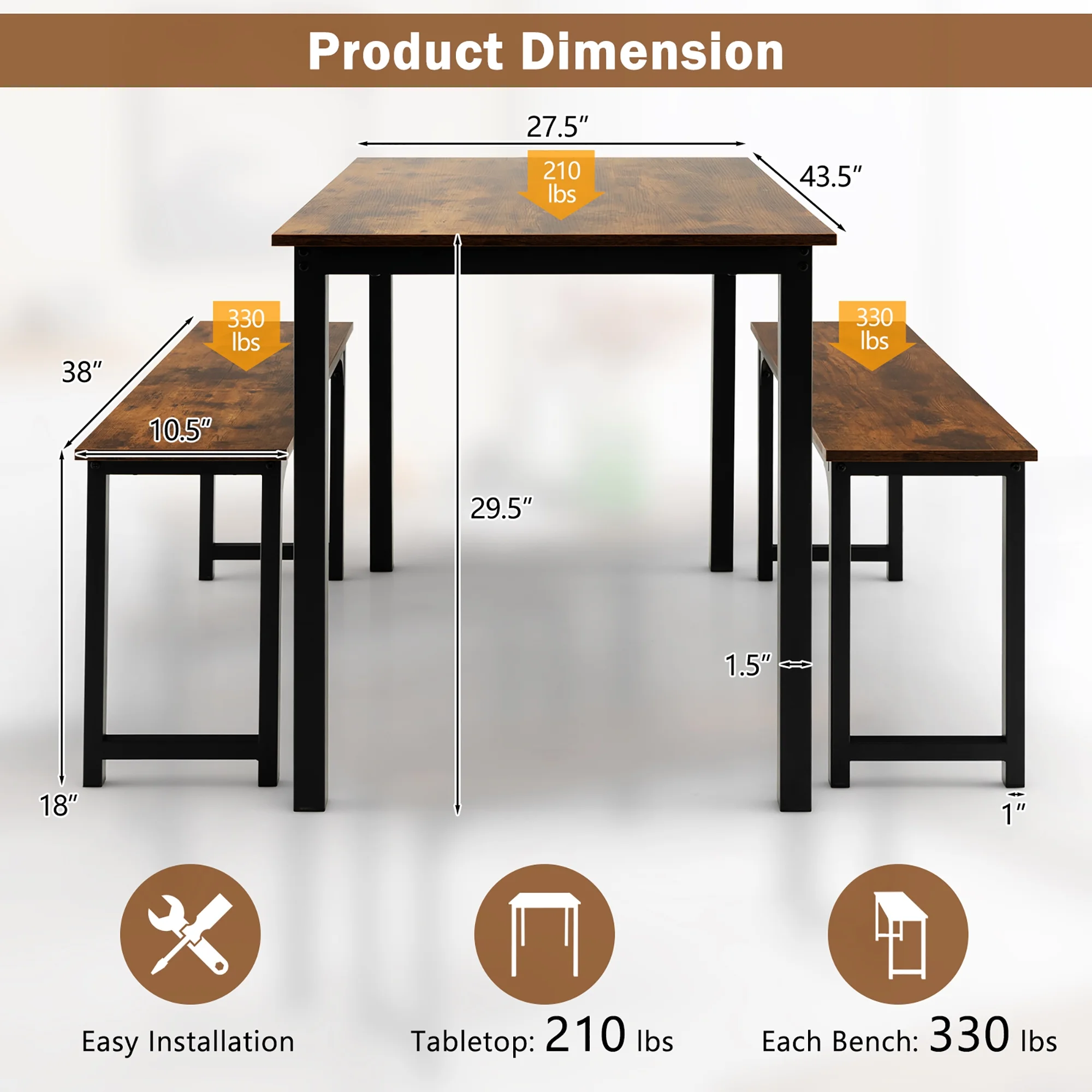 3-Piece Dining Table Set: The 3-piece dining table set are including 1 dining table and 2 benches, which can accommodate 2-4 persons, allowing you to enjoy delightful dining & drinking time with your family or entertain friends with refreshments at home. sturdy Material & Stable Structure: The kitchen table and 2 benches are made of sturdy particleboard that is scratch-resistant and waterproof for easy cleaning. Moreover, it is supported by rustproof powder-coated steel tubes, ensuring excellent durability and stability. The table can load up to 210 lbs, and each bench can load up to 330 lbs. And the anti-slip footpads can protect your floor from scratches. Space-Saving Design & Wide Applications: Both 2 benches can be easily tucked under the dining table for space-saving storage while not in use, which can be a great solution for the small space, apartment, living room, kitchen, restaurant, pub, coffee shop, and more. Moreover, there’s no risk of tripping over the feet of benches while serving the dishes. Large Tabletop & Comfortable Sitting Experience: The tabletop measures 43.5” x 27.5” (L x W), providing sufficient storage space to put tableware, plates, cups, flower pots, and more. Besides, the comfy benches measure 38” x 10.5” x 18” (L x W x H), which conform to the ergonomic design, so you won’t feel tired after sitting for a long time. Modern Appearance & Easy Assembly: With exquisite wood grains on the surface and elegant wood finish, the 3-piece bench-style dining table furniture set can perfectly blend into your home decoration, adding a touch of charm and rustic. In addition, equipped with straightforward instructions and an assembly video, it is easy and quick to finish assembly.