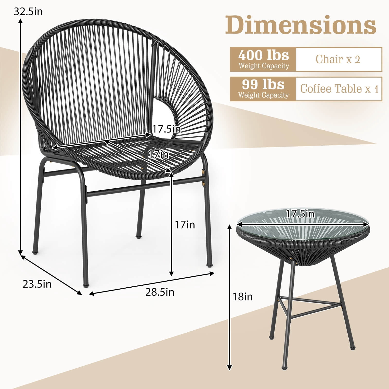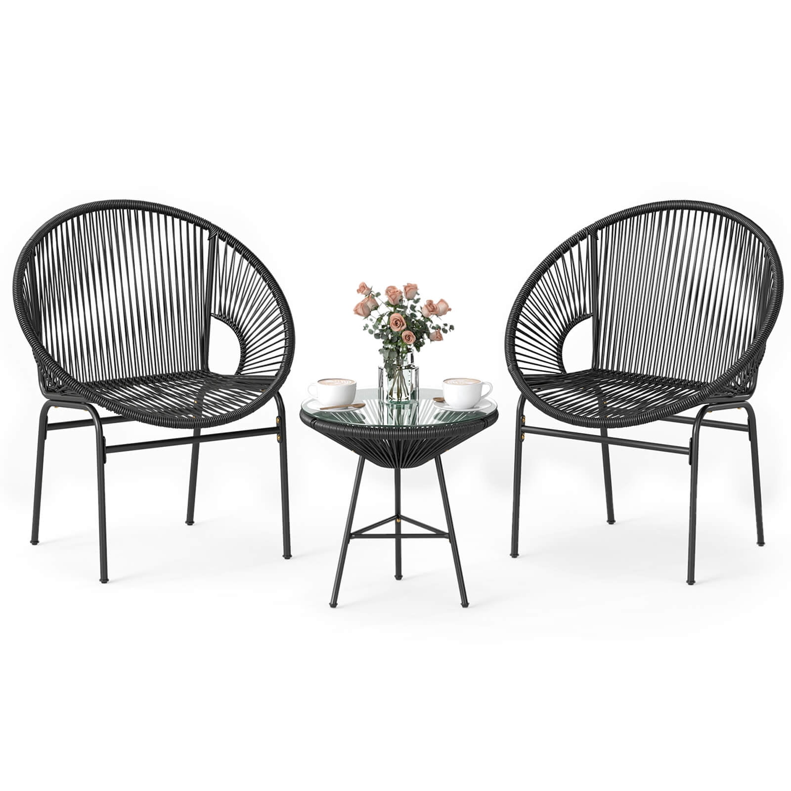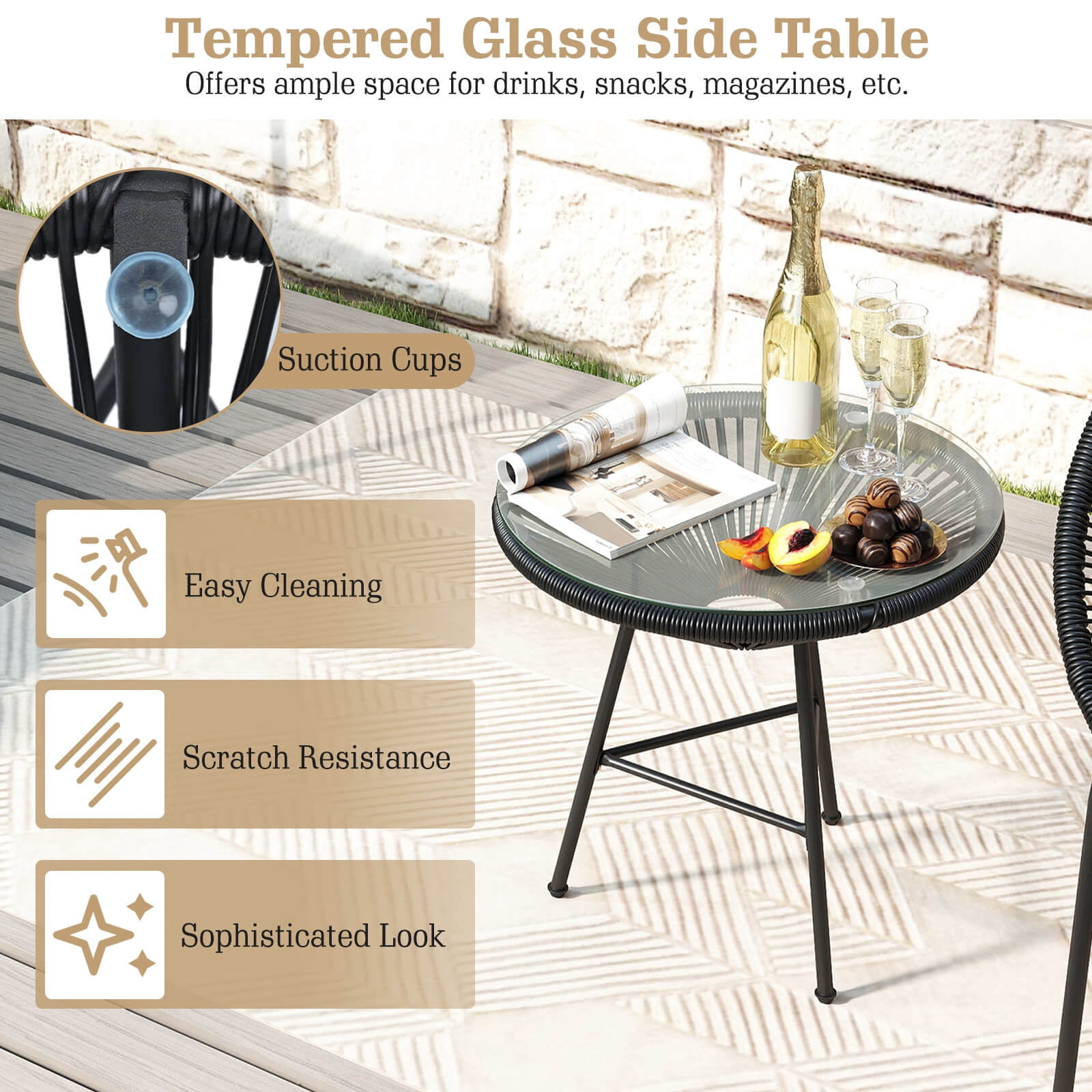 Costway 3PCS Patio Acapulco Furniture Bistro Set Plastic Rope Glass Table Black