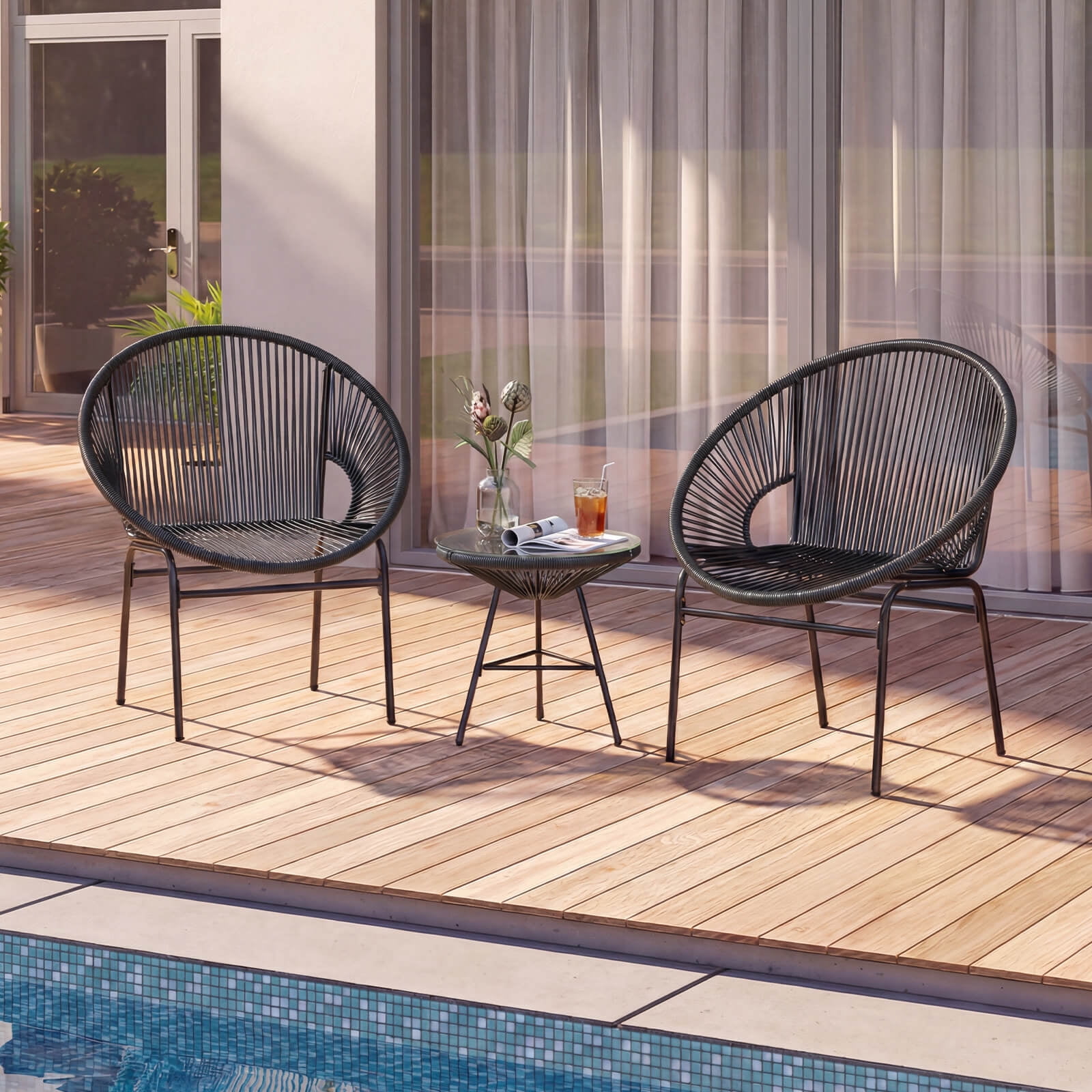 Perfect 3-Piece Patio Set: This patio set consists of 2 comfortable Acapulco chairs and one sturdy table, providing you and your best friend or loved one with a cozy time together. In addition, this toughened glass tabletop allows you to place some fruits, snacks or drinks. Also, it can be used separately as display stand. sturdy & Firm Structure: Made of powder-coated steel frame and weather resistant plastic rope, the set is sturdy and designed for a long-lasting use. Besides, the crossbars added to the chairs and table that provides extra stability, allowing the table to support up to 66lbs as well as each chair to 270lbs. Considerate Details: The chair adopts hollow design which is breathable and offers enjoyable sitting experience, allowing you to sit for a long time without feeling stuffy. Meanwhile, the ergonomic back fits the curve of your body for letting you feel more comfortable. There are also streamlined armrests to provide support and relieve your arms. Elegant Appearance & Wide Usage: Owing a simple and stylish appearance with fluent lines, this delightful patio furniture has a modern charm and can beautify where it is. As it’s lightweight, weighing only 26lbs, you can easily move it to versatile outdoor places and enjoy leisure time peacefully, such as poolside, bistro, patio, garden, etc. Dimension & Easy Assembly: This 3-pc outdoor furniture set includes two chairs measuring 28.5” x 26” x 32.5” each and a table measuring 17.5” x 17.5” x 17.5”. According to the detailed installation manual included, you can easily finish the assembly of this set of 3 patio furniture set and start enjoying outdoor leisure time.