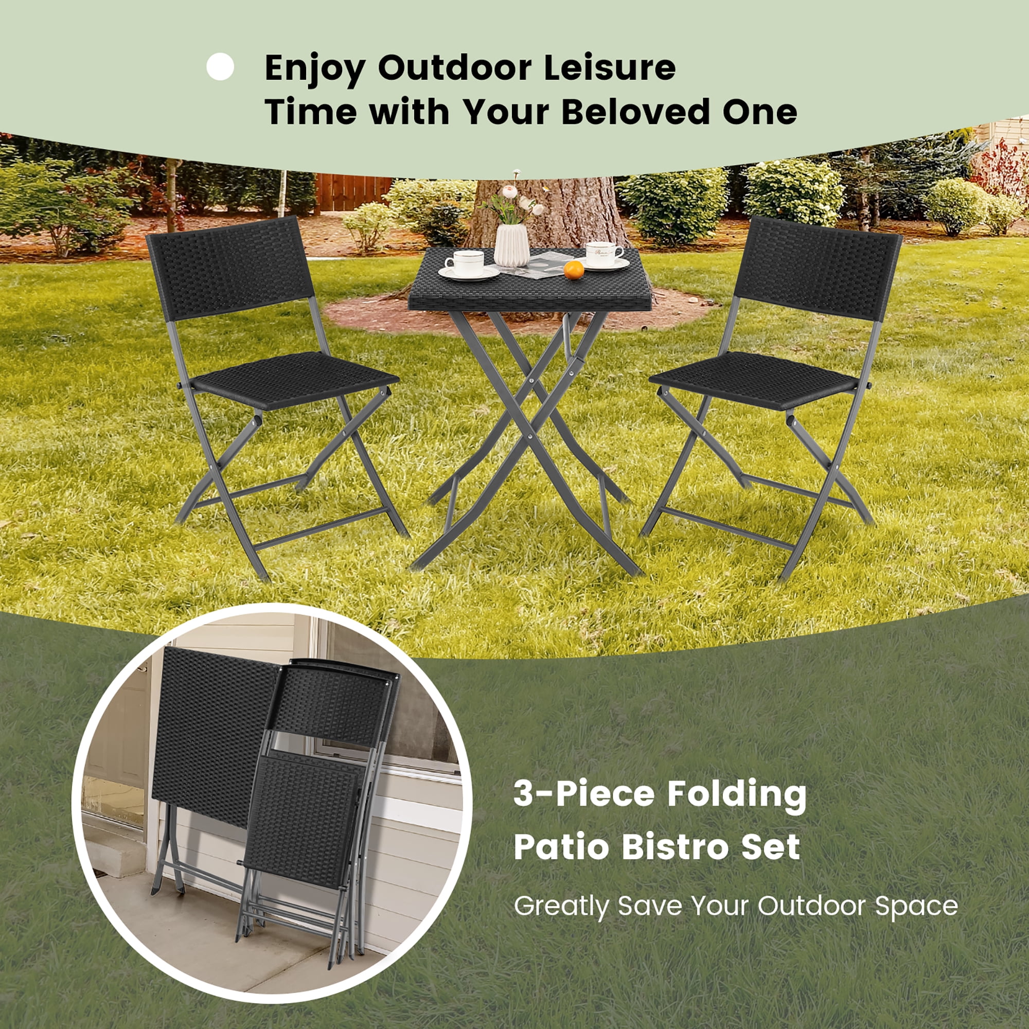 Enjoy outdoor leisure time with your beloved one by using this 3-piece patio bistro set! Including 1 square dining table and 2 patio chairs, this outdoor furniture set creates a comfortable zone for outdoor dinner anywhere. When you sit on the chair, the sturdy steel frame will support you safely and steadily. In daily use outdoors, the steel frame will play its rust-proof advantage and the rattan will show its fade-proof and sun-proof characteristics to make this outdoor dining set accompany you for a longer time. If you do not need the table and chairs, just fold them up for space-saving. Feature Leave table and chairs outdoors without worry due to its rustproof steel frame sturdy black rattan for sun protection and fade resistance Avoid scratching the floor thanks to the anti-scratch foot pads Reinforced X-shaped construction for strong stability All the chairs and table are foldable for space-saving Lightweight design for easy movement Make you feel more comfortable with ergonomic design Suitable for porch, patio, balcony, garden and backyard, etc Add a modern addition to your outdoors No need to assemble Specification Color: Black Material: Rattan, Steel Unfolding Dimension of Table: 23” x 23” x 29” (L x W x H) Folding Dimension of Table: 38” x 23” x 5.5” (L x W x H) Unfolding Dimension of Each Chair: 22” x 17.5” x 31.5” (L x W x H) Folding Dimension of Each Chair: 39” x 17.5” x 5.5” (L x W x H) Seat Height from the Ground: 18” Net Weight of Table: 11 lbs Net Weight of Each Chair: 9 lbs Weight Capacity of Table: 110 lbs Weight Capacity of Each Chair: 330 lbs Package Includes: 1 x Table 2 x Chairs 1 x Instruction