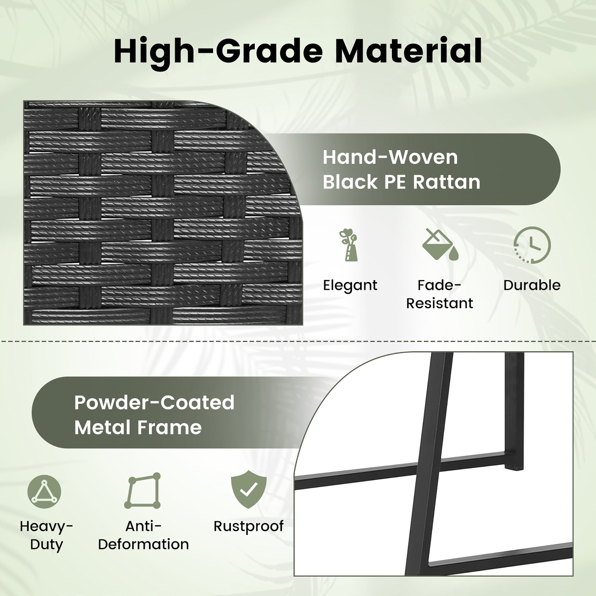 Enjoy endless comfort and ease on this 3-piece patio rattan chair set for outdoor relaxation. With curved backrest, the ergonomic rattan chair will make you fully relaxed. And the seat cushions with elastic sponge make the seat softer and more comfortable to sit. Also, both the chairs and table are super sturdy with heavy-duty metal frame. The powder-coated surface makes the main frame not easy to rust. Moreover, the rattan surface not only looks elegant, but also can withstand long-time outdoor use. And the maintenance is quite simple, as the cushion covers with zippers are easy to remove, and the tabletop is made of smooth tempered glass. If you love relaxing in outdoor places, this 3-piece patio set will be a good choice. Feature Comfortable to sit with ergonomic curved backrest and soft cushion Cushion cover is easy to maintain thanks to the zippers Solid and rustproof metal frame for high stability Hand-woven PE rattan is elegant and sturdy Compact but functional side table offers much convenience Tempered glass tabletop is simple to clean Non-slip footpads avoid scratches to the ground Suitable for backyard, front porch, backyard, etc. Simple to assemble with the detailed instruction Avoid rain exposure for long-lasting service life Specification Color of PE Rattan: Black Color of Cushion: Black Material: PE Rattan, Metal, Tempered Glass, Sponge, Polyester Dimension of Each Chair: 21” x 23” x 32” (L x W x H) Dimension of Coffee Table: 18” x 18” x 19” (L x W x H) Dimension of Each Cushion: 19” x 19” x 2” (L x W x Thickness) Seat Height: 16” Net Weight of Each Chair: 11 lbs Net Weight of Coffee Table: 9 lbs Weight Capacity of Each Chair: 400 lbs Weight Capacity of Coffee Table: 100 lbs Package Includes: 2 x Chairs 1 x Coffee Table 2 x Seat Cushions