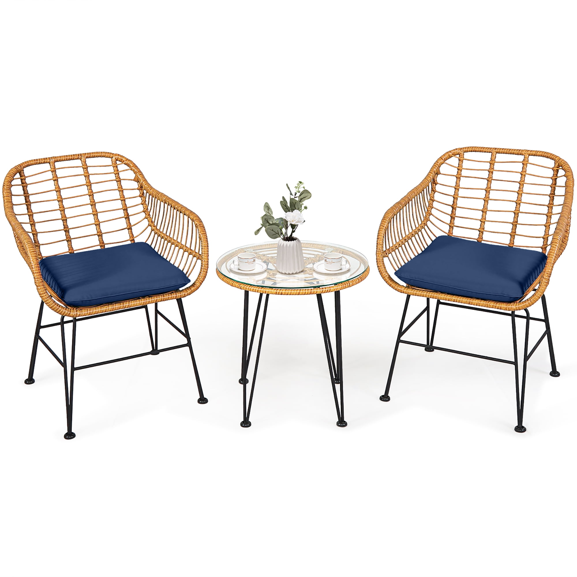Costway 3PCS Patio Rattan Bistro Furniture Set Cushioned Chair Table Navy