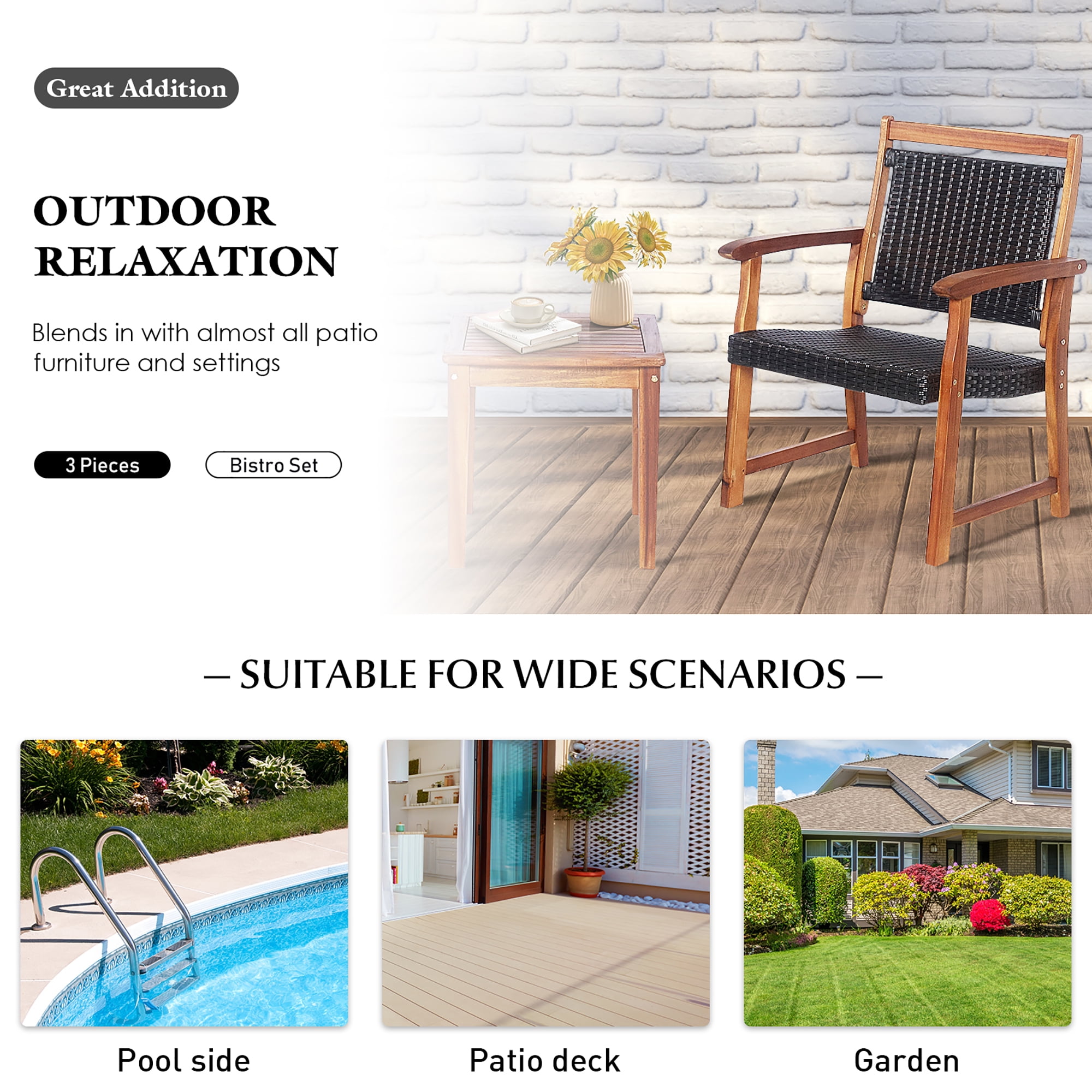 Acacia Wood Furniture Set: This patio bistro set chooses solid and tenacious acacia wood to build up a strong structure for its chairs and the table. Acquiring such a heavy-duty frame means this furniture set has a high strength to endure daily use and a large capacity to bear loading. All Season Wicker Surface: The chair has a wicker backrest and a rattan seat base, not only adding rustic allure into this patio furniture set but making the chair breathable and chilly to sit on. The weather-resistant wicker also enables the chair to stay outside for a longer time. It’s best not to put it outside in the rain Multiple-Scene Application: You can use this patio furniture set to decorate your outdoor settings, departing from dullness by gaining a few new elements. It will look great on your balcony, garden, deck, poolside to create an intimate spot and an eye-catching scene. Cozy 3-Piece Conversation: Our chair has a slow-sloped seat base to ensure comfortable and ergonomic seating. A high back design with armrests also elevates the coziness to the nex t level. It consists of 2 chairs and a side table for placing drinks and snacks. Easy to Assemble: Following the detailed instructions, you can quickly put a pile of labeled parts and accessories together and have a complete and brand-new patio conversation set. Chair dimension: 24.5” x 23” x 34” (W x D x H), table dimension: 18” x 18” x 18” (L x W x H).
