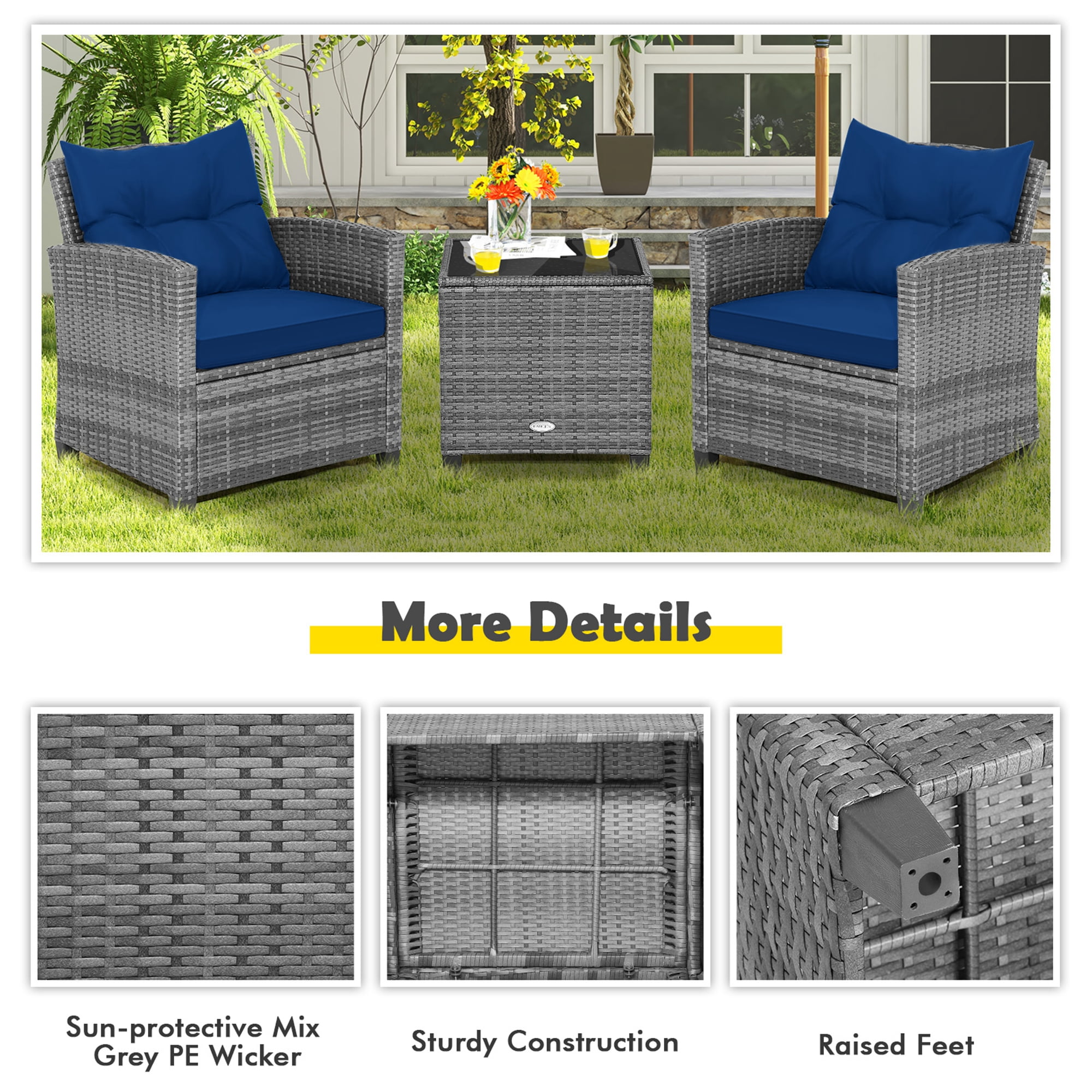 It’s time for outdoor relaxation with our 3-piece patio furniture set! The fade-resistant and sun-protective PE wicker as well as the anti-rust and sturdy metal frame make this outdoor conversation set fit the outdoor environment. Therefore, you can place this patio sofa set wherever you want. Then, the ergonomic chairs with soft padded cushions can’t wait to provide you with a comfy sitting experience for complete relaxation. And the tempered glass side table is convenient for you to put items on. Feature Fade-resistant and sun-protective mix grey PE wicker for outdoor durability Ensure strong stability with heavy-duty and rustproof metal frame Avoid direct contact with the ground thanks to the raised feet Soft cushions are padded with high-density sponge for maximum comfort If it rains, please take cushions back home to extend the service time Remove the seat cushion covers for easy cleaning Perfectly fit your body curve with ergonomic backrest and armrests Easy to access your needed items by using the side table Safe to use with premium 5 mm tempered glass tabletop Suitable for porch, balcony, garden, backyard and more Convenient to assemble Specification Color of PE Wicker: Mix Grey Color of Cushion: Navy Material: PE Wicker, Metal, Tempered Glass, Polyester, Sponge Overall Dimension of Table: 19.5” x 19.5” x 19.5” (L x W x H) Overall Dimension of Each Chair: 26.5” x 26.5” x 30” (L x W x H) Seat Height from the Ground: 13.5” Dimension of Each Seat Cushion: 21.5” x 19.5” x 3” (L x W x Thickness) Dimension of Each Back Cushion: 21.5” x 18.5” x 4.5” (L x W x Thickness) Net Weight of Table: 15 lbs Net Weight of Each Chair: 21 lbs Weight Capacity of Table: 165 lbs Weight Capacity of Each Chair: 400 lbs Package Includes: 1 x Table 2 x Chairs 2 x Seat Cushions 2 x Back Cushions 1 x Instruction