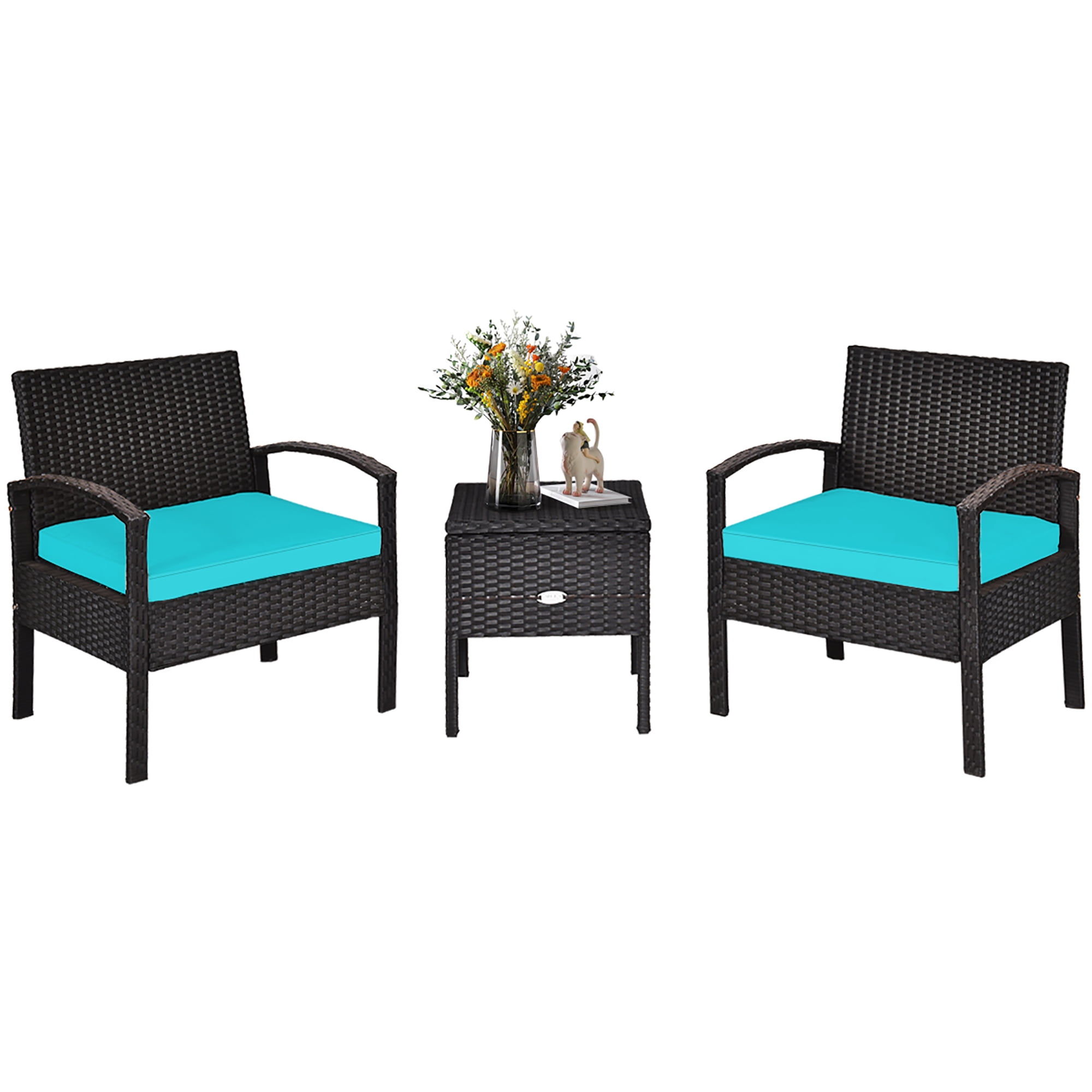 Costway 3PCS Patio Rattan Furniture Set Storage Table Cushioned Sofa Turquoise