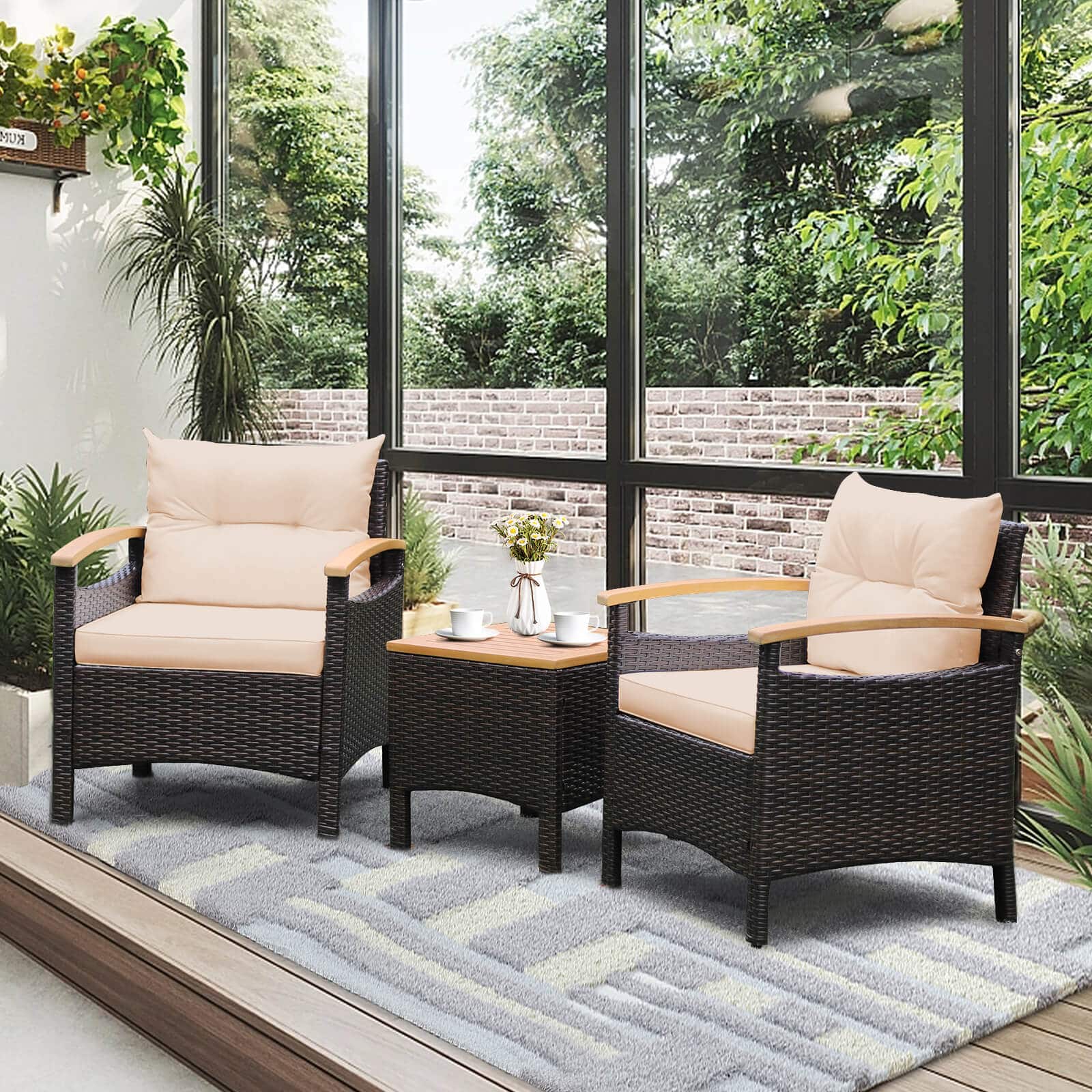 - Product Name: 3PCS Patio Rattan Furniture Set Wooden Armrest Table Top Cushioned Deck