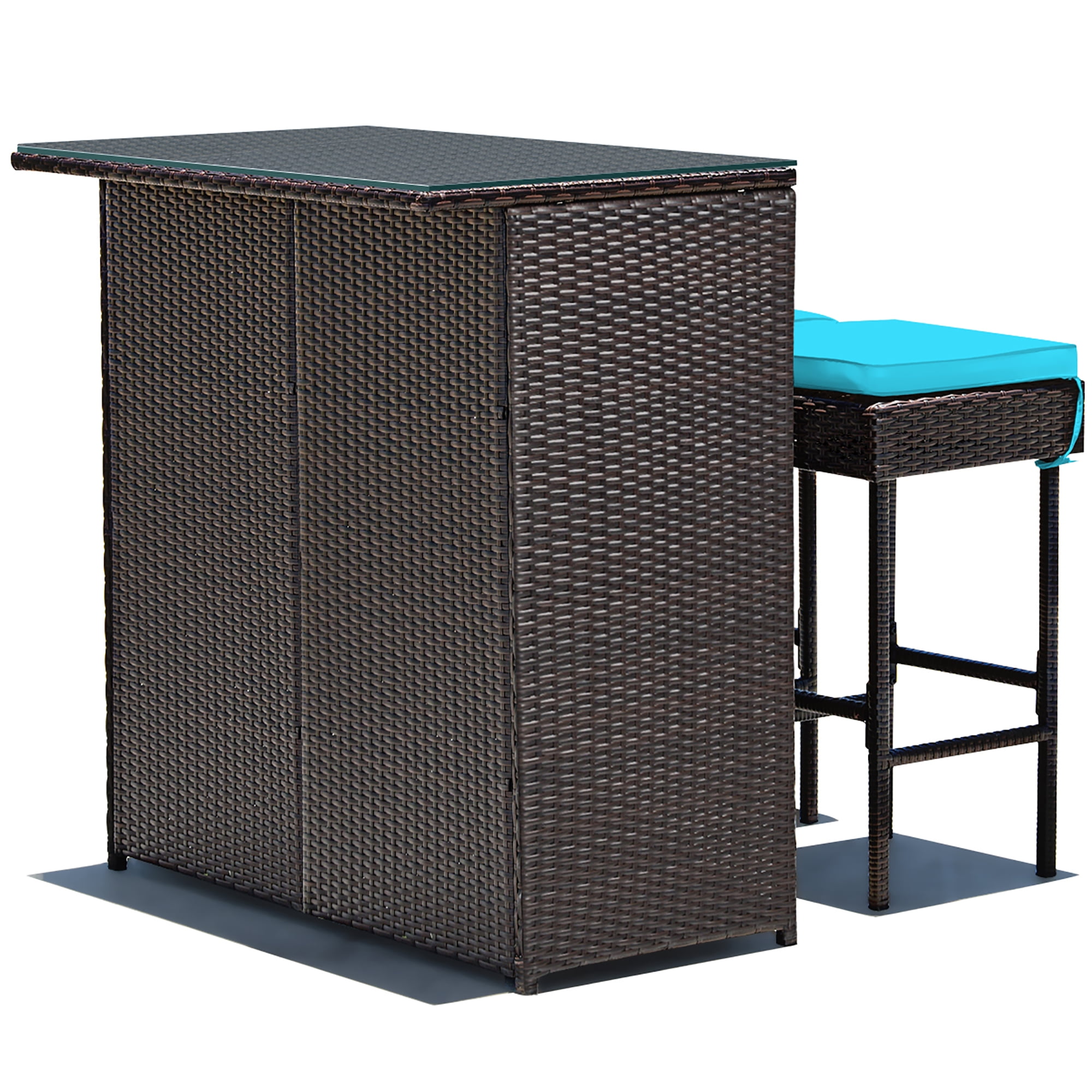 Costway 3PCS Patio Rattan Wicker Bar Table Stools Dining Set Cushioned Chairs Turquoise