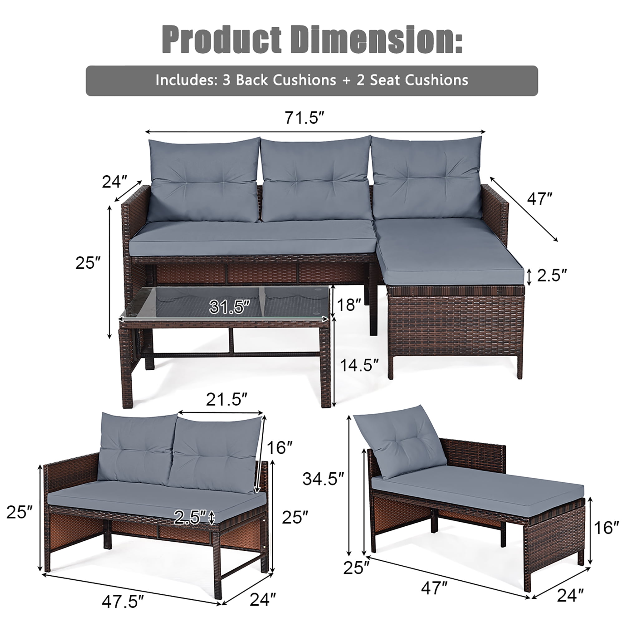 L-shape Corner Sectional Sofa: Designed in L-shape appearance, this outdoor rattan sectional sofa set fits any corner of your home, suitable for living room, garden, lawn and backyard. The curve of armrest on the both side with widen back cushions perfectly fits your body line, giving you the ultra comfort. Provides Ultra Comfort: Filled with premium sponge to stay fluffy and non-deformation, the attached cushions with breathable covers is skin-friendly and high-resilience, ensuring that you won’t get tired while sedentary and the cushion is built to last for long-term outdoor relaxation. Superior Sturdy Construction: Constructed of sturdy steel frame with cross bar supporting base and PE wicker, this patio wicker conversation set is sturdy and durable enough to hold up to 705 lbs. And the eco-friendly exquisite woven rattan can withstand the fluctuating weather and provides a breathable and comfortable zone to relax. Best Entertainment Party Site: Combing the elegance with simplicity, this patio sofa set with the coffee table is available for 3-4 friends comfortably with a glass table to hold food and drinks. Preserving the best part of the nature, this patio furniture set allows you to find the best entertainment site in the middle of the crowd and busy city. Size of Sofa Set: Includes a loveseat sofa, a corner lounge sofa, a coffee table with tempered glass top, three back cushions and two seat cushions. Weight capacity of sofa set: 705 lbs; weight capacity of coffee table: 110 lbs; loveseat sofa dimension: 47.5”x 24”x25” (Lx W x H); corner lounge sofa dimension: 47”x24”x25” (Lx W x H); coffee table dimension: 31.5”x18”x14.5” (Lx W x H)