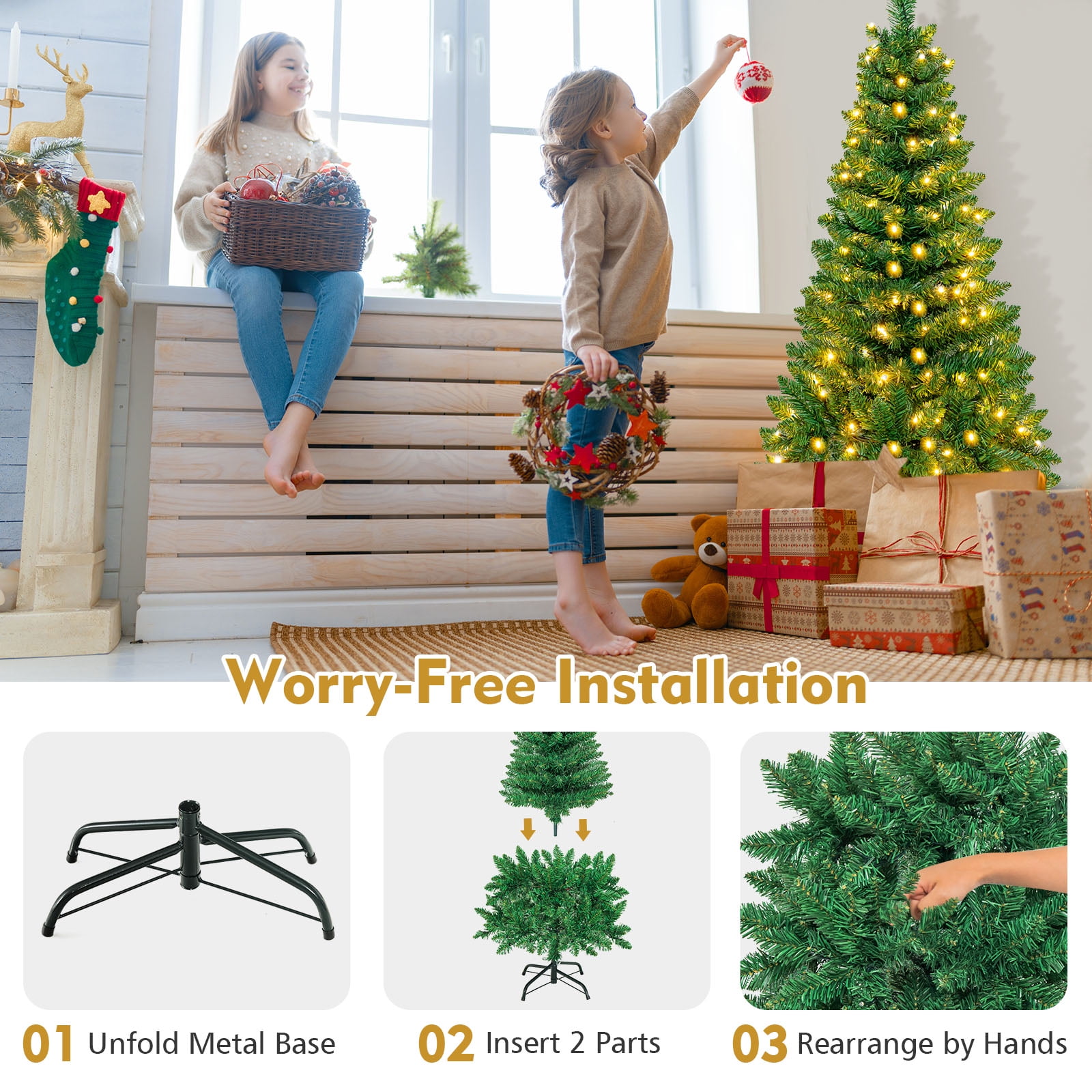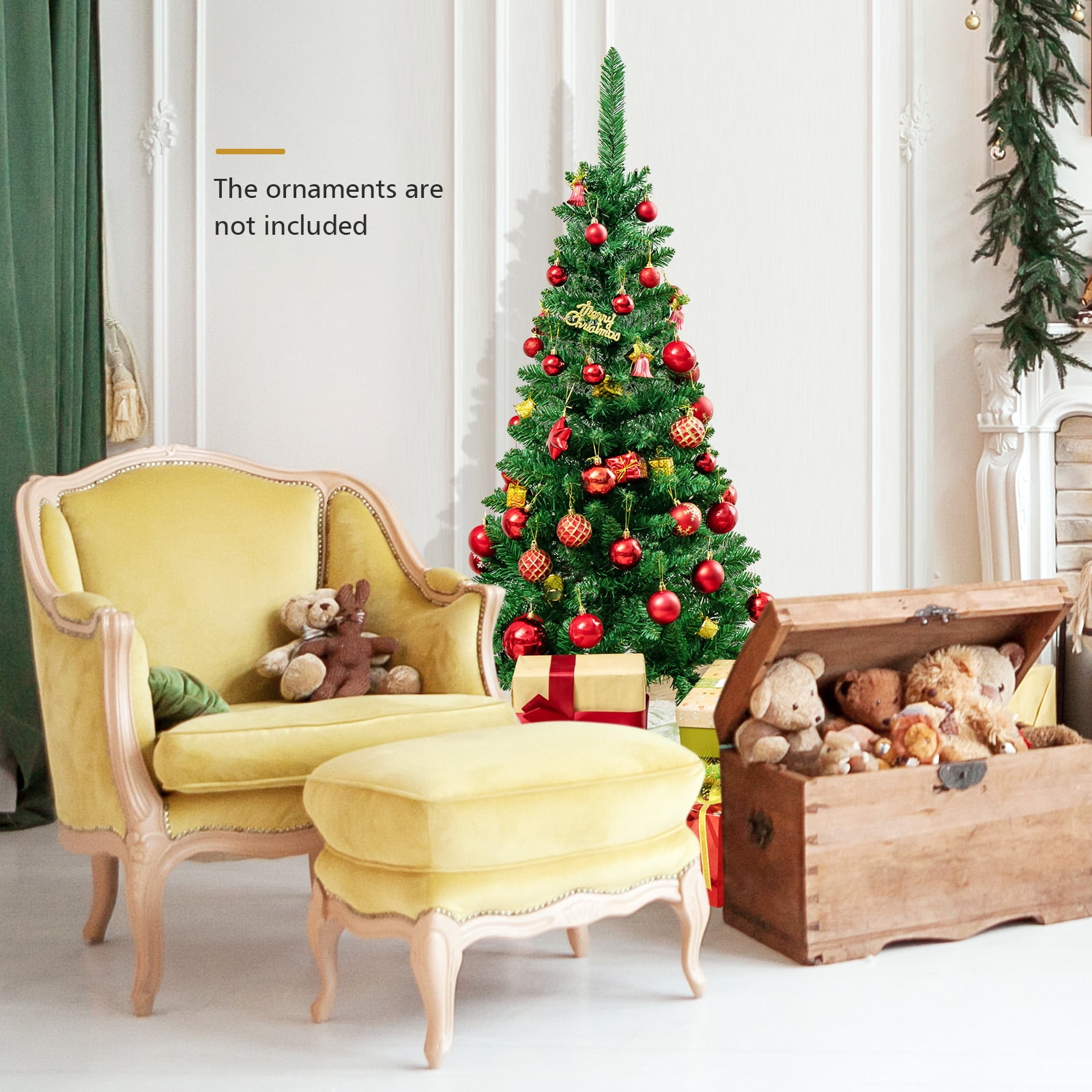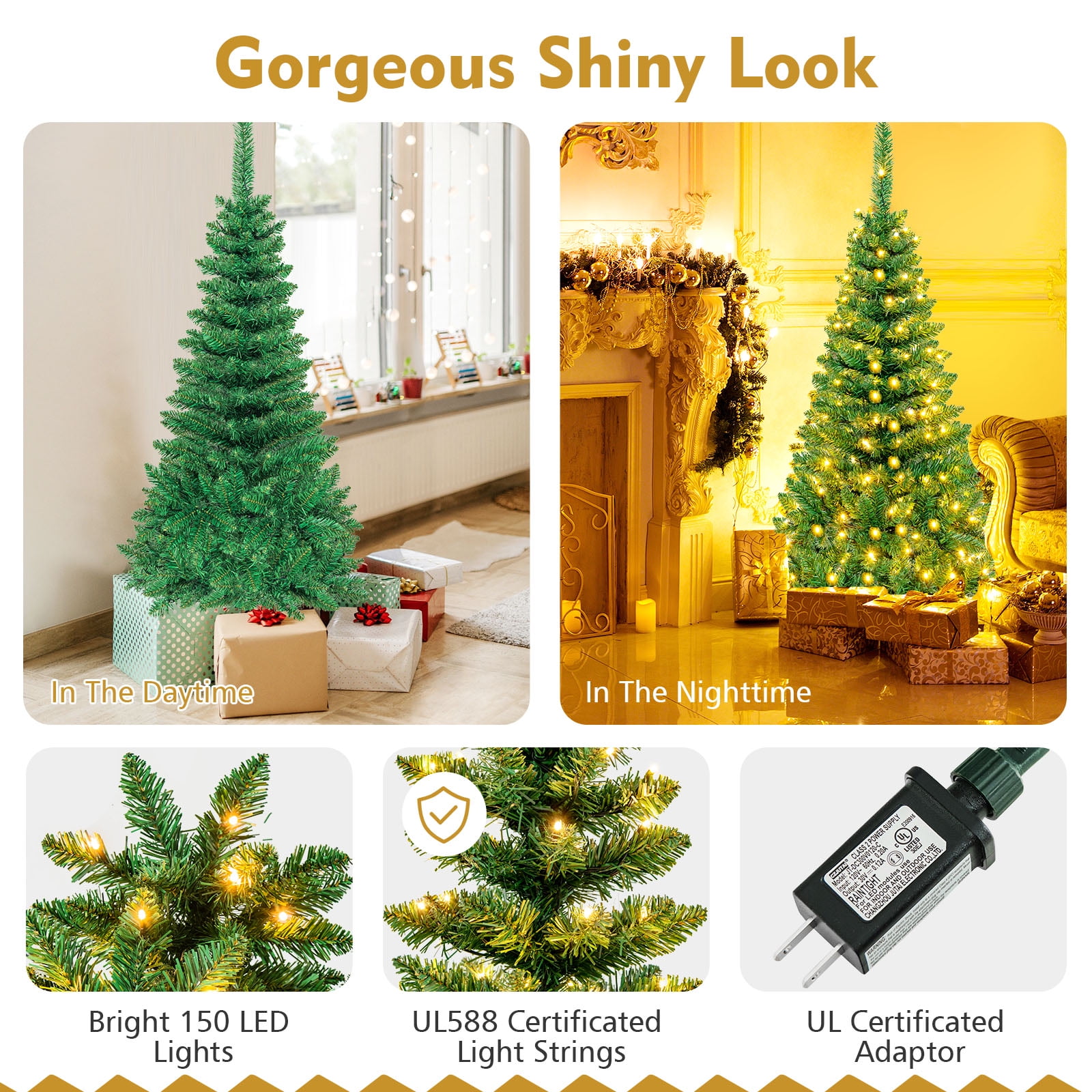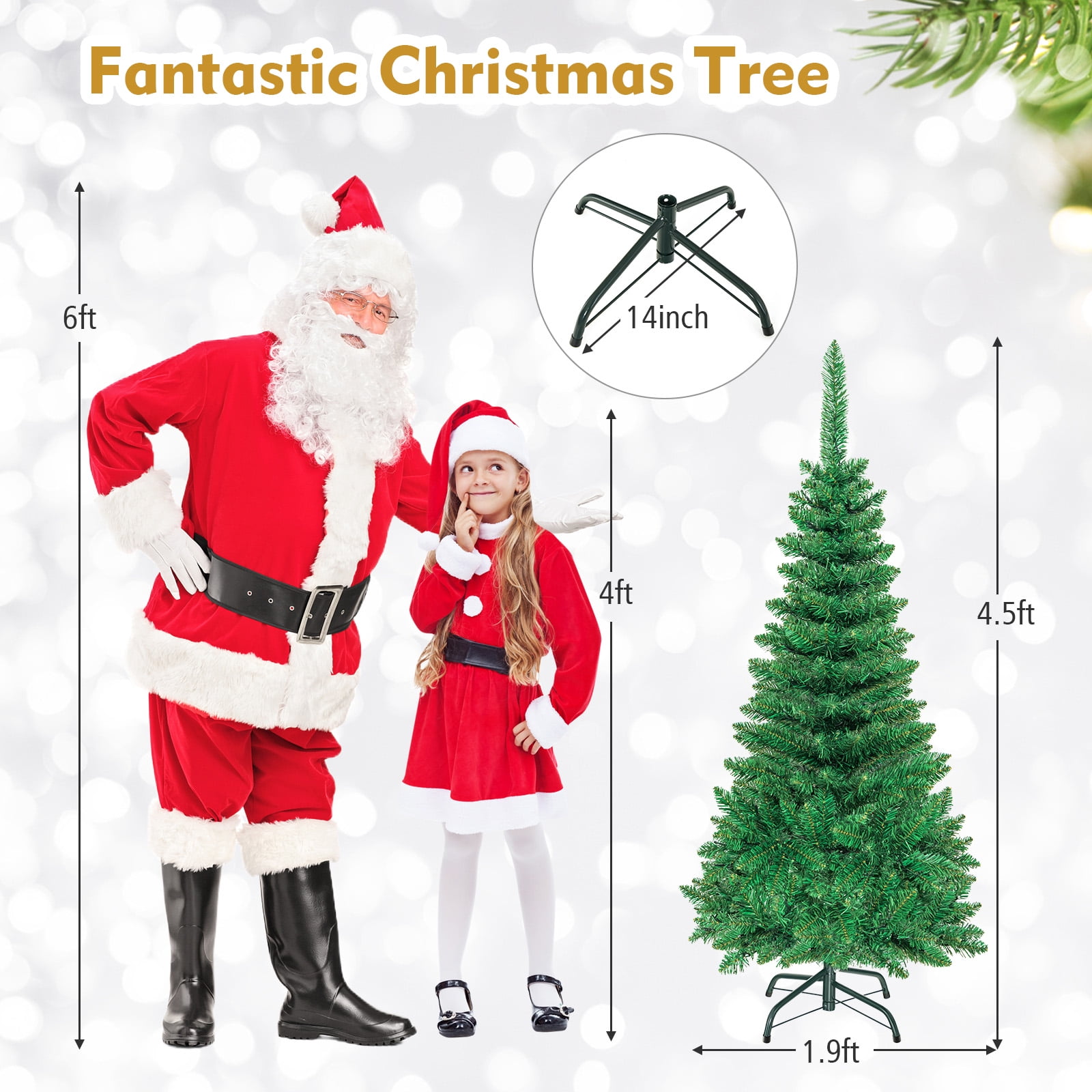 This is our 4.5 ft pre-lit pencil Christmas tree which is designed with 226 branch tips to offer a realistic and lush appearance. Pre-installed with 150 warm white LED lights, the slim tree saves you the hassle of hanging up the lights and help light up your room. It is effortless to make the tree fluff due to its hinged construction, while also facilitating its assemble and storage. Foldable X-shaped iron stand with foot pads prevents breakage and enhances the balance of the tree, offering stability to keep the wondrous tree standing all year around. Whether for your home, courtyard, or for commercial places like shops, hotels, the slim Christmas pencil tree is the perfect eye-catching decoration to add multiple fun and festive holiday fullness! Feature Pre-installed with 150 warm white LED lights for brilliant shine Slim pencil shape design takes up less space, ideal for any narrow place Crafted with 226 branch tips for leafy and realistic appearance Non-flammable and eco-friendly PVC material, not easily deformed All hinged construction convenient for assembly and storage Separated into 2 sections, easy to be placed in a tree storage bag X-shaped metal stand, wear and breakage resistant, offer more stability Foot pads effectively protect floors from scratching Simple style with plenty of space to hang ornaments as you like Eye-catching addition for homes, office, shops and other business places Match any style of room, add a rich Christmas atmosphere to you UL588 certified transformer for safer use Specification Color: green Main Material: PVC, iron Overall Dimensions: 1.9’x4.5’H Number of Tips: 226 tips Number of Lights: 150 Net Weight: about 5 Lbs Package Includes: 1xpre-lit Christmas tree 1xstand 1xadapter
