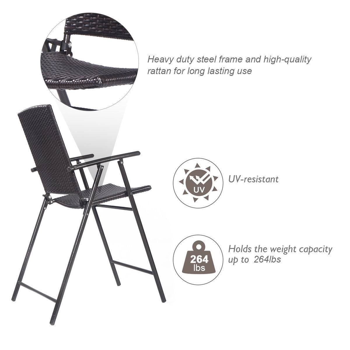 These four pieces folding rattan chair are ideal for your family/friends gathering, party, outdoor camping and other gathering activities. Made of steel frame, these rattan chair are high quality and can serve your a long time. Footrest and armrest make you feel extreme comfortable when you seating on it. With the feature of folding, these 4 rattan chair are saving space for storing, and they are also easy to transport, so you can take them with you for your camping activity. Do not hesitate to buy one! Feature 4 pieces brown rattan folding bar stool chair Steel frame, sturdy and durable PE rattan material, lightweight and comfortable Folding feature, easy and simple to store or transport With footrest and armrest Perfect for family gathering, party and outdoor camping No assemble need Distance from seat to floor:24.4” Distance from armrest to floor:31.5” Weight of each chair:11lbs Specification Material:rattan and steel Size of chair:26.0”x22.4”x42.5”(LxWxH) Size of seat:17.7”x15.7”(LxW);Size of back:20.8×17.7”(LxW)Seat height:24.0″ Height from armrest to ground:31.5″ Weight of each chair:11lbs