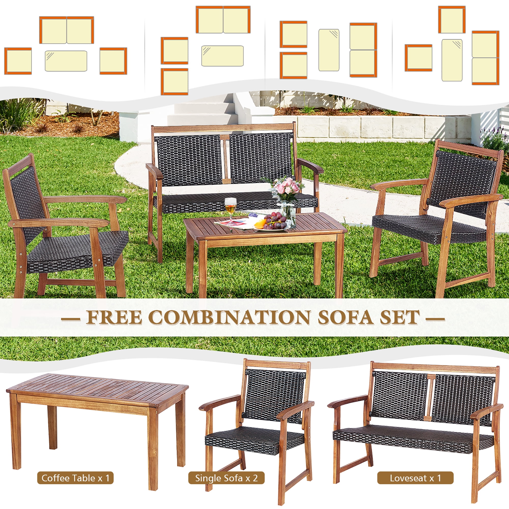 Costway 4 PCS Patio Rattan Furniture Set Acacia Wood Frame Sofa Loveseat Garden