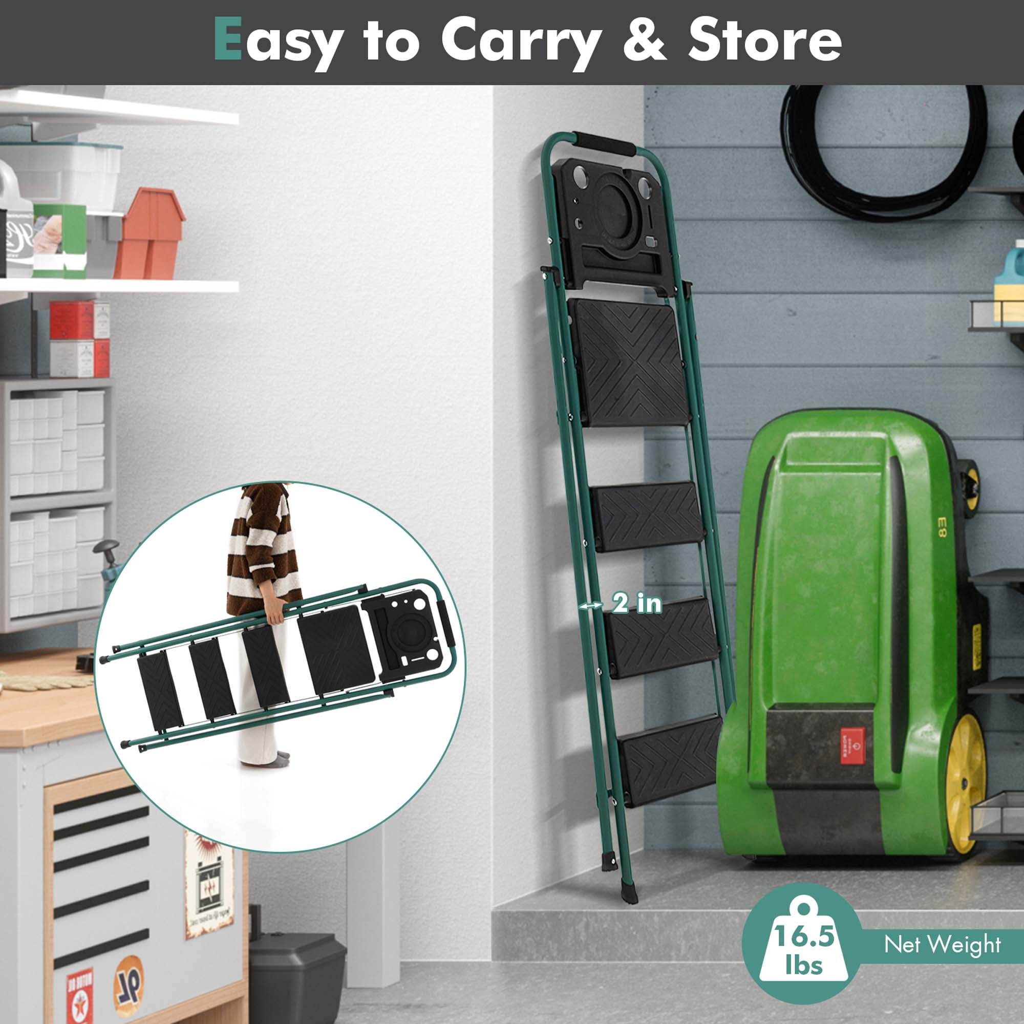 This 4-step folding ladder will bring more convenience to your daily life. With anti-slip pedals, handgrip and footpads, the ladder is of high-level safety, so you can use it at ease. And the heavy-duty metal structure ensures strong support and long-lasting service life. Moreover, the folding and portable design allows for space-saving storage and effortless carrying. And the tool tray on the top makes all the tools you want easy to fetch. This step ladder is also perfect as a storage shelf, satisfying your different demands. Feature Reinforced metal structure for high stability Each step can load up to 330 lbs Enhance safety design with anti-slip pedals, handgrip and footpads Equipped with a tool tray for more convenience Can be quickly folded to save space when not in use Easy to carry with 16.5 lbs light weight Help you solve multiple daily problems Specification Color: Silver, Black Material: Steel, PP Overall Dimension: 20” x 36” x 61.5” (L x W x H) Folding Size: 20” x 3” x 67.5” (L x W x H) Net Weight: 18.5 lbs Weight Capacity of Each Step: 330 lbs Weight Capacity of Tool Tray: 11 lbs Package Includes: 1 x 4-Step Ladder 1 x Instruction