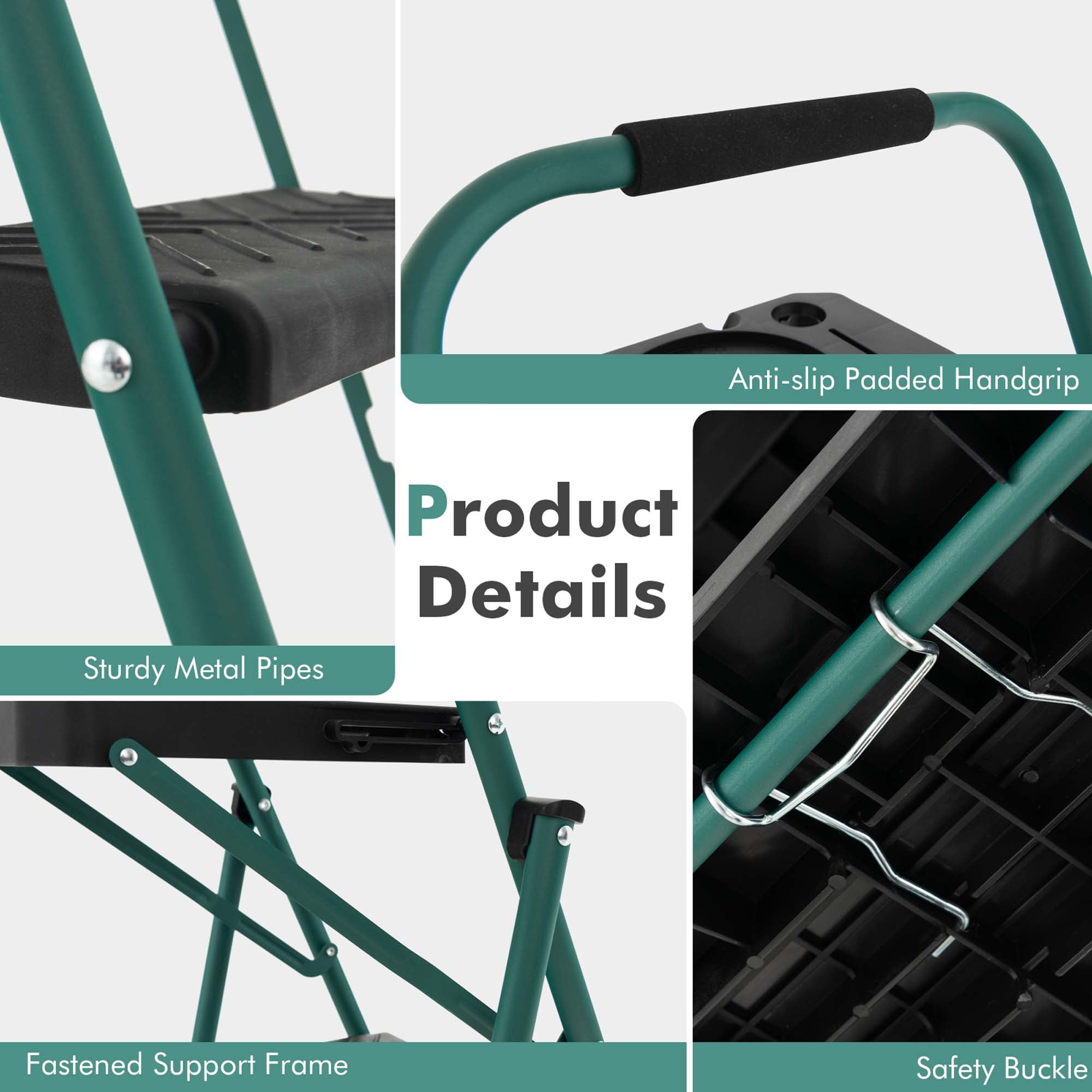 【Reinforced Metal Frame】Constructed of sturdy metal pipes, the main frame of the ladder ensures strong load capacity. Each step can load up to 330 lbs. Moreover, the fastened support frame and stable triangle structure improve the overall sturdiness. 【Use with High Safety】The 13.5 in widened pedals with anti-skid texture enables you to stand stably on the ladder. What’s more, the non-slip rubber feet avoid any wobbling and protect the floor from scratches. And anti-slip padded handgrip is firm and comfortable to grip. 【Functional Tool Tray】This 4-step ladder is designed with a convenient tool tray for fetching tools easily. Such a unique design highly improves your working efficiency. Note: weight capacity of tool tray is only 11 lbs. Please do not step on it. 【Convenient Folding Design】When not in use, the ladder can be quickly folded. The compact folding size and 16.5 lbs net weight make the ladder easy to carry and store. When expanded, the ladder can be firmly fixed by the safety buckle. 【Versatile Ladder】This 4-step folding ladder with functional tool tray will be a perfect solution for daily problems. It will help you a lot if you want to clean windows, change bulbs or fetch things from high place. The ladder is also ideal to be used as a storage shelf.