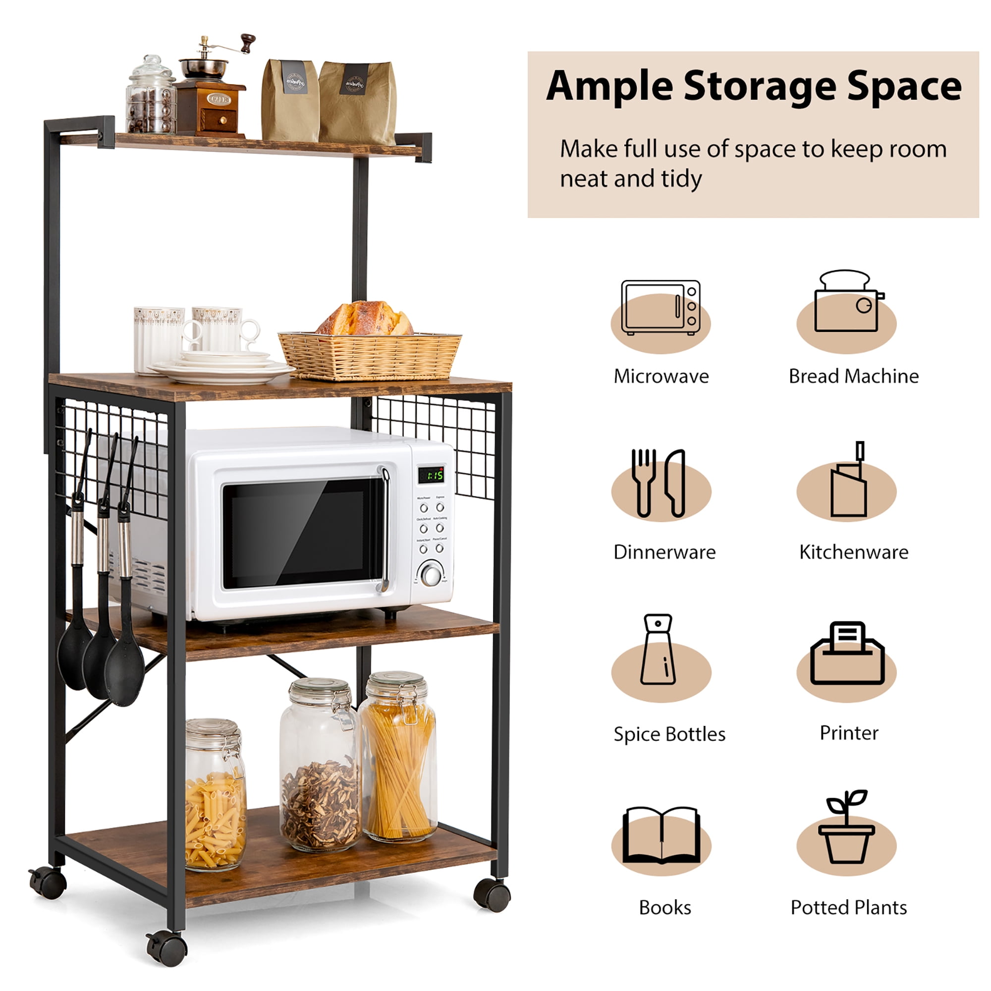 Ample Storage Space: Designed with 4 layers of spacious shelves, this kitchen baker’s rack provides you with sufficient space to accommodate various items, such as kitchenware, dinnerware, microwave, spice bottles and more. In addition, 3 hooks are ideal for hanging cloth, oven gloves, wire whisks, etc. Sturdy Construction: Made of sturdy engineered wood and thickened steel pipes with power-coated surface, this freestanding kitchen storage rack is solid and rustproof for long-lasting use. Besides, the x-shaped reinforced bars greatly enhance the stability of the overall structure. Multifunctional Design: Featuring industrial style and great practicability, this 4-tier utility cart is a timeless addition to your kitchen, dining room, study, living room, balcony and other places. You can use it as a kitchen shelves, printer stand, plant stand, display rack, etc. Easy Movement: Thanks to the 4 smooth universal wheels, you can effortlessly move this freestanding storage rack from one place to another without scratching the floor. At the same time, two of them are equipped with brakes which prevent sliding and increase stability. Quick Assembly & Simple Maintenance: With the help of the detailed instruction and complete accessories, you can install the kitchen baker’s rack in a short time. What’s more, the smooth and waterproof surface makes cleaning a breeze, saving you a lot of time and energy.