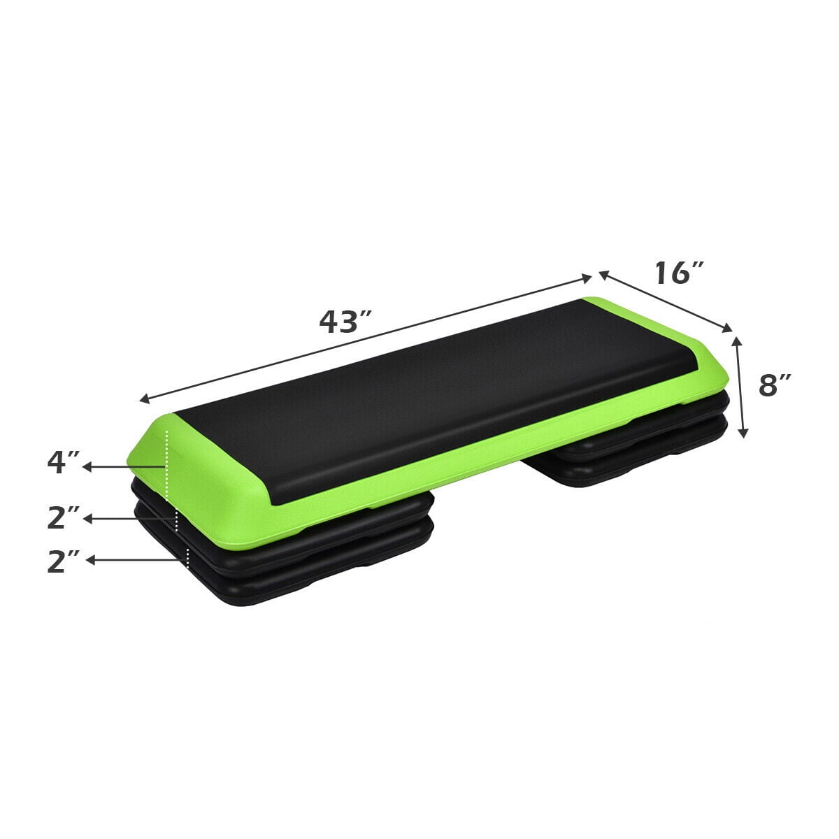Costway 43.5″ x 16″ Adjustable Green Step Platform Heavy-duty platform designed for durability Convenient for storage and easy to transport Lightweight construction for effortless carrying and assembly Adjustable height options: 4.3″, 6.3″, and 8.3″ for versatile workout levels Supports a weight capacity of up to 550 lbs