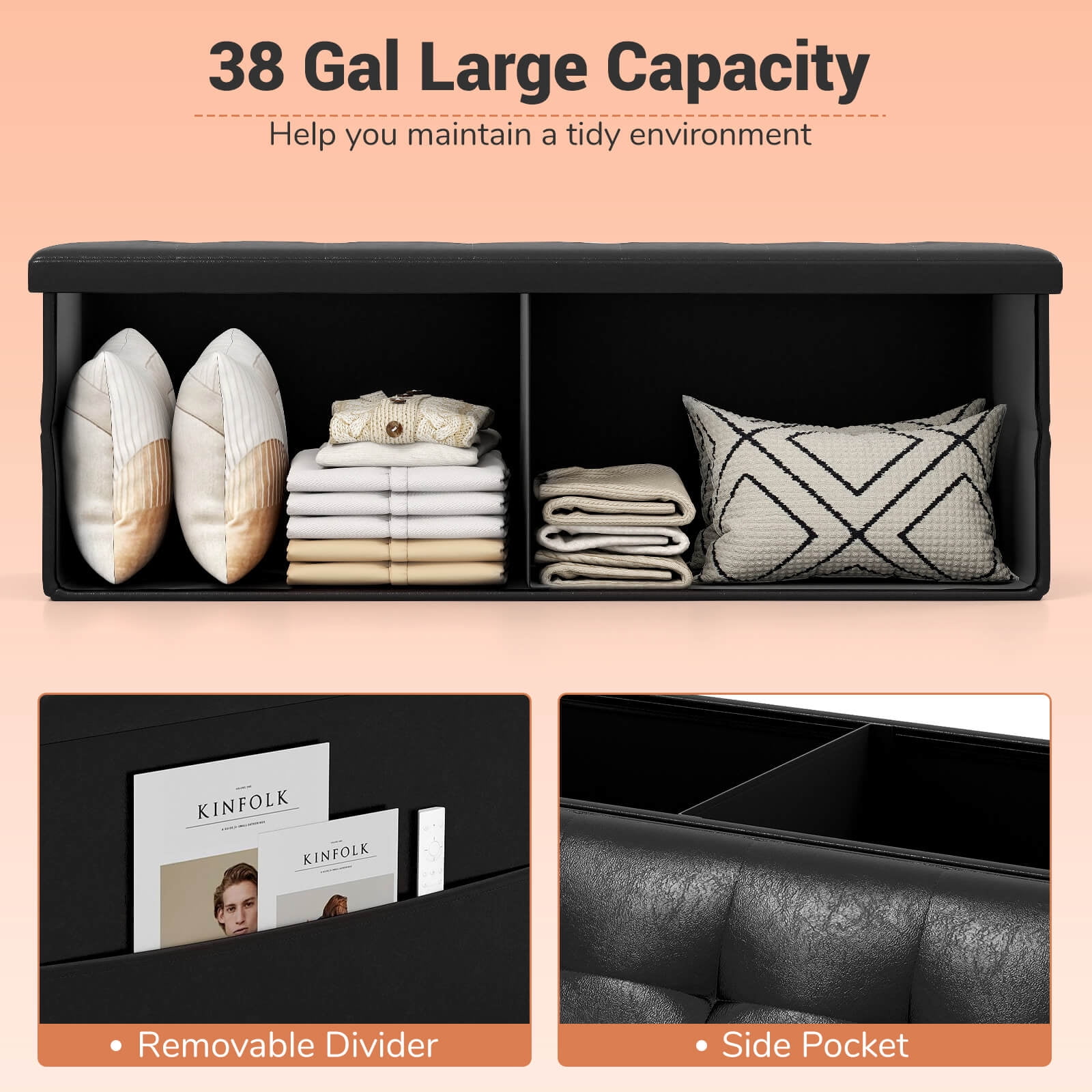 Functional Foldable design(Sides fold down for saving space ) Cushioned top seat for delicate and comfortable seat Material:PVC leather, high density board,sponge Overall Size:45”X15”X15”(LXWXH) Maximum Weight:660 Lbs