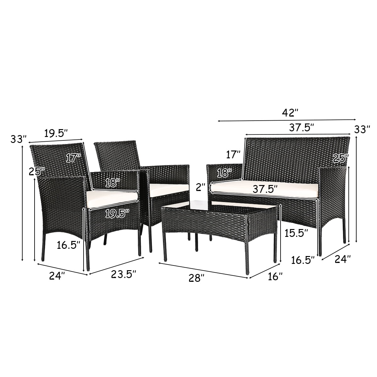 All-weather & Sturdy Construction: Made of the weather-resistant PE rattan, this patio set is waterproof and sun-resistant for long term use. Besides, the reinforcement structure ensures that the set has excellent load-bearing capacity to maintain stability. Also, the table with tempered glass top is sturdy and solid to hold many items. User-friendly Design for Ultimate Comfort:The outdoor furniture set comes with 3 seat cushions, which filled with premium sponge and covered by breathable polyester fabric. Meanwhile, the chairs have ergonomic backrests and armrests, allowing you to relax completely and enjoy a comfortable use experience. 4 Pieces Patio Furniture Set: This furniture set includes 2 single chairs, 1 loveseat and a coffee table. 2 portable chairs can be easily moved to any place for use. And the wide loveseat offers ample space for two people to sit. Most importantly, it can be combined in a variety of ways to meet your different needs. Modern Design for Wide Application: The black patio set is in a classical and modern style, which can be a great addition in any outdoor space. The chairs provide enough seat for you and your family or friends to enjoy the outdoor leisure time. And the set is ideal for placing in your backyard, garden, balcony or poolside. Dimension of Patio Furniture Set: Table size: 28” x 16” x 15.5” (L X W X H), single chair size: 24” x 23.5” x 33” (L X W X H), loveseat size: 42” x 24” x 33” (L X W X H), height from floor to seat: 16.5”, height from floor to armrest: 25”, thickness of cushion: 2”, table weight capacity: 170lbs, single chair weight capacity: 400lbs, loveseat weight capacity:800lbs