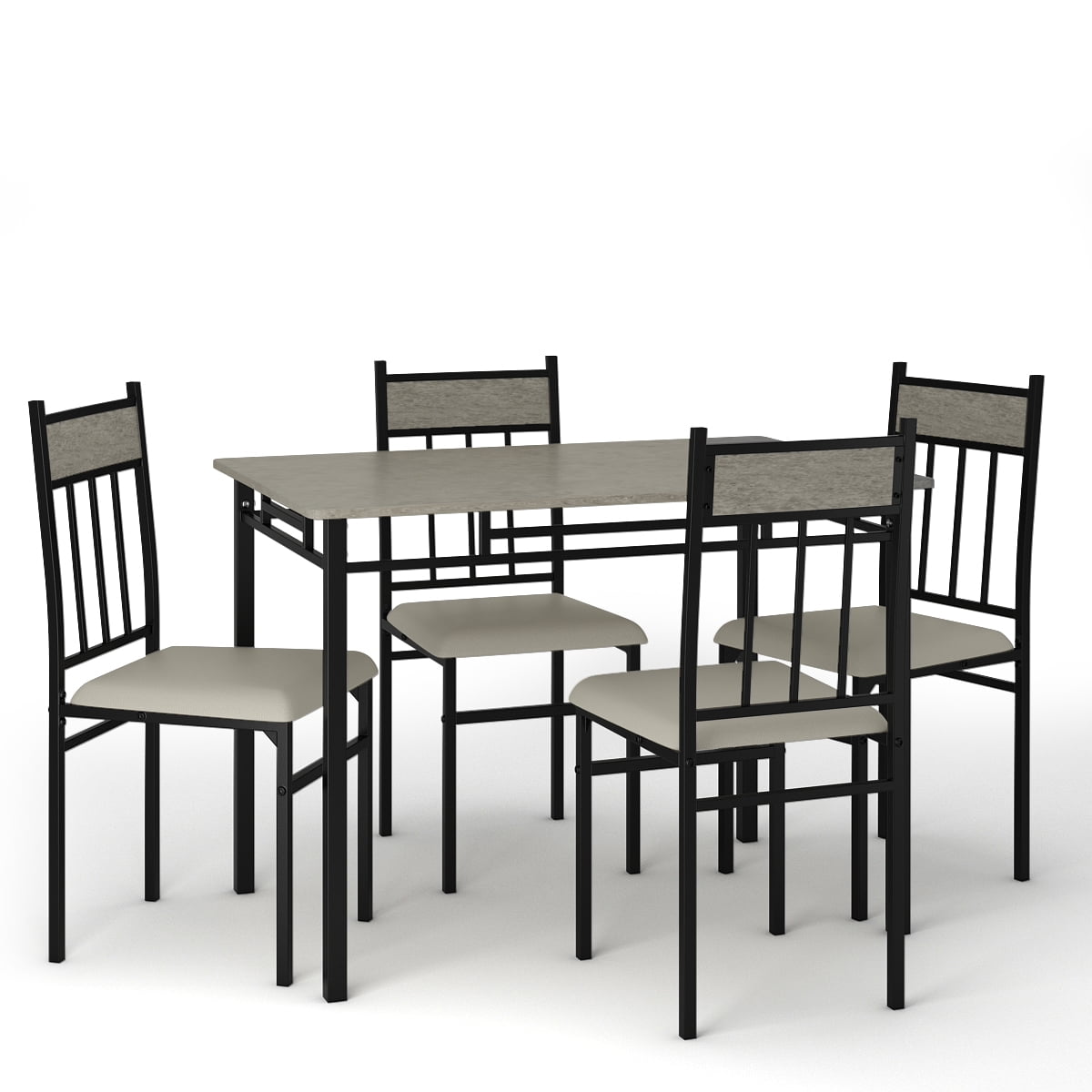 This Is Our Modern And Beautiful Dining Table& Chairs Set Which Is Simple And Generous In Appearance. It Will Be A Great Decoration For Your Living Room. With The Sturdy Steel Table Frame And A Faux Marble Top, This Dining Table Is Rugged Enough To Withstand Years Of Use. And It Comes With 4 Pcs Dining Chairs Which Has Upholstered Seats For Comfortable Use. Don’t Hesitate To Buy It! Display Video: Feature Modern And Upscale Furniture Sturdy And sturdy For Years Of Use Upholstered seat, comfortable to sit Made with black powder-coated metal MDF with Marble PVC Cover table top, Smooth And Beautiful Easy To Clean Simple Assemble Need And All The Hardware Included Specification Chair Material:MDF table board + PVC tabletop+ Steel tube Seat Material: Flaxen Cloth Cover+ Steel tube Table dimension: 42”×27.5”×30”(L×W×H) Chair dimension: 15.5”×18”×35.5”(L×W×H) Weight Capacity of table:220 lbs Weight Capacity of each chair:220lbs Package Includes: 1 x Dining Table; 4 x Chairs
