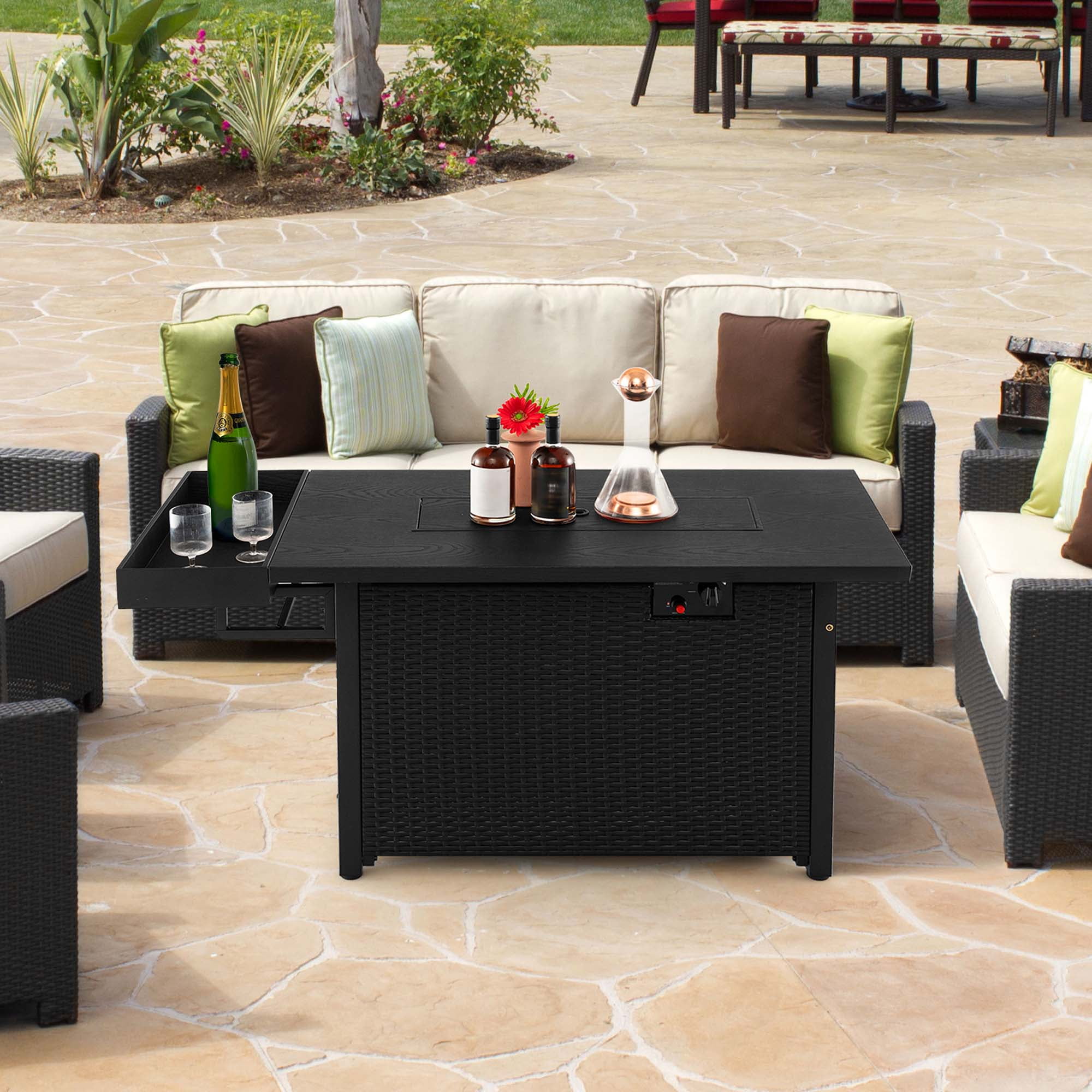 Embrace the warmth and ambiance with our 52 inches outdoor propane gas fire pit table! Even in the chilling winter, you can hold outdoor gatherings thanks to the 50,000 BTU heat output, which provides a warm and inviting flame that will keep you and your guests cozy all night long. The tempered glass wind guard provides added safety, preventing accidental fire mishaps while keeping the flame steadily burning. And the included blue glass stones not only add a touch of elegance but also enhance the overall look of your fire pit. In addition, the pull-out door allows you to keep your propane tank neatly stored away, ensuring a clutter-free outdoor space. When it comes to the summer, this propane heater can be used as an extra coffee table. The large rectangular tabletop and side storage shelf accommodate different items with ease. No matter when you use this functional gas firepit table, the colorfast PE wicker and rustproof metal frame will always promise higher durability and strong stability. To top it all off, we provide a waterproof cover, ensuring that your investment is always protected from rain, snow and other harsh weather conditions. Note: 1) Please do not completely cover the stainless steel burner with glass stones. 2) Please wait for the stainless steel burner to cool down and cover it with a waterproof cover. 3) Match the standard 20 lbs propane tank (not included). Feature Bring you ample warmth with 50,000 BTU heat output CSA certified stainless steel burner for safe protection Simple ignition system for easy operation Adjust the flame in low or high position for customized warmth Can be used as an extra coffee table with removable lid Easy access to the tank thanks to the pull-out door with casters The fixing latch avoids accidental door opening Tank seat with adjustable knob for great convenience Work with standard 20 lbs tank (not included) Side open shelf for additional storage space Maintain a steady flame with tempered glass wind guard The blue glass stones offer a mesmerizing visual display Just leave it outdoors without worry thanks to the waterproof cover Selected PE wicker for fade resistance and sun protection Rustproof and sturdy metal frame for durability and stability Blend outdoors seamlessly with wood-like tabletop Cut-out handle and adjustable foot pads for more details Specification Color: Black Material: PE Rattan, Metal, Stainless Steel, Tempered Glass Overall Dimension: 52” x 24” x 25” (L x W x H) Dimension of Wind Guard: 25.5” x 10” x 6” (L x W x H) Net Weight: 68 lbs Output: 50,000 BTU Weight Capacity of Tabletop: 110 lbs Weight Capacity of Side Shelf: 22 lbs Package Includes: 1 x Propane Fire Pit Table 1 x Wind Guard 1 x Bag of Glass Stones 1 x Protective Cover 1 x Instruction