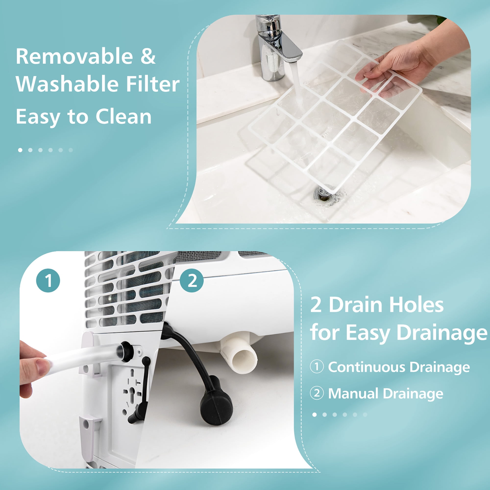 3 in 1 Design & 3-Color Light: This portable air conditioner features 3 working modes: cooling, dehumidifying and fan. What’s more, the 3-color indicator light can clearly show the current working state of the AC unit: blue light (cooling), white light (fan), green light (dehumidifying). Efficient & Large-area Cooling: This portable air conditioner with a high cooling capacity of 8000 BTU can cool down a wide area of up to250 sq.ft quickly. Besides, equipped with adjustable air louvers, this AC unit will deliver cool air to every corner of the room. Enjoy Peaceful Sleep & Clean Air: The ultra quiet operation and sleep mode can let you have a good sleep. And the 1-24H timer allows you to set the auto shut off time. In addition, this portable air conditioner comes with a removable & washable filter, which is easy to clean. Easy Operation & Flexible Installation: Through the smart LED touch panel & remote control, you can adjust and check all the settings with ease, like the speed, up, down, timer, mode, power, etc. Plus, this portable AC unit is easy to install and fits vertical sliding windows or horizontal sliding windows. Compact Size & Thoughtful Design: Equipped with 2 built-in handles and 4 universal wheels, this compact AC can be easily moved from room to room. Moreover, there is a wrapping post to keep the power cord organized and 2 drainage options for you to choose: continuous drainage or manual drainage.