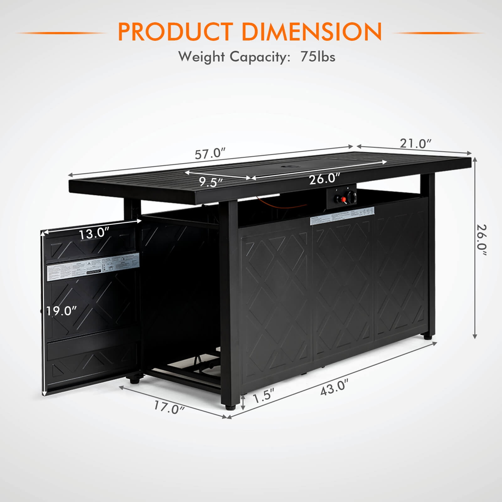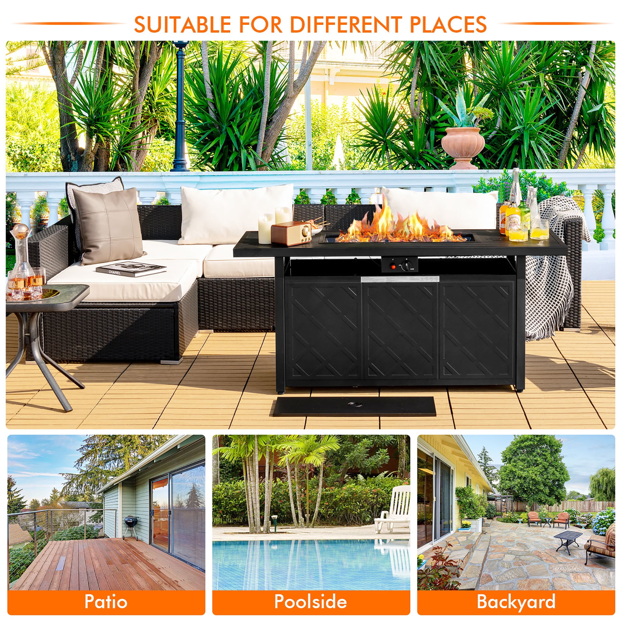 Multifunctional Fire Pit Table: This practical fire pit table can be used as an indoor dining table or coffee table by simply covering the burner with the included Lid. In addition, you can remove the lid to spend a warm outdoor party time with your family and friends. Simple & Healthy Use: The auto-Ignition device provides simple and convenient control during ignition. And the access door with a handle allows you to change a 20lb gas tank (not included) easily. There is a fix ing hoop for keeping the gas tank firmly. Therefore, you can enjoy a smokeless and ash-less heating ex perience. 50000 BTU Heat Output: Designed with a H-style stainless steel burner, our gas fire pit table features 50,000 BTU heat output, giving you enough heat to warm you up on cool autumns and winters. With CSA certification, you can use this gas fire pit with confidence. Fashion & Modern Design: This 57’’ outdoor fire pit table with unique slat design and clean lines is a perfect choice for most family to decorate outdoor space like backyard, garden,courtyard balcony. The powder-coated surface is rust resistant, and adjustable feet fit uneven ground for outdoor enjoyment. Easy to Assemble & Maintain: All necessary hardware and clear instructions are included for easy assembly. Besides, the package includes fire pit table with lid and a range of volcanic rocks. The base of this fire pit table cleverly hides a propane tank (not included) for space-saving.