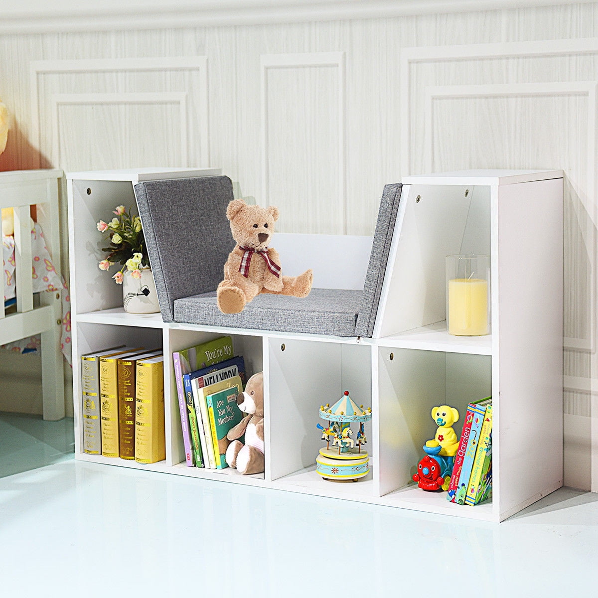 Our Bookcase with Reading Nook gives kids a sturdy spot to read their favorite stories. This fun furniture piece has plenty of storage space, gives a cute and fun way to keep toys, books and artworks organized. The versatile bench design with a comfortable cushion makes it an ideal seating area. And it’s made from high-quality particle board, environmental, safe and durable. Such a nice bookcase, worth buying Assembly Video: Feature Made of high-quality particle board, environmental-friendly, safe and durable Can be widely used for storing books, magazine, toys, photo frames, flower vase, decorations, souvenir and other household items, making your room tidy and clean It has a reading nook with a comfortable cushion, perfect for both kids and adults to read or write, easy and convenient. Very easy to assemble with included screws and the tool, no need any special installing experience. Modern and simple style, fashionable and exquisite design, with excellent quality and fine workmanship. Perfect for using in your home living room, bedroom, study room, office and so on Specification Material: PB Particle Board Color: White Numbers of Storage Grids: 6 grids Whole Size(L x W x H):40.5 x 12 x 25inch Reading Nook Size(L x W): 17 x 11.5 inch Weight: 41Ibs Weight capacity : 110lbs Package Included: 1 x Wooden Storage Bookcase 3 x Cushions