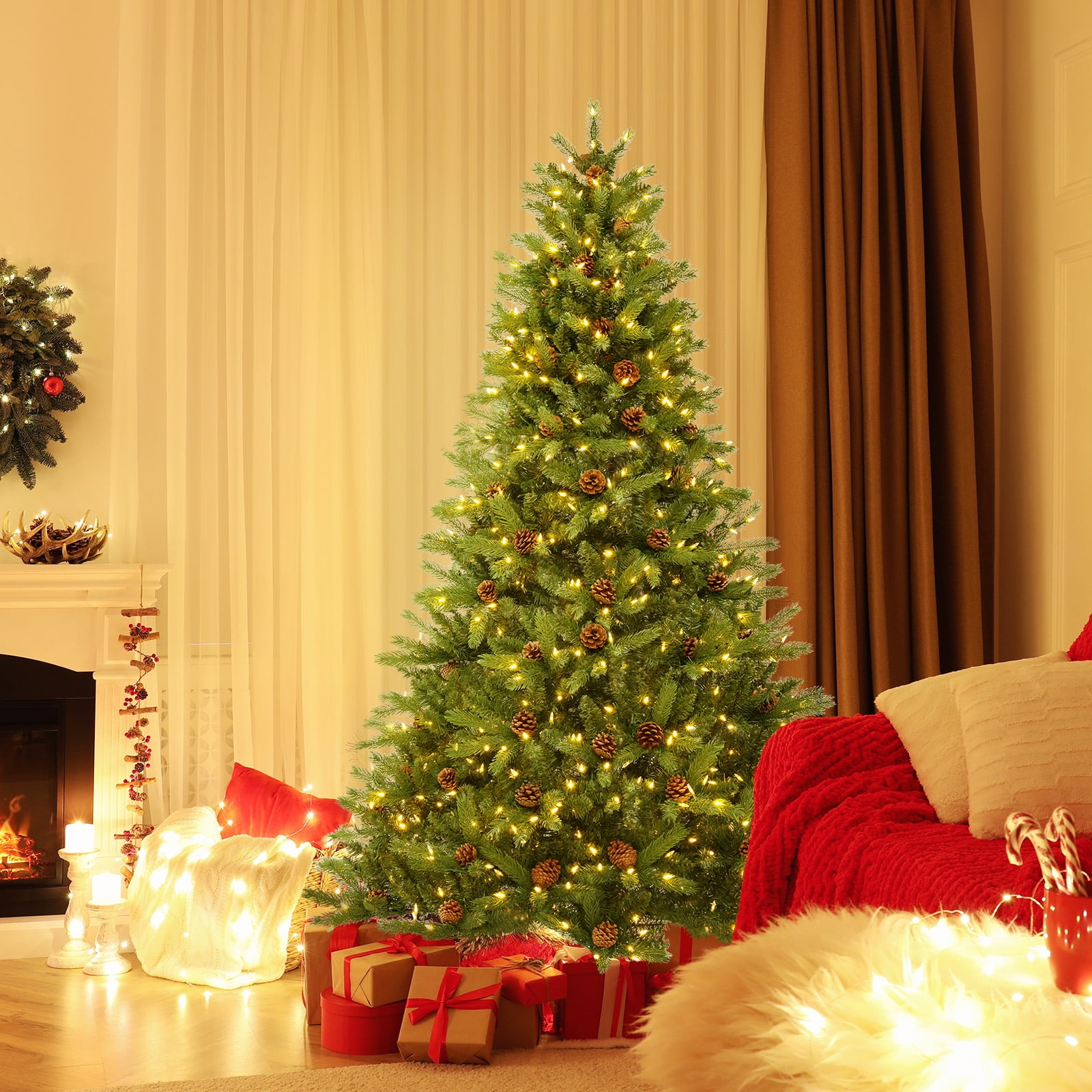Lush Leaves & Pine Cones: For high simulation, the 6 ft Xmas tree boasts up to 944 vivid branch tips & 74 adorable pine cones. Besides, all leaves are crafted of superior PE & PVC, intending to gain better resistance to fire, allergies & fading, which is ideal to serve for a longer time. Multifunctional LED Lights: The Christmas tree has 470 teardrop-shaped LED lights, so they can emit warm white lighting to display 3 dynamic modes that allow 2 control ways. Plus, a remote control included will help you set the auto timer (6h on & 18h off), while also deciding the 4-level adjustable brightness. Quick Power Connector: No need to manually connect wires, the Xmas tree features the new quick power connector. Without thinking about the direction, you just need to plug 3 sections in order, then 360° power insertion will be achieved & all LED lights will be lighted to create a magical vibe. 3-Minute Quick Shape: Just 3 minutes! The Xmas tree features the upgraded hinged design to build a quick shape frame. Branch tips will expand automatically & require no manual fluffing, while being elastic to resist deformations. By the way, we provide you with 2 pairs of gloves for hand protection. Upgraded Metal Stand: The Christmas tree will stay stable all the time, since it has a reinforced metal stand. It contains a preinstalled bolt that will simplify the assembly & avoid accidents of mismatching. Also, its curved legs make movement much easier, while protecting the floor from scratches.