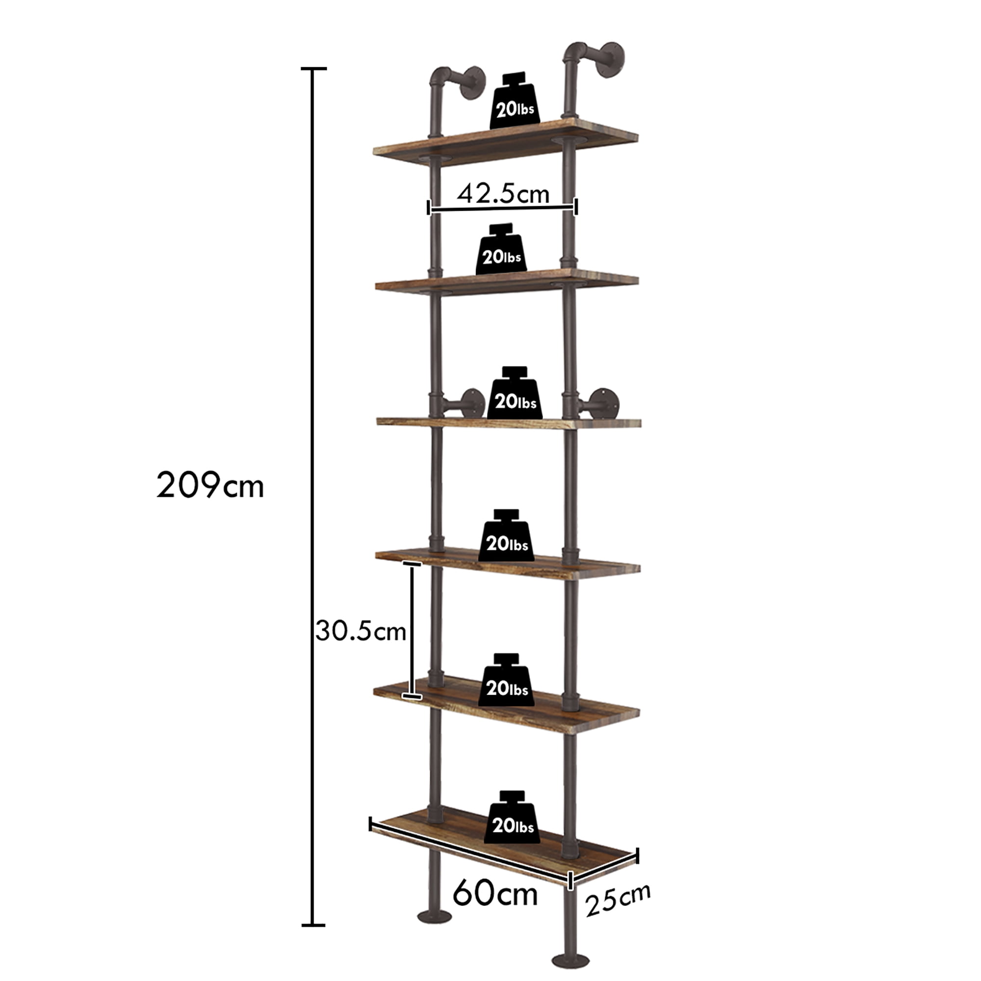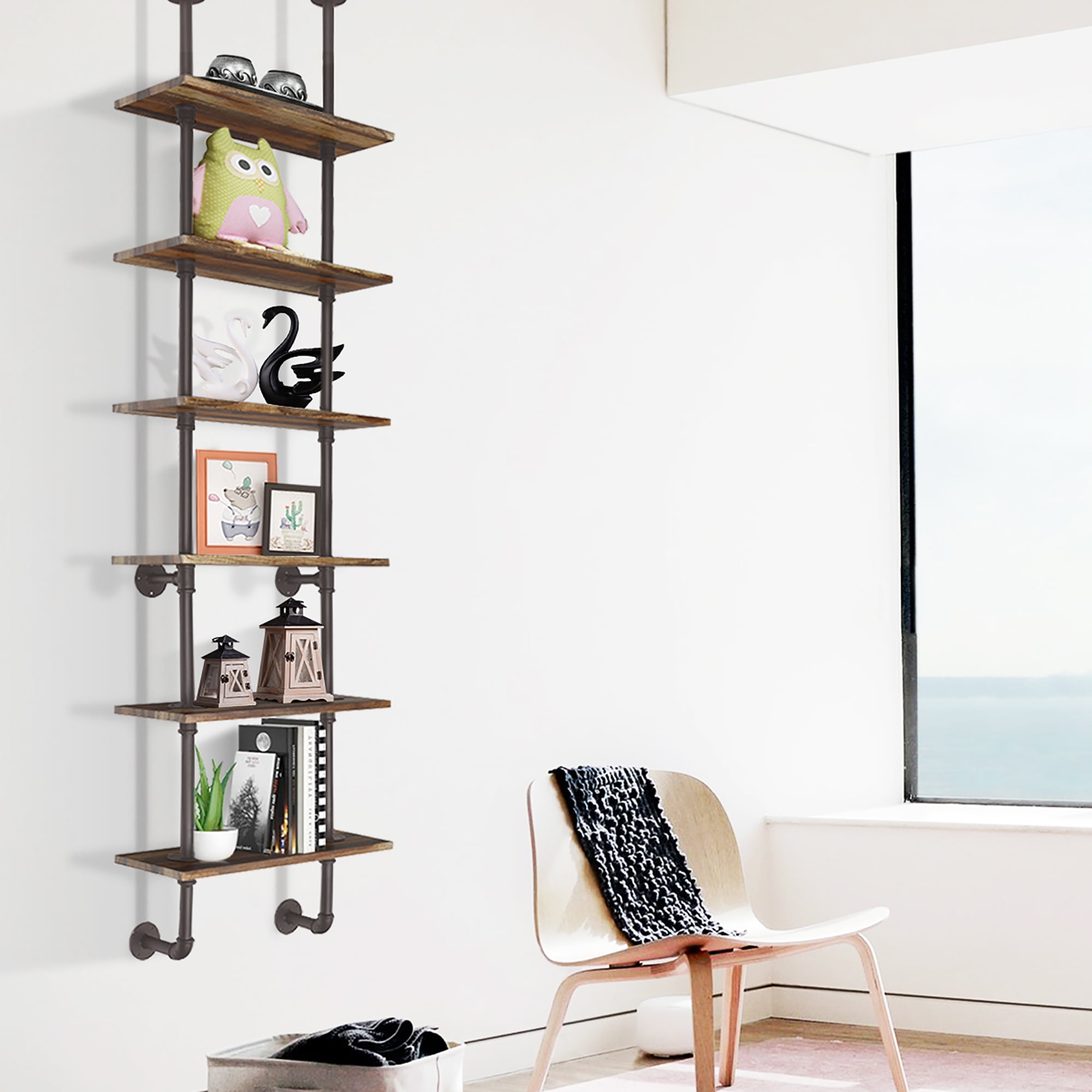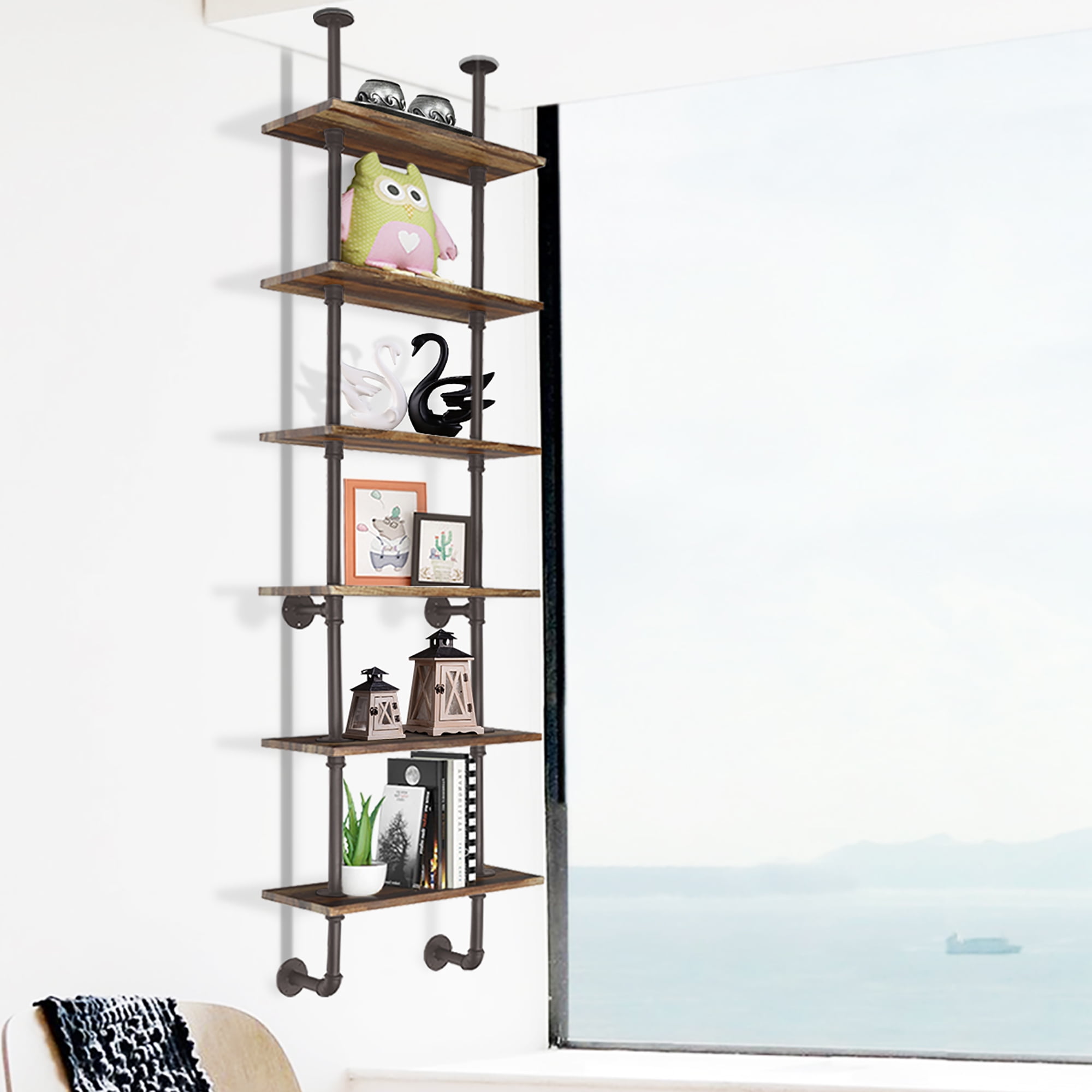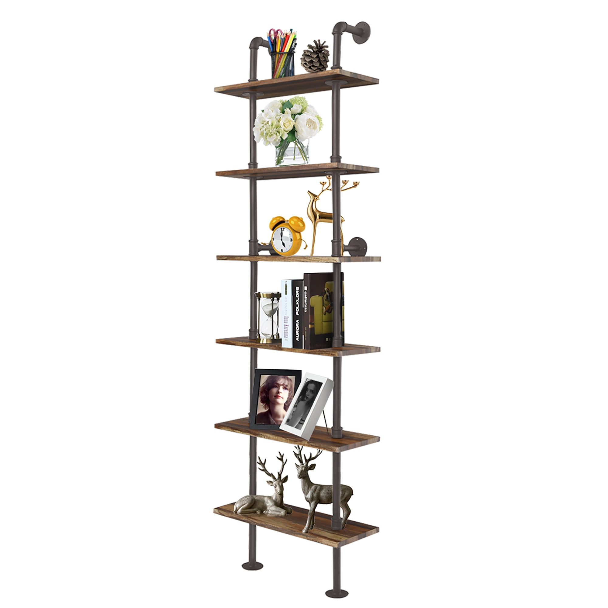 Costway 6-Shelf Rustic Pipe Shelving Unit, Vintage Industrial Pipe Wall Shelf Brown