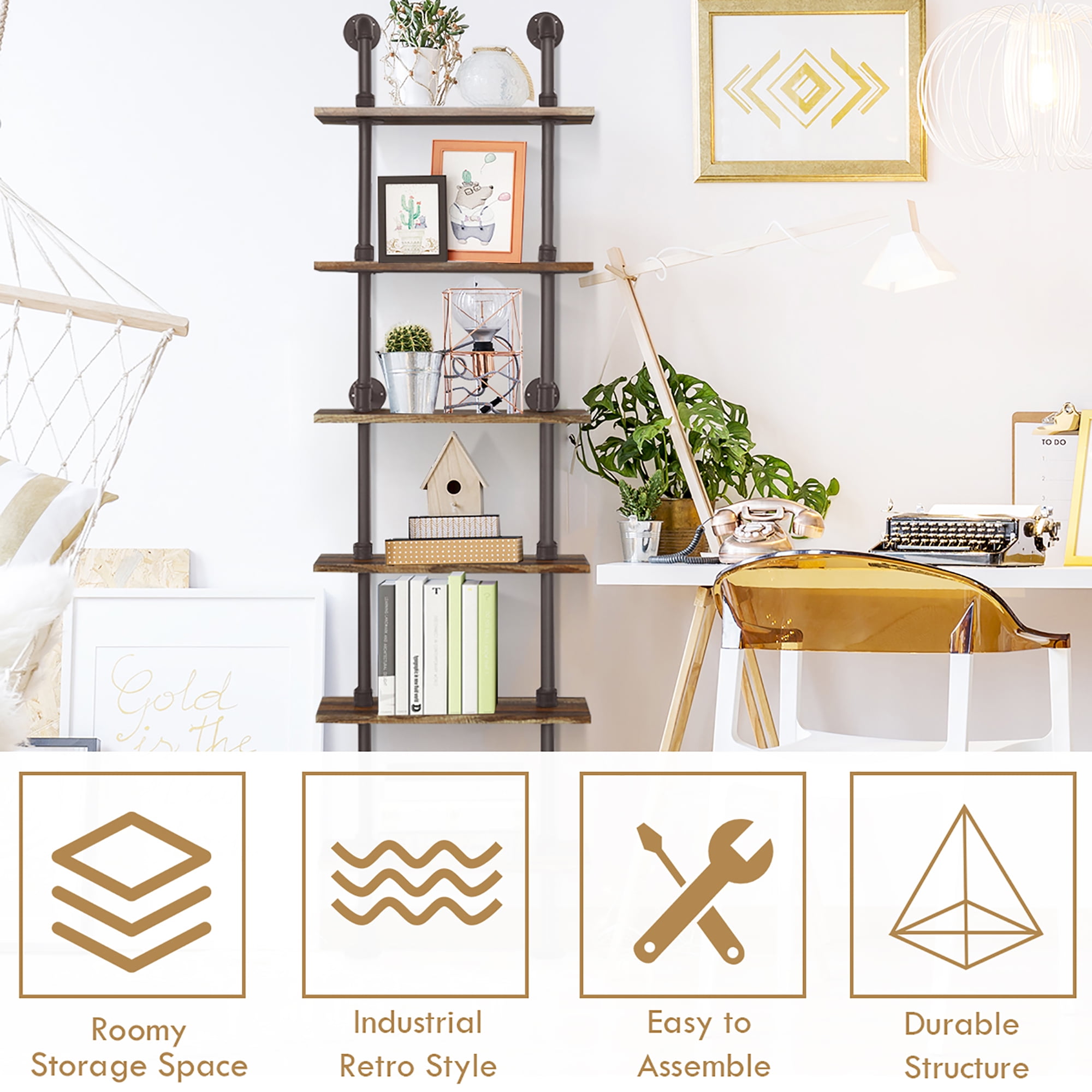 Our wall mount shelf is unique in shape and is especially suitable for industrial retro-decorated homes. It doesn’t take up too much space because it can be hung on the wall and can help you organize your room. You can put it in the living room, kitchen, bathroom, bedroom, coffee shop, etc. You can store books, photos, potted plants, toiletries, etc. Moreover, its MDF is very thick and has a good load-bearing capacity. The metal round tube is fixed on the wall and has good stability and is not easy to fall off. In addition, the assembly is also very easy. Don’t hesitate, come buy one! Feature High-quality MDF board and metal circular tube make it sturdy and stable. 1.5′ thickness board guarantees good load-bearing capacity. Versatile use, such as tool shelf in kitchen or display rack in living room . Unique design with industrial style is very attractive and charming. The open storage space is convenient for picking up objects. Large storage space, can put a lot of things, such as potted plants, photos etc. There is a metal disc (with screws) fixed to the wall, so it is stable and not easy to fall off. Simple assemble need and easy to clean, saving your time and energy. Specification Material: MDF board, metal pipe frame Color: Wood Grain Product Dimensions: 24”x 10” x 82.5″ (L x W x H) Package size: 27.5”x 17” x 12.5″ (L x W x H) Net Weight: 42.5 lbs Height between shelves: 12″ without adjustable Board Dimension:24”x 10” x 1.5″ (L x W x H) Wight Capacity of Each shelf: 20 lbs Diameter of Metal Disc: 2.5” Package Includes: 1 x 6-Tier Industrial Pipe Wall Shelf 1 x Instruction