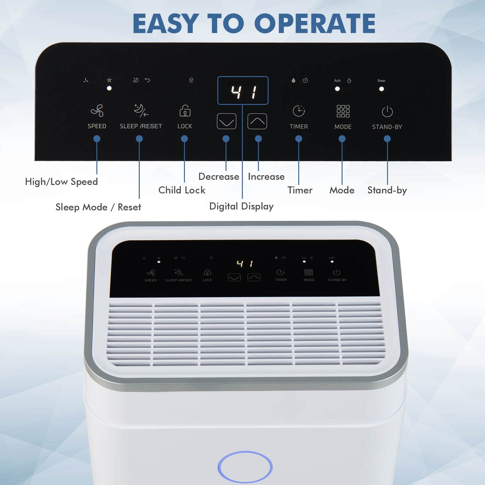 Our 45-pint dehumidifier can create a healthy & cozy living environment for you! This powerful dehumidifier removes up to 60 pints of moisture per day in spaces measuring up to 4000 square feet, which meet your dehumidification needs in the home, basement, garage and more. Designed with 3 working modes (auto/continuous drying/sleeping), 2 fan speeds and adjustable humidity range between 30-80%, our dehumidifier can maintain an ideal indoor humidity and bring you maximum comfort. With a 6.5L/1.7 gallon large water tank, you don’t need to empty the water tank frequently. The dehumidifier will automatically stop when the water tank is full and the full water alarm will remind you to empty the water. Moreover, a 3.3ft/1m drain pipe is included to achieve continuous drainage. With a working sound lower than 42dB, this dehumidifier won’t disrupt your life. The LED touch control panel, 3-color humidity indicator light, safety child lock, washable filter, 4 universal wheels work for a better using experience. Feature Remove up to 60 pints of water per day, fit for rooms up to 4000 sq.ft 3 working modes to choose from: auto/continuous drying/sleeping mode 2 drainage options: continuous drainage or manual drainage 3-color indicator lights clearly show the current humidity range 24-hour timer brings convenience and saves energy cost Smart touch panel and digital display for easy operation Full water tank alarm and light remind you to empty the water tank Easy to set your ideal humidity level between 30% and 80% 2 fan speeds (high/low) meet your different needs The continuous drying mode is perfect for rainy weather or seasons Child lock function makes it suitable for families with kids Overflow protection and overheating protection ensure high safety Auto-defrost function enhances working efficiency and avoids damage Quiet operation won’t disrupt your sleeping or working Specification Color: White Material: ABS Product Dimension: 13” x 9” x 22.5” (L x W x H) Net Weight: 35 lbs Fan Motor Power: 0.038HP Voltage: 115V/60Hz Rated Input Current: 2.7A Timer: 0-24 Hours Water Tank Capacity: 1.7Gallon Adjustable Humidity Range: 30% – 80% Length of Drain Hose: 3.3ft Length of Power Cord: 5.3ft Noise Level: ≤43dB Package Includes: 1 x Dehumidifier 1 x Drain Hose 1 x Instruction