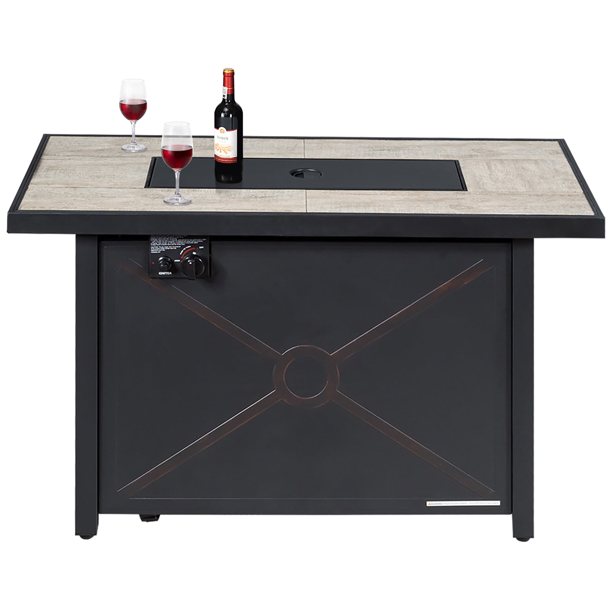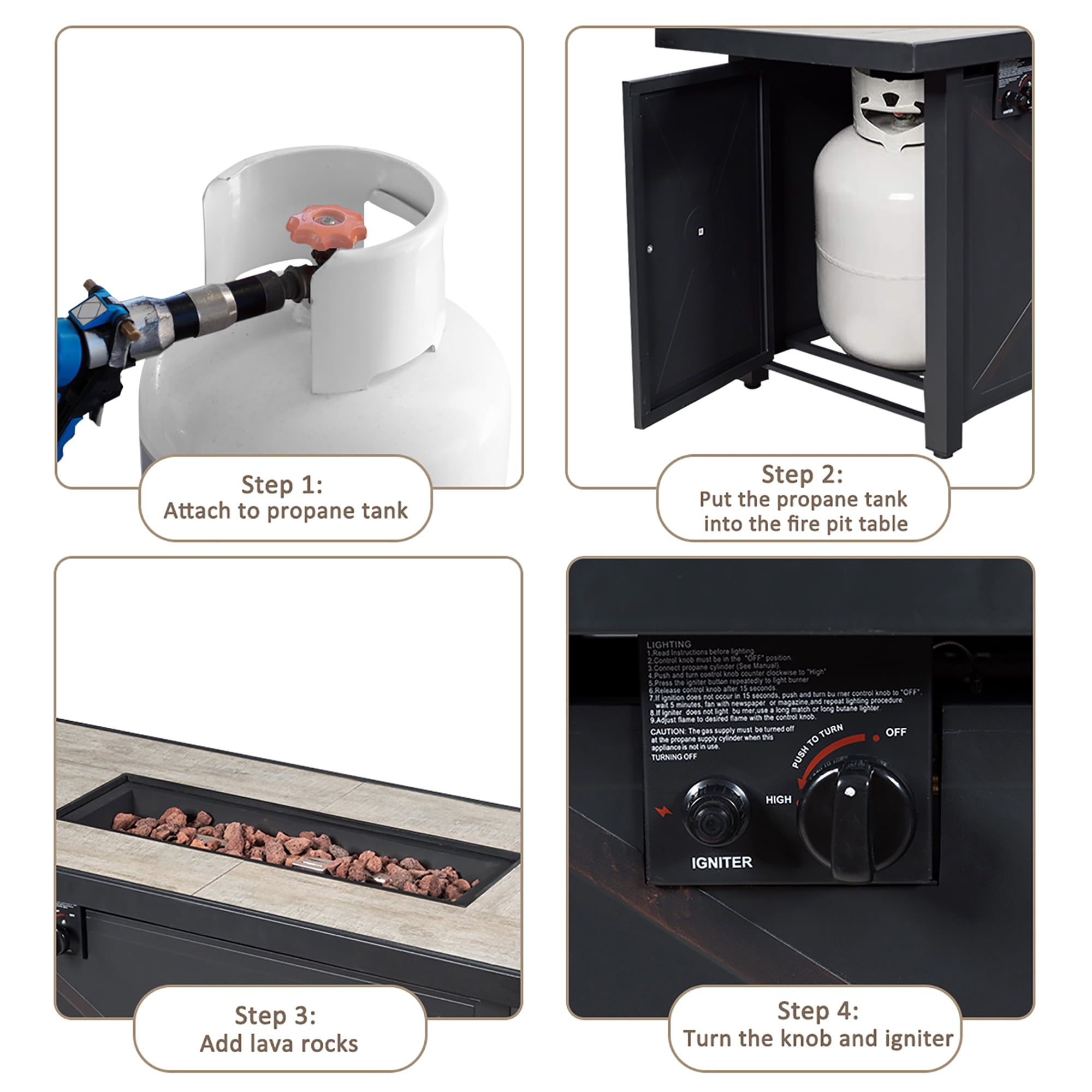 2-in-1 Fire Pit Table: This 60,000 BTU propane fire pit table not only brings much warmness to you in cold winter days, but also can be used as a patio table when the lid is covered in place. 42” wide tabletop allows you to put multiple items on it. Such a functional design makes the fire pit table ideal for all-season use and satisfy your different demands. Safe & Simple Operation: Installed with an electric pulse ignition device which includes 1 x AAA battery, the CSA and ETL approved fire table is easy and safe to operate. What you need to do is just to push and turn the control knob, continue press the igniter button to light burner. Note: please do not completely cover the burner with volcanic rocks when igniting. And please keep lava rocks always dry to prevent splashes when using. High-Grade & Sturdy Material: The main frame of the fire pit table is made of high-quality and rustproof steel. And the ceramic tabletop is not only elegant, but also heat resistant and sturdy. The burner in the middle is constructed of stainless steel, withstanding long-time heating. Moreover, the footpads at the bottom are adjustable, making the table stand with higher stability. PVC Protective Cover Included: This propane fire table comes with a functional PVC cover, which is waterproof and sunlight resistant. The cover effectively protects the table when not in use, highly prolonging its service life. But please do not use the cover until the burner has cooled down. Assembly Required: With all necessary accessories and an easy-to-follow instruction, you can finish the assembly of this fire table correctly and efficiently. The fire pit table is available for standard 20 lbs propane gas tank, and designed with a premium fixing ring for the tank. Also, the side door with handle ensures simple access for the gas tank. Overall dimension of fire table: 42” x 20” x 25” (L x W x H). Weight capacity of tabletop: 220 lbs.