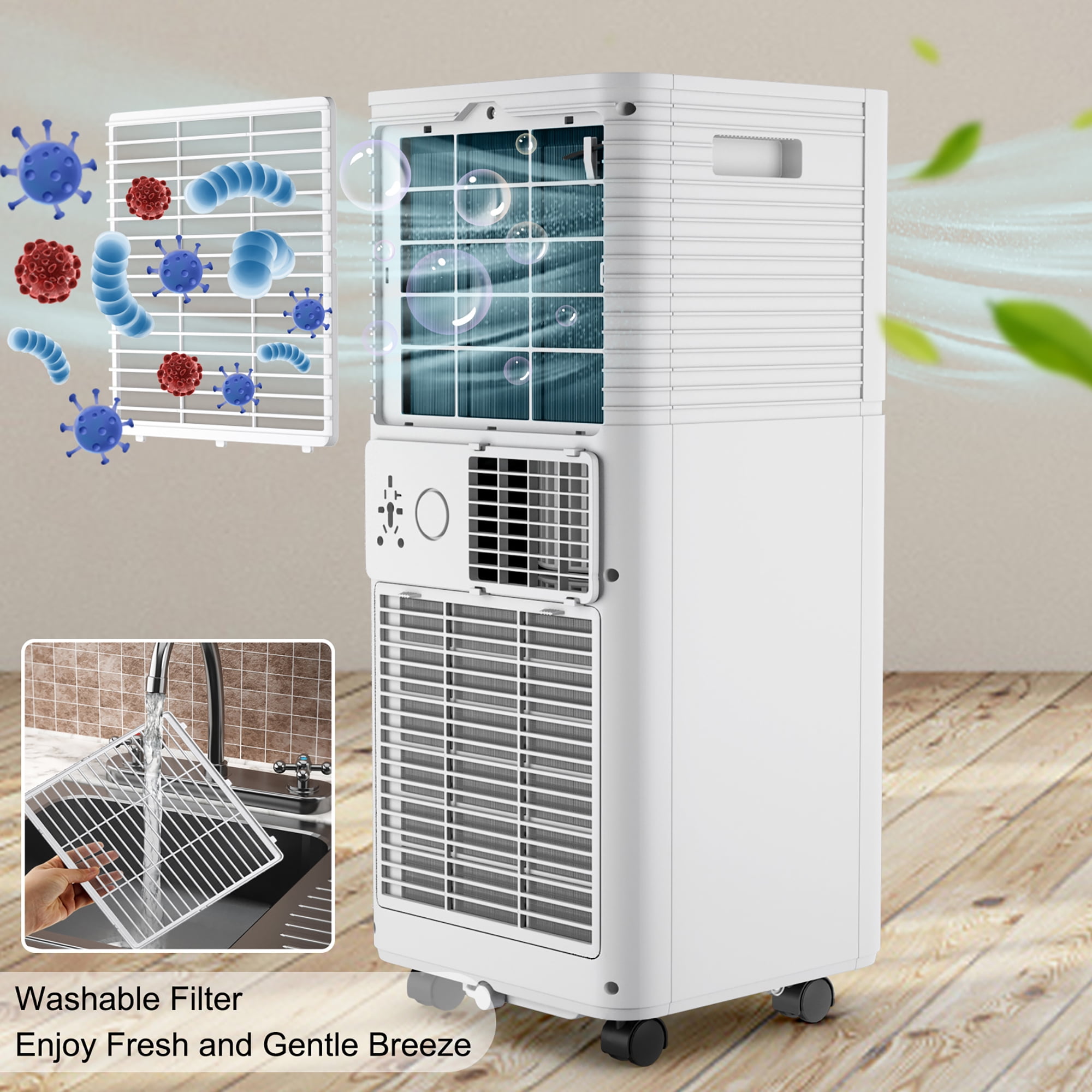 Our 3-in-1 10000 BTU portable air conditioner is a perfect cooling appliance for your home! Rated at 10000 BTU and with a high air flow of 330 m³/h, this air cooler unit can efficiently cool areas up to 350 square feet. This air cooler combines 3 functions in one piece, including cooling, ventilating and dehumidifying. Under the dehumidifying mode, it can remove up to 50 liters of moisture per day to keep your room dry and clean. Besides, under the fan mode, you can set high fan speed or low fan speed as you wish. To provide clean cool air, our air conditioner is designed with a removable and washable filter screen. The 24-hour timer and quiet sleep mode can provide you with a peaceful and comfortable sleep. In addition, the handy remote, clear LED display and touch panel allow you to control the air cooler with ease. With 4 universal wheels, you can easily move it to your living room, bedroom, dining room, etc. Feature Air conditioner with 10000 BTU cooling capacity can cool down an area of 350 sq.ft. Low-noise sleep mode and smart 24-hour timer function ensure you a good sleep The louver can be manually adjusted up & down 70°, 30° to the right, 20° to the left 3-in-1 multifunctional design includes air cooler, fan and dehumidifier 4 modes and 2 wind speed adjustment to meet different needs Removable and washable filter screen helps to improve air quality Manual oscillating function offers wide-angle air supply Remote control and smart touch panel for convenient use Auto defrosting function and self-evaporating system for higher efficiency Auto shut off when tank full & auto restart in the event of power outage Equipped with 4 universal casters and built-in handles for easy movement Adjustable window kit is included to match various windows Child safety lock prevents potential accidents Specification Color: White Material: ABS Product Dimensions: 12.5” x 12” x 27.5”(L x W x H) Cooling Capacity: 10000 BTU Coverage Area: 350 sq. ft. Air Flow Rate: 330 m³/h Voltage: 115V/60Hz Dehumidifying Capacity: 50 Pints/Day Temperature Setting Range: 60.8℉~89.6℉ Refrigeration: R410A Timer: 1-24 Hours Wind Speed: High/Low Noise: ≤65dB Exhaust Hose Length: 9”-61.5” Exhaust Water Pipe Length: 25.5” Suitable Window Size: 25.5”-49.5” Power Cord Length: 6FT Net Weight: 45 lbs Package Includes: 1 x Portable Air Conditioner 1 x Exhaust Hose 1 x Exhaust Water Pipe 1 x Hose Connector 1 x Window Kit 1 x Remote Control 1 x User Guide