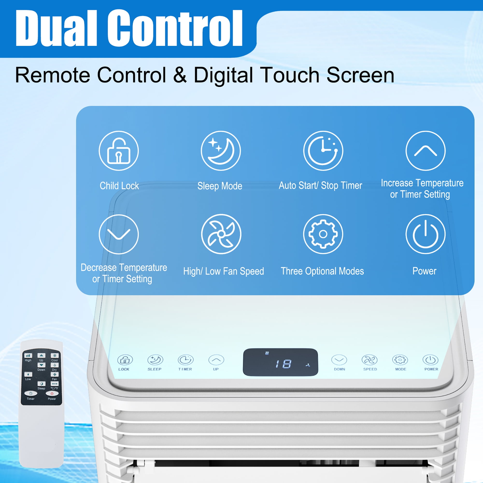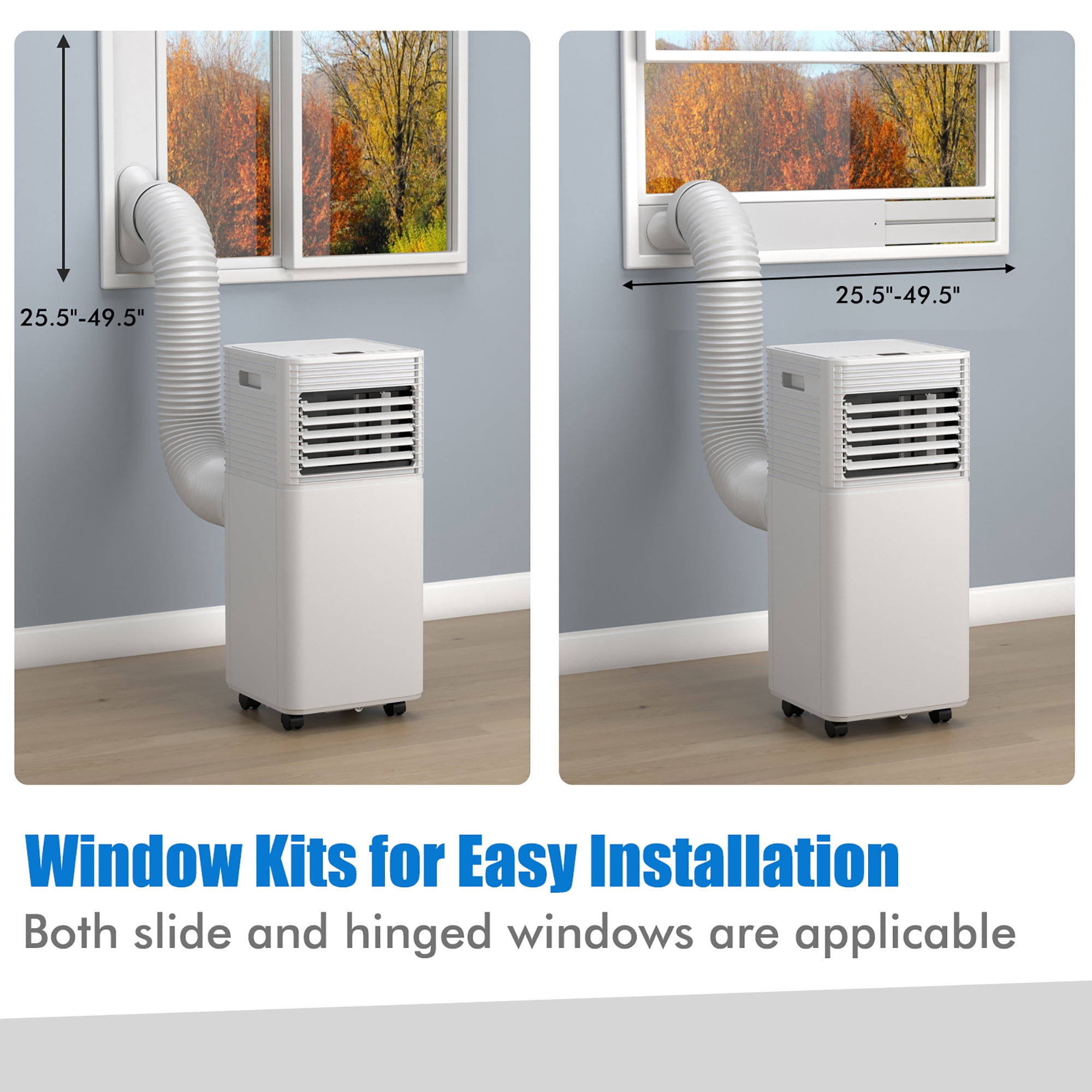 Powerful Cooling Capacity: Equipped with 10000 BTU cooling power and a washable dust filter screen, this portable air conditioner can cool down an area of 350 square feet while purifying the air at the same time. And the air flow is rated at 330 m³/h, which can provide steady, fast and effective cooling for any room in your home. 3 in 1 Design & Quick Installation: In addition to cooling your room, this air cooler can also serve as a fan and dehumidifier to meet different needs. With 50 pints moisture removal capacity per day, it can keep your room cool and dry. Besides, the window kit allows you to attach the exhaust hose to any vertical or horizontal sliding windows and the suitable window size is 25.5”-49.5”. Sleep Mode & 1-24H Timer: In sleep mode, this air conditioner runs quietly (≤65dB) and the temperature will increase by 1 ° C /33.8 ° F every hour, which can prevent you and your families from getting colds. Moreover, the 1-24 hour timing function allows you to set the auto-off time to enjoy a comfortable sleep without worrying about electricity bills. Variable Wind Direction & Speed: You can adjust the shutter manually to change the wind direction vertically and horizontally, which can offer even air distribution throughout the room. Besides, under the fan mode, there are 2 fan speeds (high/low) for you to choose. The safety child lock can effectively avoid the child touching and causing danger. Easy to Operate & Move: With the smart touch panel and easy-to-read LED display, it is easy to control the cooling performance. And the remote control allows you to control the air conditioner without getting up from the bed or sofa. What’s more, 4 universal wheels and built-in handles make it easy to move from room to room.