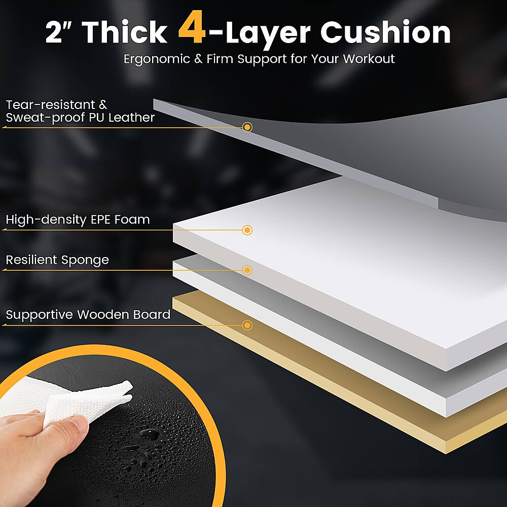 The weight bench is covered with tear-resistant & sweat-proof PU leather, which not only offers soft touch but also ensures great durability. In addition, the waterproof leather surface is easy to wipe clean.