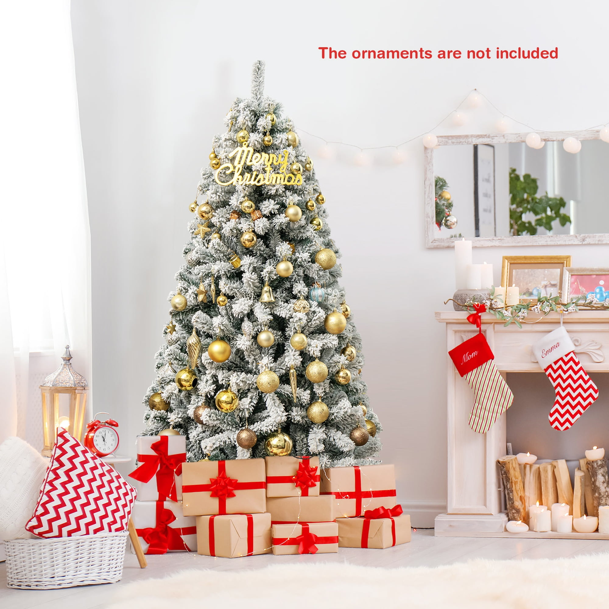 The flocked Christmas tree is the best choice for the snowy season! Coming with 600 branch tips made of new PVC, the 6ft decoration tree looks very lush and perfectly imitates a real tree. Also, branches can expand automatically with a hinged system, while the tree consists of 3 sections for quick setup. What’s more, the included metal stand is a safeguard to ensure overall stability and avoid tipping. Thus, you can freely add the festival celebration tree to diverse occasions, such as home, office, shop and carnival. Finally, it will become an impressive symbol for your best wishes at your party. Feature Flocked design to make the Christmas tree look snowy Remind you of spring with vibrant 600 branch tips Made of new PVC for excellent durability Hinged system to offer the auto dropping of branches for convenience Can be taken down into 3 sections for space-saving storage Ensured stability provided by the folding metal stand Blend well into office, home, school, shop, carnival and more Time is saved thanks to the simple installation Specification Color: White Material: PVC, Metal Tree Height: 6ft Tree Width: 3ft Diameter of Metal Stand: 18” Number of Branch Tip: 600 Number of Section: 3 Net Weight: 10.5 lbs Package Includes: 1 x Flocked Christmas Tree 1 x User Guide