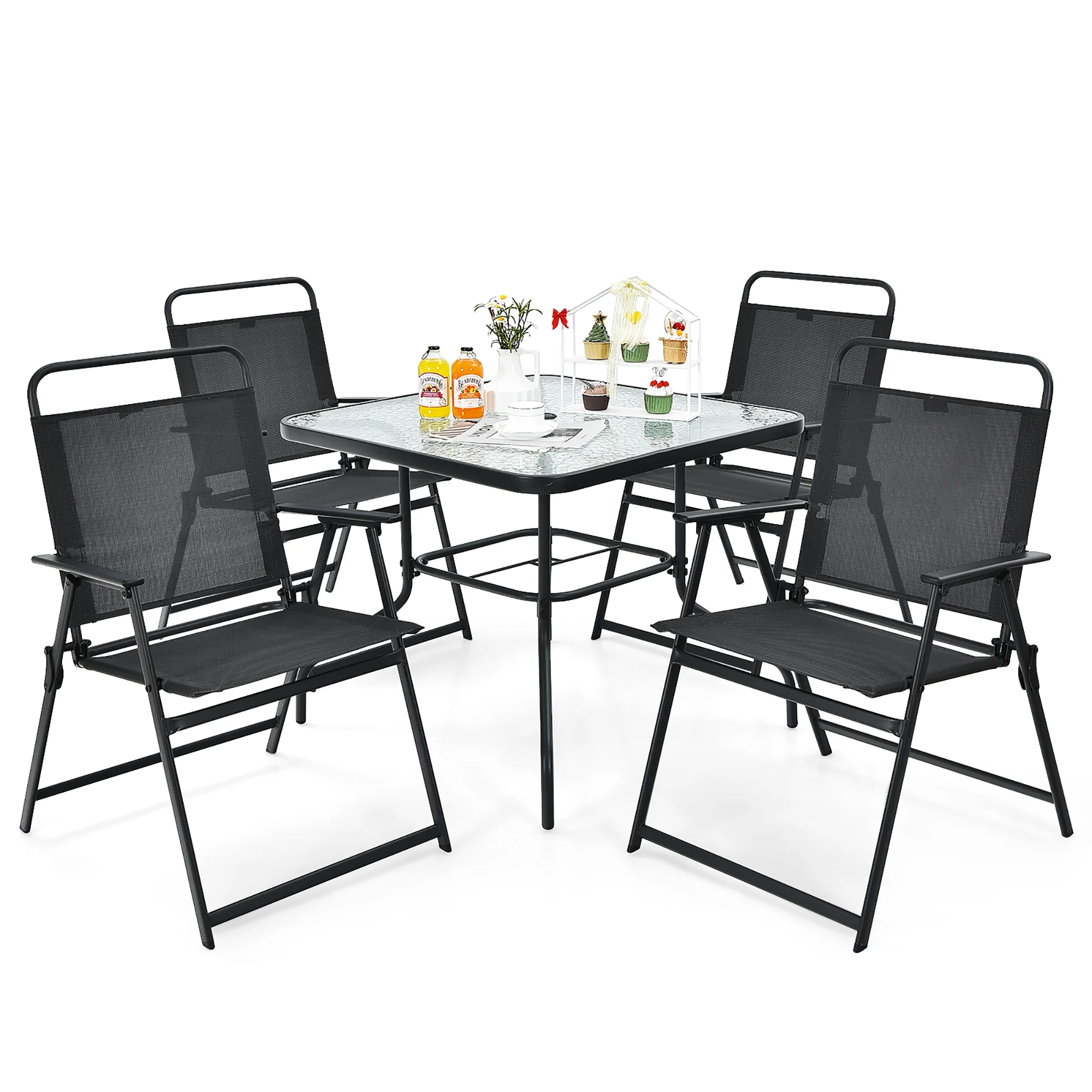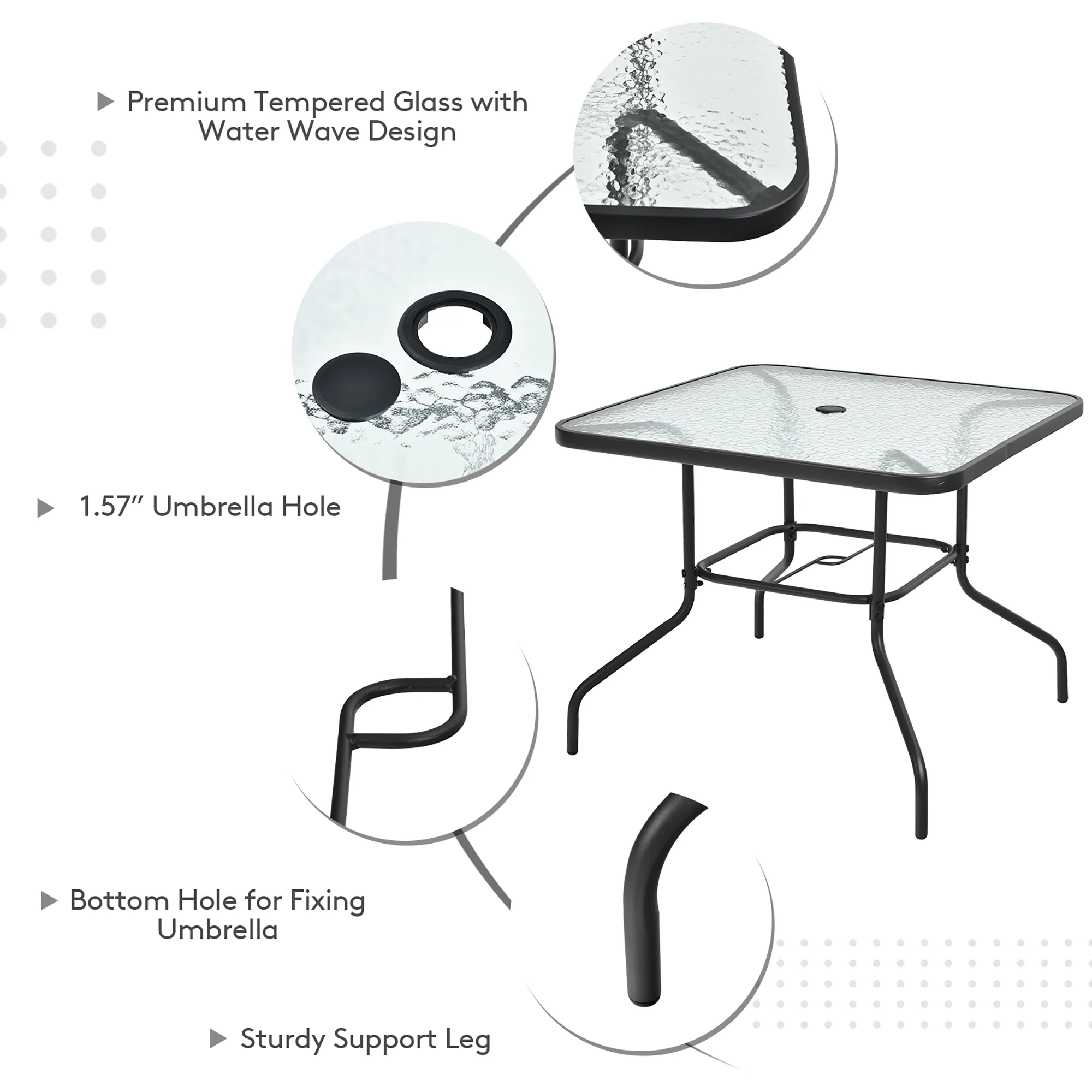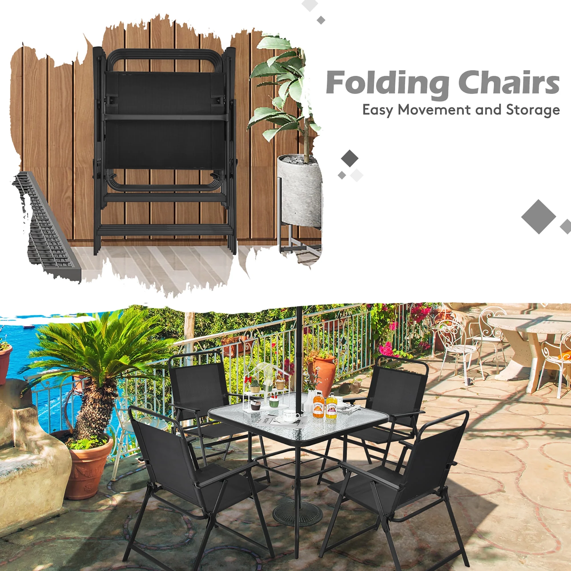 Patio Umbrella: Vary from other common patio dining sets, this outdoor furniture set comes with a patio umbrella, which creates a cool shade for you and your friends/family while chatting or enjoying a delicious meal. The waterproof and fade-resistant polyester makes it fit outdoors. Please use the base (not included) with the umbrella for stability and safety. Foldable Chairs: In order to save your outdoor space, the 4 premium chairs can be folded, so you can move and store them with ease. Meanwhile, the installation of these chairs is not required. And the breathable fabric avoids stuffiness after sedentariness. Tempered Glass Table: Featuring high quality tempered glass with water wave design, the smooth tabletop allows you to clean it conveniently. And you can put various belongings on it. There is an extra hole on the bottom to help you fix the umbrella. Wide Application: With removable umbrella, this folding patio dining set is suitable for different places, such as patio, backyard, poolside, garden and balcony, etc, allowing you to enjoy outdoor time with your friends and family. Besides, the sturdy steel frame with anti-rust surface ensures its long service time. About Dimension: Dimension of umbrella: 58”x 58” x 88” (L x W x H), dimension of table: 34” x 34” x 27.5” (L x W x H), unfolding dimension of each chair: 25.5” x 20” x 36” (L x W x H), folding dimension of each chair: 33” x 22” x 2” (L x W x H), seat height from the ground: 17”, weight capacity of table: 50 lbs, weight capacity of each chair: 250 lbs.