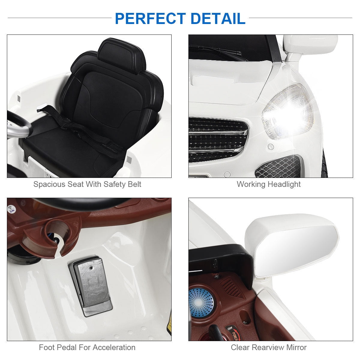This Is Our Fantastic And Functional BABY RIDE ON Car For Your Lovely Children. It is Beautiful Working Lights And movable Door Add To The Sense Of Being In A Real Car While The Comfortable Seat And MP3 Aux Provide An Enjoyable Environment For Your Babies When Playing. This Is A Perfect Gift For Your Kids! And The Fun Part Is – When Needed You Could Control It Too.Do not hesitate to add it cart Feature Suitable For Child With Age From 36 To 72 Monthes Drives On Flat Surfaces Door can be opened Battery Operated, Continuous Fun Over 1 Hours With Parental Remote Control MP3 Input Comfortable Seat With Safety Belt With Horn Working Headlights Foot Pedal For Acceleration Function:Forward, Backward,Turn left/right,Brake,Stop 2 Mode:R/C(Remote Control) And B/0(Battery Operate) Mode Assembly Required Double door with safety lock: While ensuring the aesthetics, more convenient for children to get on and off, and the safety lock ensures security. Spacious seat with safety belt & Working headlight & Foot pedal for acceleration & Clear rearview mirror Specification Color: White Main Material: Plastic Size: 24” (L) x38”(W) x21”(H) Net Weight: about 23 Lbs Weight Capacity:44lbs Ambient Temperature:0-40℃ Speed: 2.4-3.1km/h Battery: 6V 4AH Charger: Input:AC 110V 60Hz Output:DC 6V 800mA Charging Period: 8-12 Hours Each Time Motor: DC 5V Package includes: 1 x kids ride on car 1 x remote controller(2*1.5V AA battery are not included) 1 x charger 1 x instruction manual