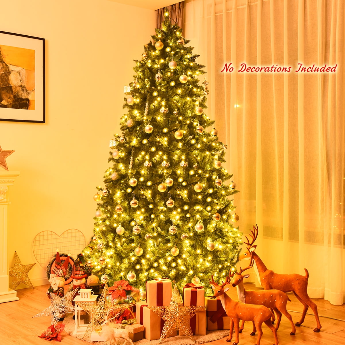 Our pre-lit Christmas tree offers a truly luxurious look and style. The 7.5ft artificial fir tree has 1968 branches and is full of appearance. PVC material is non-flammable, non-allergic and reliable to make it the perfect substitute for the real tree. We provide 700 LED lights with 8 flash modes to suit your holiday spirit. And 1968 branch tips provide plenty of space for hanging ornaments and other Christmas tree decorations. The hinged structure and foldable base allow you to easily assemble the tree or unpack it and effortlessly store it next year. It is ideal for decorating homes, offices, school, etc. Feature 700 LED lights create a warm Christmas atmosphere The lights have eight flash modes to suit different atmosphere The plug of the Christmas tree is UL certified PVC material makes the Christmas tree more environment friendly and realistic Solid iron base and metal frame offer sufficient balance and reduces breakage Foldable base and hinged sections makes the tree easy to assemble and store Plastic feet covers prevent the scratches on the floor 1968 branches leaves you a huge decorative space Perfect for decorating homes, offices, school, etc Specification Color: Green Material: PVC&Metal Adapter: UL-certified Overall Dimension: D4.4ft x 7.5ft Number of Tips: 1968 tips Number of lights:700 Net Weight: 29lbs Package includes: 1x 7.5FT Pre-lit Christmas Tree 1x Stand 1x Adapter