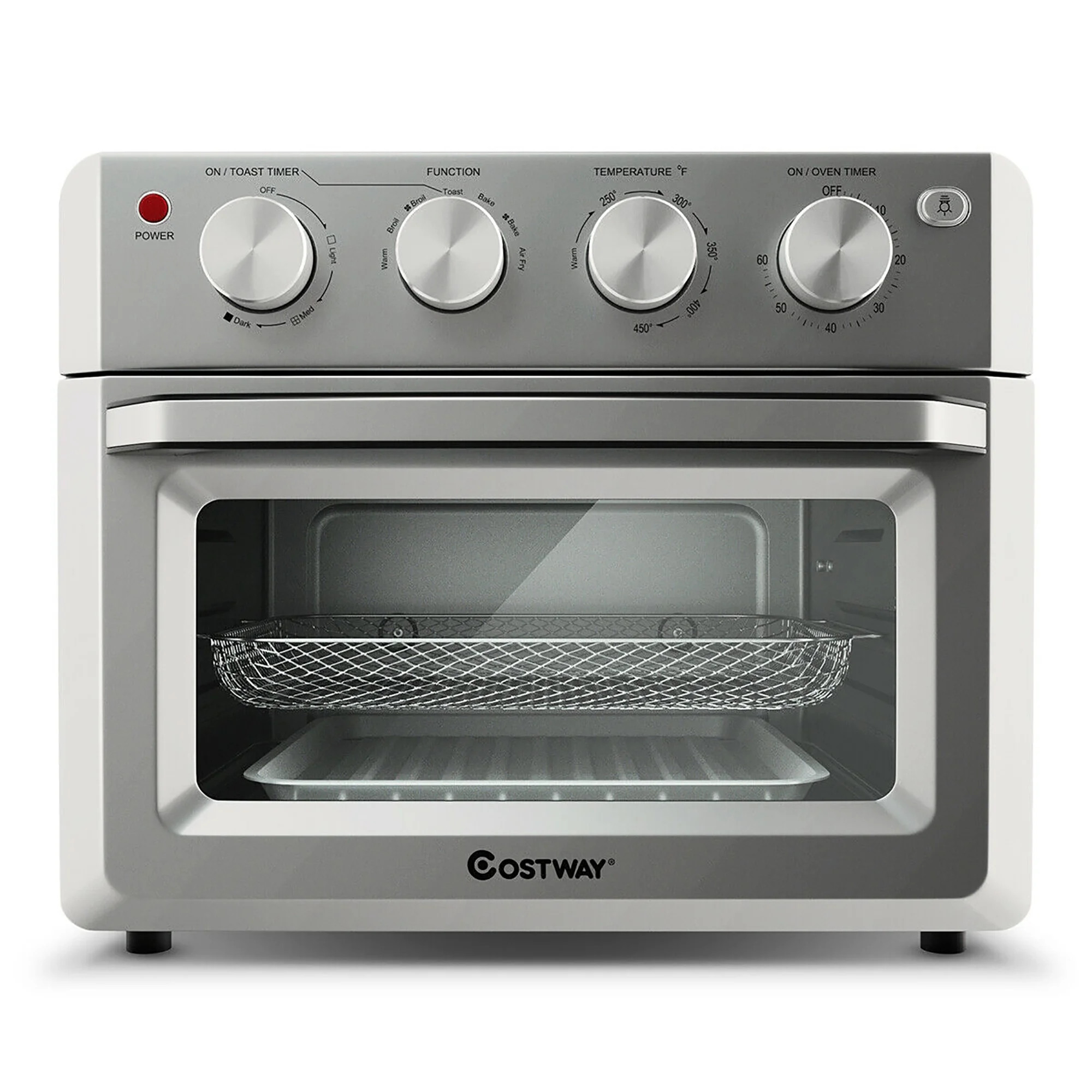 7-in-1 Versatile Air Fryer Oven: Featuring 7 pre-set cooking functions, this electric air fryer oven will simplify any kitchen task from air frying, broiling, baking to toasting, dehydrating and warming, our convection oven will satisfy all your diverse cooking needs by making a variety of cuisines. And you can select the ideal modes through adjusting function switch. Healthy Oil-Free Air Fryer: Different from the traditional way of cooking with hot oil, this convection toaster oven adopts up and down balance heating (4 heating tubes on the top, 2 on the bottom) to fry up food. The adjustable temperature from 250degree F- 450degree F drives out the extra fat in the food, while maintaining the crispy taste of traditional way. Large Family Size & Safety Guarantee: Our air fryer oven could easily fit 6 slices of toast, a 9 inches pizza, 3 pounds chicken wings and a 4 pounds chicken in the 19-quart interior space. You can make plenty of food for the whole family. Besides, non-slip foot pads, heat-resistant handle and oven mitt will provide further safety insurance. 4 Knobs for Easy Operation: Four electroplated knobs help you control the time, temperature and cooking mode effortlessly. You can set the temperature from 250degree F to 450degree F and the time from 0 to 60 minutes as you want. Meanwhile, the additional toast timer from 0-8 minutes provides with three baking color options (light, med, dark). Dishwasher-Safe Accessories & Considerate Design: This air fryer oven comes with 4 dishwasher-safe cooking accessories including fry basket, oven rack, baking pan and crumb tray. All accessories are removable for easy cleaning. Additionally, transparent window and interior lighting allow you to monitor the food easily while cooking.