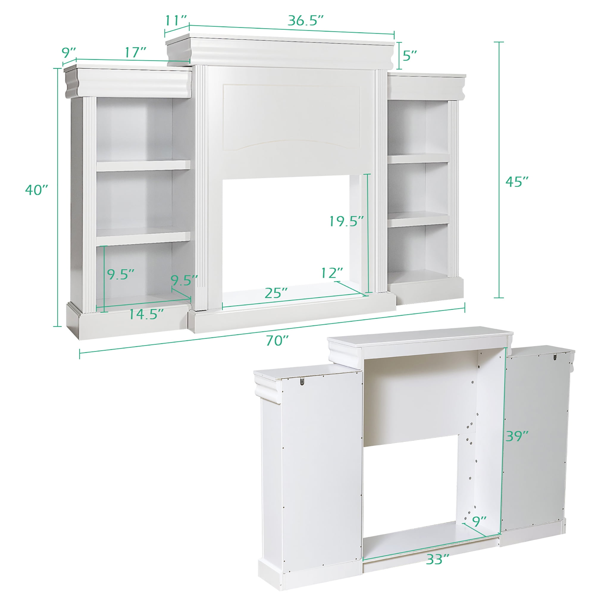 Our 70” fireplace TV stand is designed to upgrade your living space! Made of solid MDF with premium NC paint, this TV cabinet is sturdy and sturdy enough to be used for a long time. The spacious desktop fits up to 40”flat screen TVs and can hold some decorations. 6 open compartments are designed to provide ample space for storing your audio or video equipment. What’s more, this TV stand can hold a 26” electric fireplace (not included) to make it a fireplace cabinet. The classic and elegant design makes the TV stand an ideal ornamentation to match your home and will take your living space to a higher level. Just enjoy the warmth when you watch TV with your family! Feature High quality MDF construction ensures great sturdiness and durability 6 open shelves provide ample space for storing books, CDs and more Spacious tabletop with large weight capacity can hold a TV upto40” Multipurpose & practical design meets different needs for daily use Chic and classic style adds a sense of elegance to your home A perfect decor for living room, entryway, bedroom, study, etc Smooth and waterproof painted surface for easy cleaning Easy to assemble with detailed instructions Specification Color: White Material: MDF Product Dimensions:70” x 11”x 45”(L x W x H) Suitable Size of Fireplace: 26” Net Weight: 97 lbs Weight Capacity of Tabletop: 44 lbs Weight Capacity of Each Shelf: 22 lbs Package includes: 1 x Fireplace Cabinet 1 x Instructions