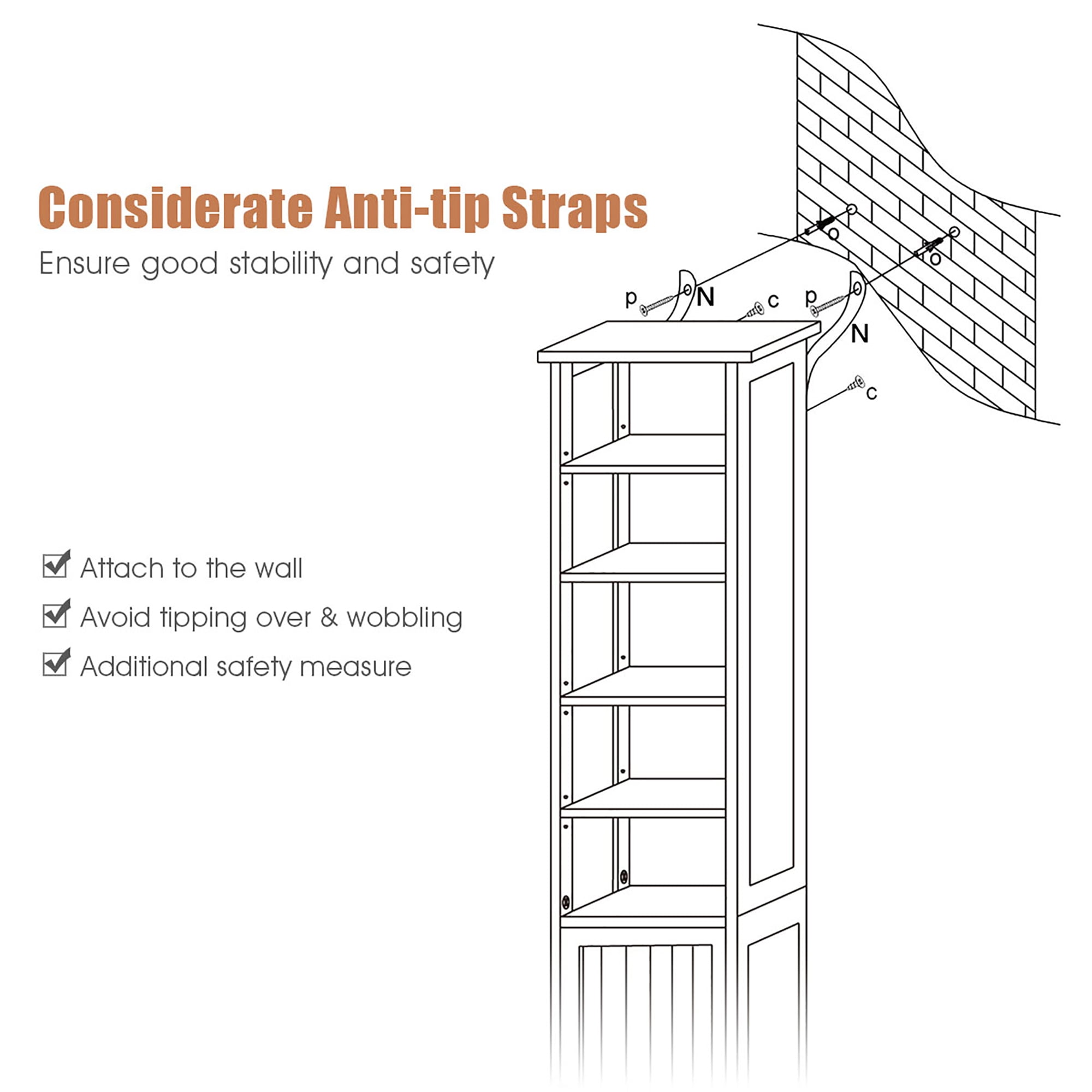 【Smart & Modern Design】A wonderful all-around pragmatic bathroom tower storage cabinets. It was consist of five open shelves and one cupboard with door, with plenty of storage space for you to arrange your towels, plants or cosmetics, also hide some personal or unseemly necessities like toilet paper and cleaning products. 【Large Storage Capacity】The dimension of bathroom tower storage cabinet is 16”X13.5”X72”(LXWXH). There are five shelves and one cupboard with door of this cabinet, which can provides an excellent storage space option for any kind of bathroom with restricted area. it can accommodate all your toiletries, such as cosmetics, shower gel, shampoo and towels, perfectly save space for your bathroom. 【Selected Material】Tall cabinet crafted by sturdy premium MDF material, it guarantees that you can use it for a long time. A environmental friendly paint to secure no harm to your family. What a perfect choice for your bathroom. 【Adjustable Shelves】Bathroom floor cabinet equipped with 4 adjustable shelves(one active shelf inside of the cupboard). you can adjust the size of the space flexibly according to the size of your item or your personal needs. 【Size of Tall Cabinet】16” x 13.5” x 72” (L x W x H). Net weight: 34 lbs. Weight capacity of each shelf: 5.5 lbs.