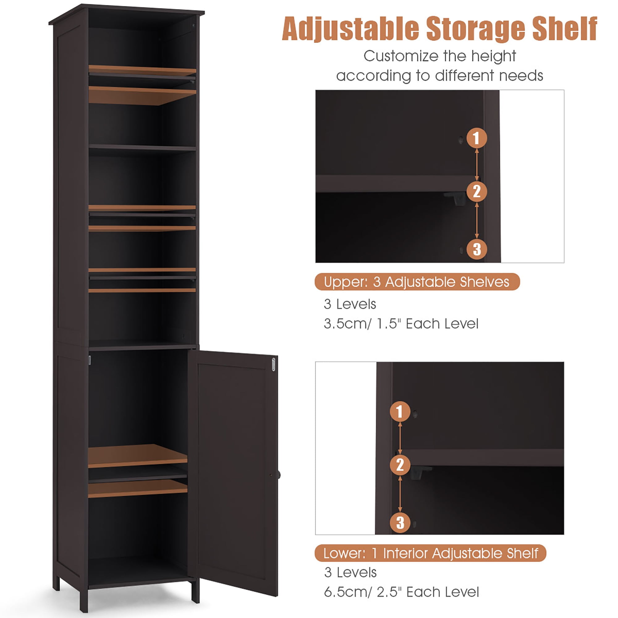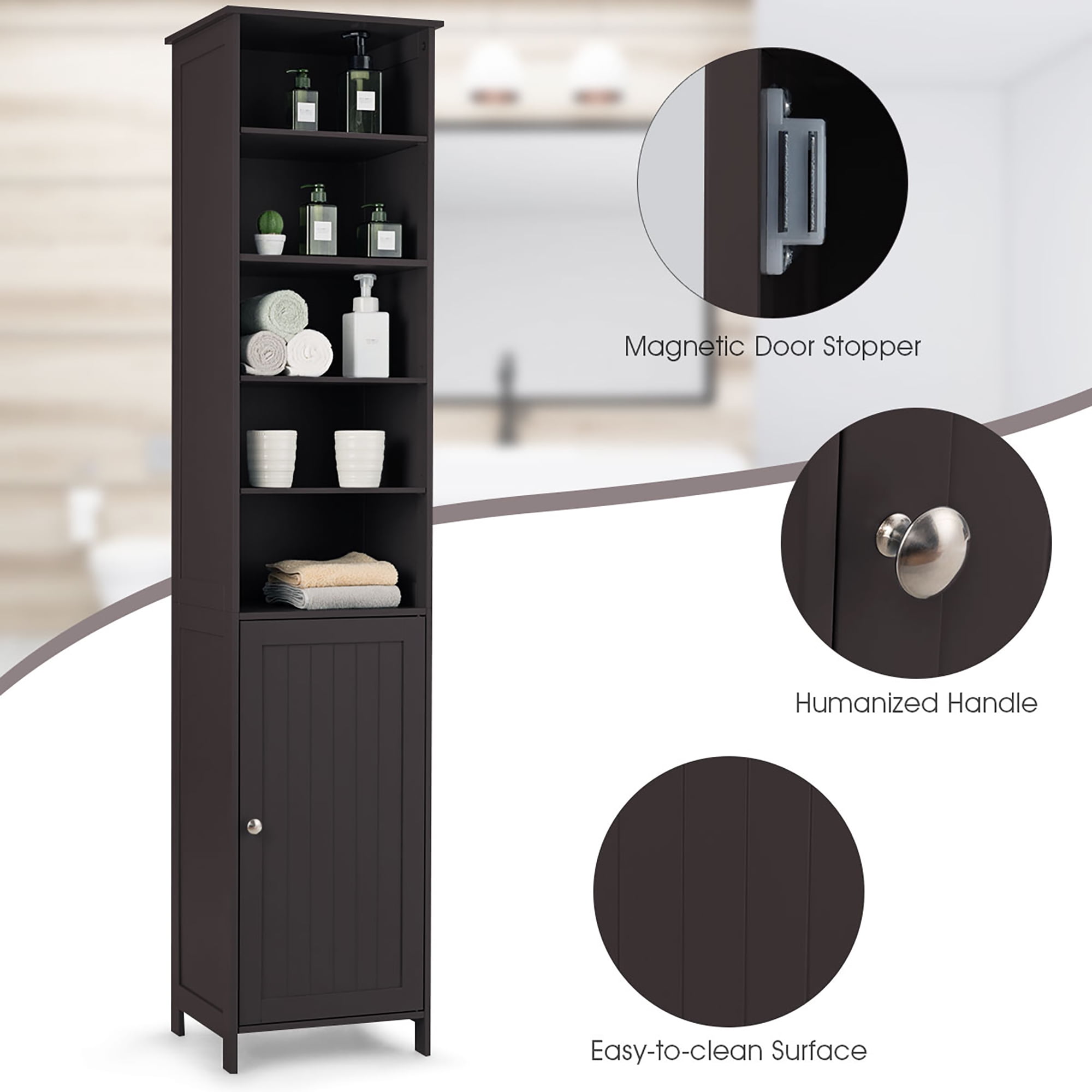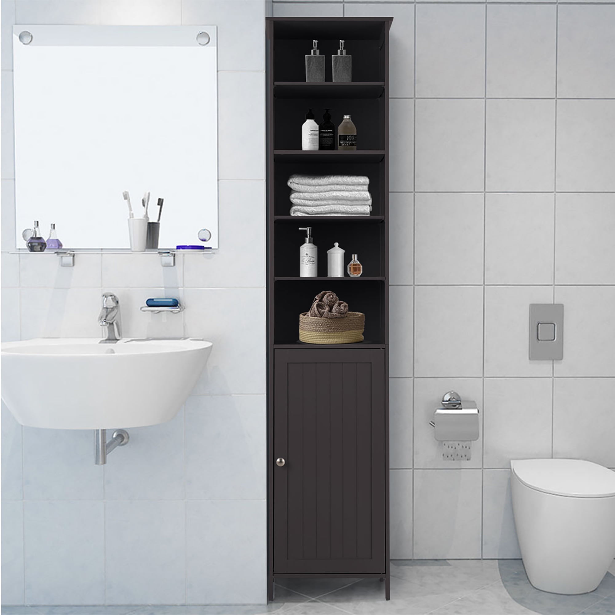 This is our new brand and high quality bathroom high cabinet which provides the perfect solution to your storage problems. The bathroom cabinet offers large storage capacity in a compact space so it can help you save space. It is ideal for bathroom, hallways, kitchens and beyond. Equipped with 5-shelf provide plenty of room to storage your items and a door with silver metal handle knob can keep your personal item safe. What’s more, it has movable shelves so that you can adjust the distance between layers according to your needs and the anti-dumping design can protect your safety. Feature Made of premium MDF and high quality hardware, stable and sturdy Five shelves and one cupboard with a door(one active shelf inside) provide large storage capacity White finish make it available in different finishes to blend in with any decor With a door can keep your personal item safe With silver metal handle knob easy to open and close The activity laminate can adjust the distance between layers Save space, store more items in a smaller space Can be fixed on the wall to prevent dumping Easy to assemble and easy to clean Specification Color: Brown Material: MDF Product size: 16”X13.5”X72”(LxWxH) Feet thickness: 0.5” Fixed laminate thickness:0.5” Activity laminate thickness:0.4” Bearing of each shelf:5.5lbs Net weight:34lbs Package includes: 1xBathroom cabinet 1xInstruction