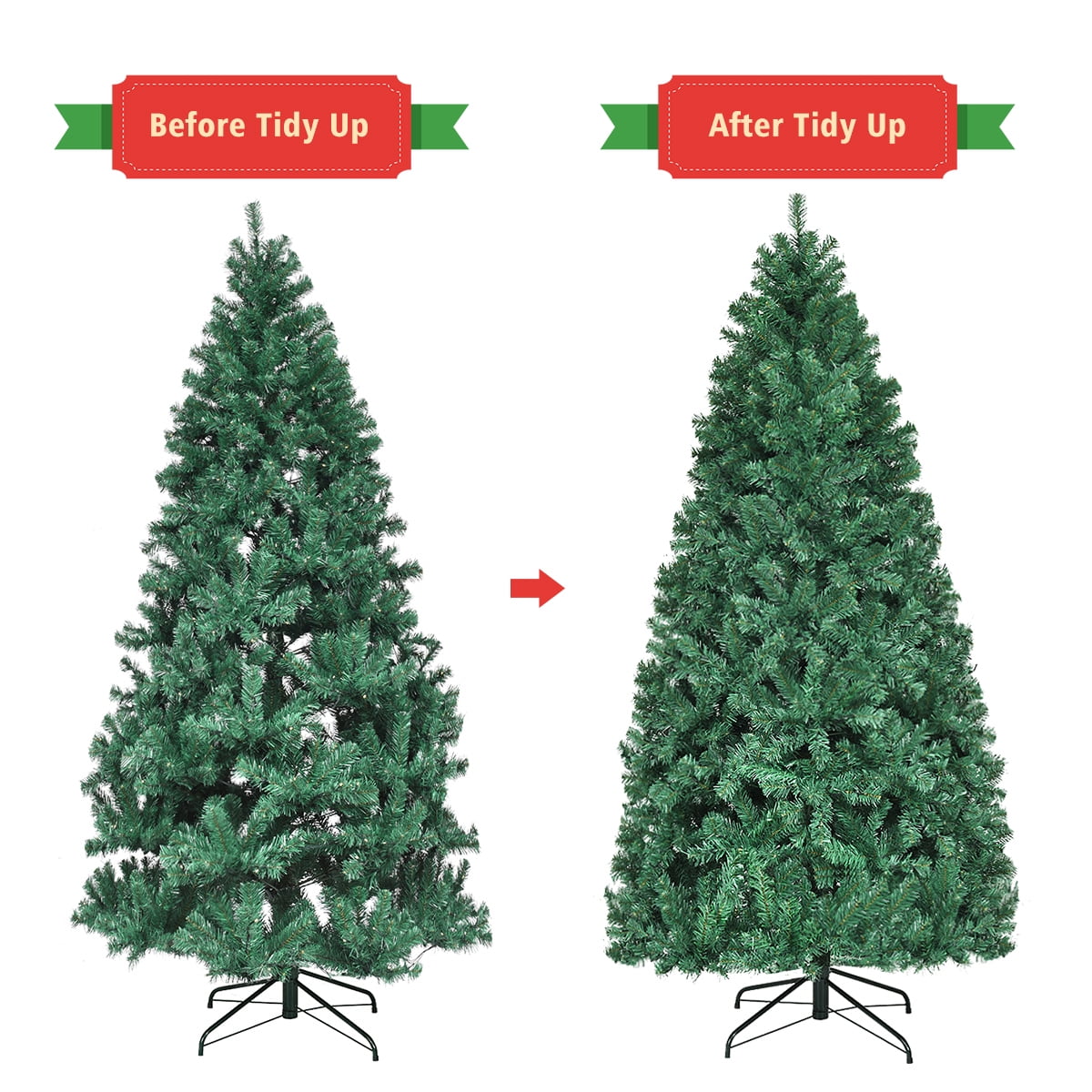 Pre-lit with 300 UL-certified LED lights Hinged branches for easy set-up Energy-saving lights Made of dense PVC Sturdy iron base