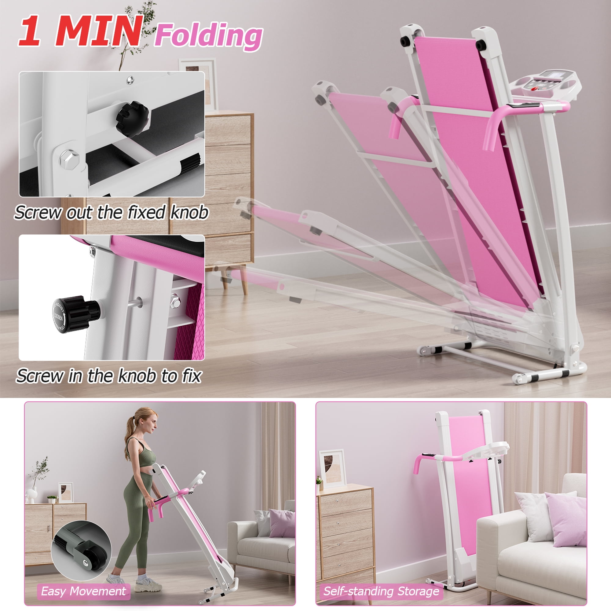 This is our foldable treadmill. If you have little time to go the gym, go running, or are prevented from running due to bad weather, this is the solution. With this treadmill, your home is your gymnasium that will help you stay in shape. It features a multi-function display so you can track your progress, making it very sturdy, and can be folded manually. Feature Multi-function LCD display Runway size:40”x14.5”(LXW);Overall Assembly Size:56”x24”x45.5”(LXWXH) LCD Mode:Heart rate, scan, speed, distance, time and calories Handrails have speed +/-, start/stop and heart rate test functions Safety guaranteed:easy to reach emergency stop switch Home exercise, portable and convenience With IPAD/mobile phone holder Folding design for easy storage Extremely low noise motor Specification Material:Frame:Heavy-duty steel;Control panel:ABS;Running belt:PVC Rated power:800W;Modes:P1-P12 LCD display screen:Heart rate/Speed/ Distance/ Time/ Calories/ Scan Rated voltage:110V;Rated frequency:60Hz;Speed:0.5-6.5 mph Runway size:40″x14.5″(LXW);Overall Assembly Size:56”x24”x45.5”(LXWXH) Weight:55 lbs;Weight Capacity:220 lbs
