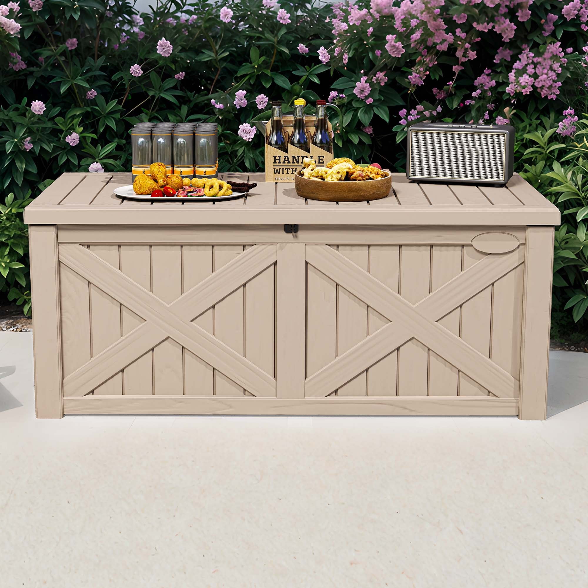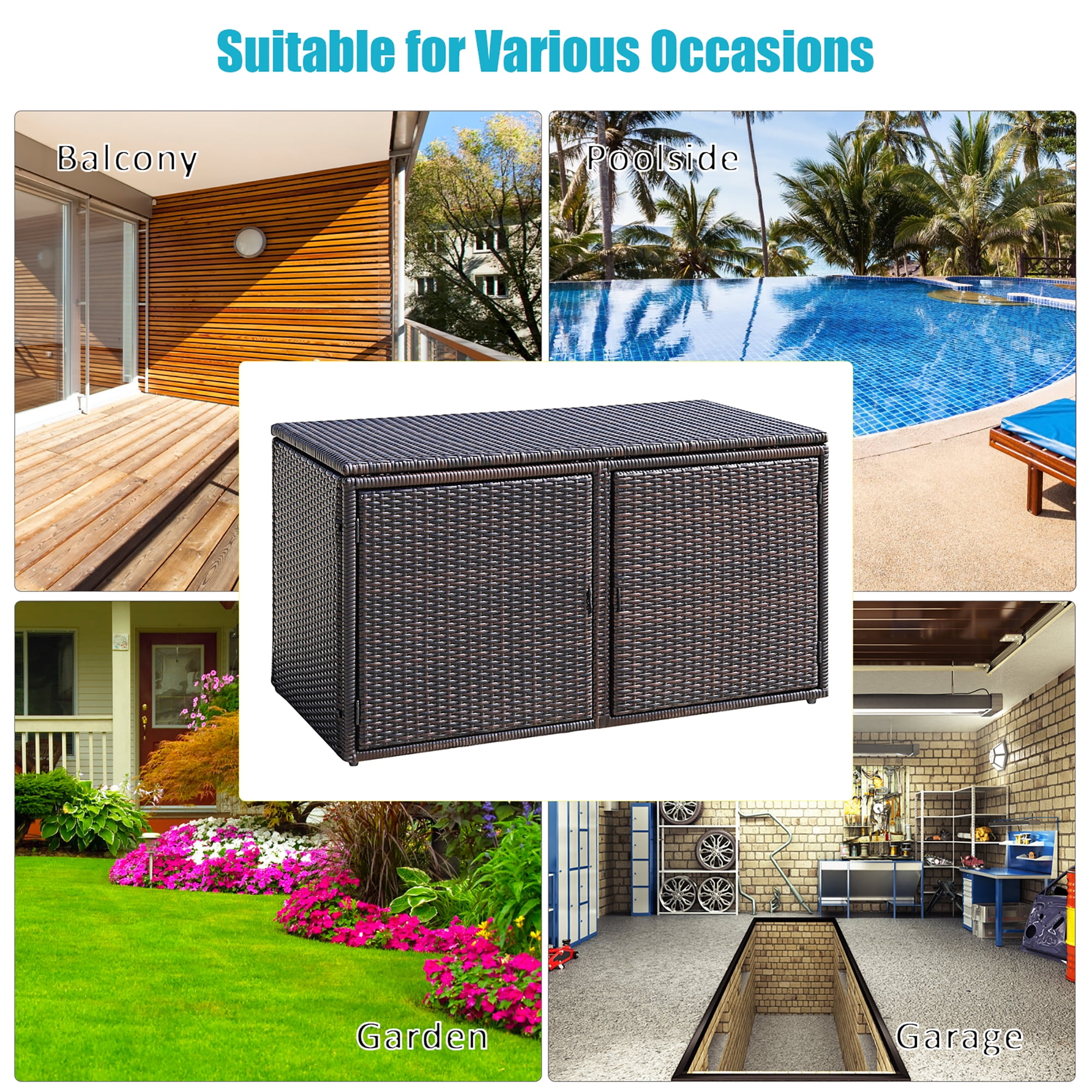 Steel Frame & Exquisite Rattan: The frame of storage deck box is made of strong powder coated steel which ensures sturdiness and durability. And the frame is wrapped with premium PE rattan so that the box is weather resistant. It is great to place the box in your outdoor space to provide additional storage space. Adequate Storage Space with Shelf: The capacity of storage deck box is about 88 gallons and it is perfect to store your things such as toys, grill supplies, tools, sports equipment, gardening items and so on. In addition, the storage box is equipped with a shelf to help you make full use of vertical inner space and store more things. Double Doors & Flip Cover: The storage box can be opened in multiple directions and it is convenient to put in or take out your items. Two front doors are equipped with magnetic snap to prevent accidental opening. And the flip cover on the top which is supported by two premium gas bars is easy to open or close. Multipurpose Storage Box: Designed in concise style, the storage box is ideal to be placed indoors or outdoors to match your furniture set. Not only can the storage box store different things but also is a great decor in your garden, patio, balcony, poolside and backyard. Easy to Install & Maintain: By following detailed instruction, the storage box can be installed in short time by yourself. And it is recommended to tighten the screws after they are fully assembled. The box would also be convenient to clean just with wet cloth.