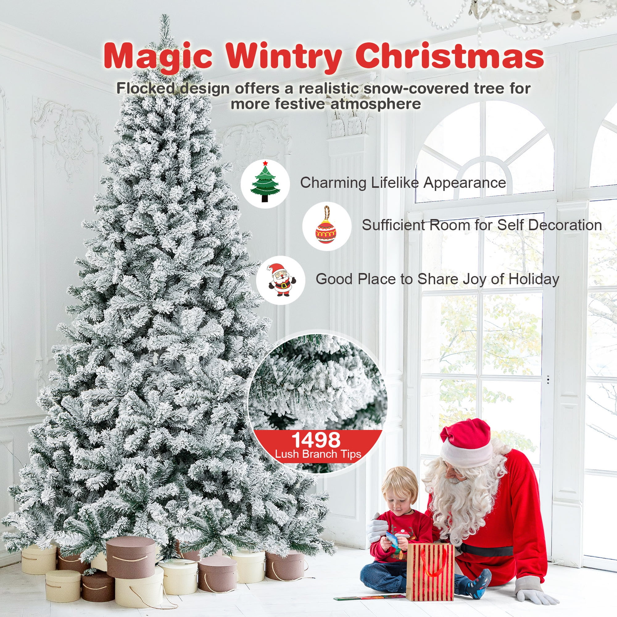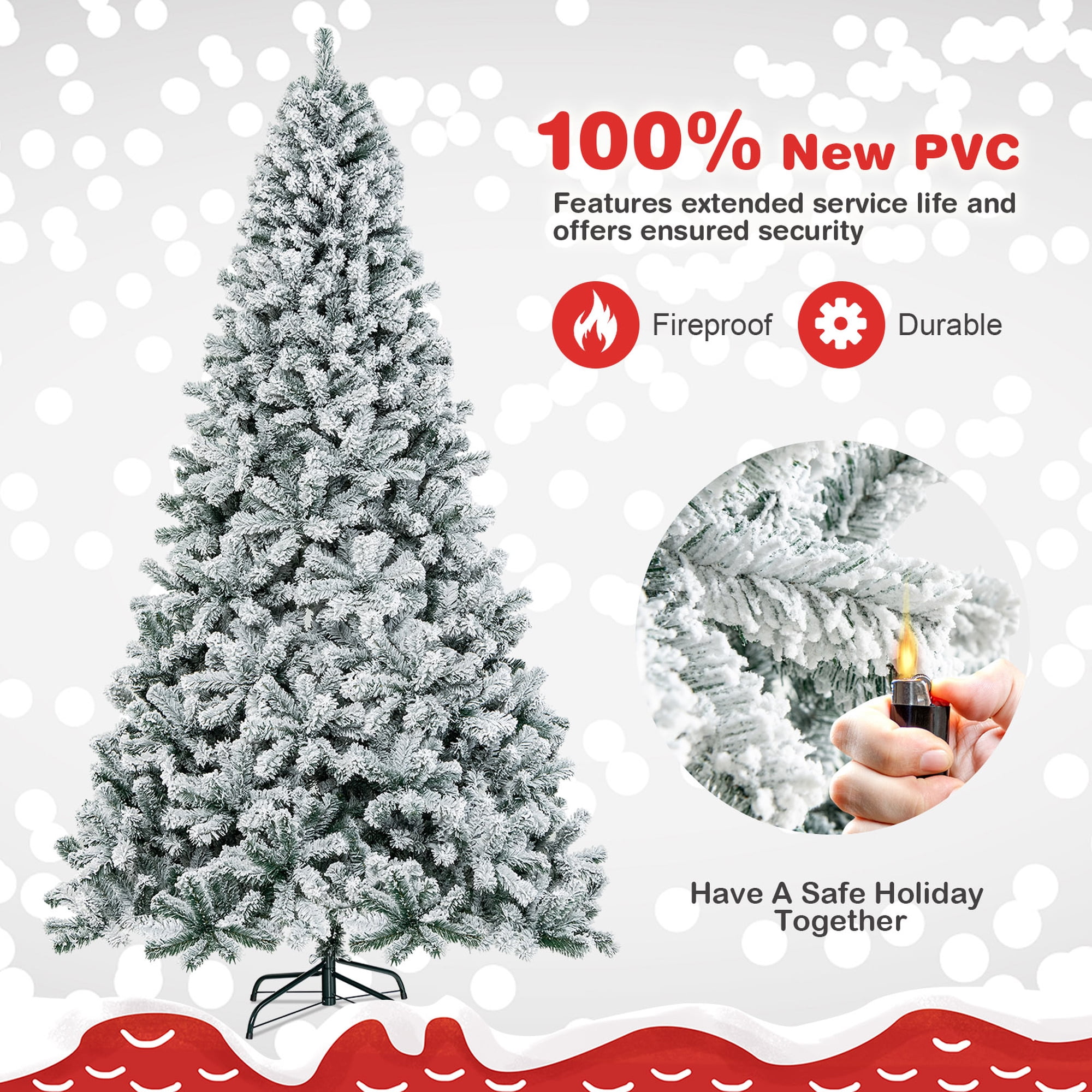 The flocked Christmas tree is the best choice for the snowy season! Coming with 1498 branch tips made of new PVC, the 9ft decoration tree looks very lush and perfectly imitates a real tree. Also, branches can expand automatically with a hinged system, while the tree consists of 4 sections for quick setup. What’s more, the included metal stand is a safeguard to ensure overall stability and avoid tipping. Thus, you can freely add the festival celebration tree to diverse occasions, such as home, office, shop and carnival. Finally, it will become an impressive symbol for your best wishes at your party. Feature Flocked design to make the Christmas tree look snowy Remind you of spring with vibrant 1498 branch tips Made of new PVC for excellent durability Hinged system to offer the auto dropping of branches for convenience Can be taken down into 4 sections for space-saving storage Ensured stability provided by the folding metal stand Blend well into office, home, school, shop, carnival and more Time is saved thanks to the simple installation Specification Color: White Material: PVC, Metal Tree Height: 9ft Tree Width: 5ft Diameter of Metal Stand: 23.5” Number of Branch Tip: 1498 Number of Section: 4 Net Weight: 28 lbs Package Includes: 1 x Flocked Christmas Tree 1 x User Guide
