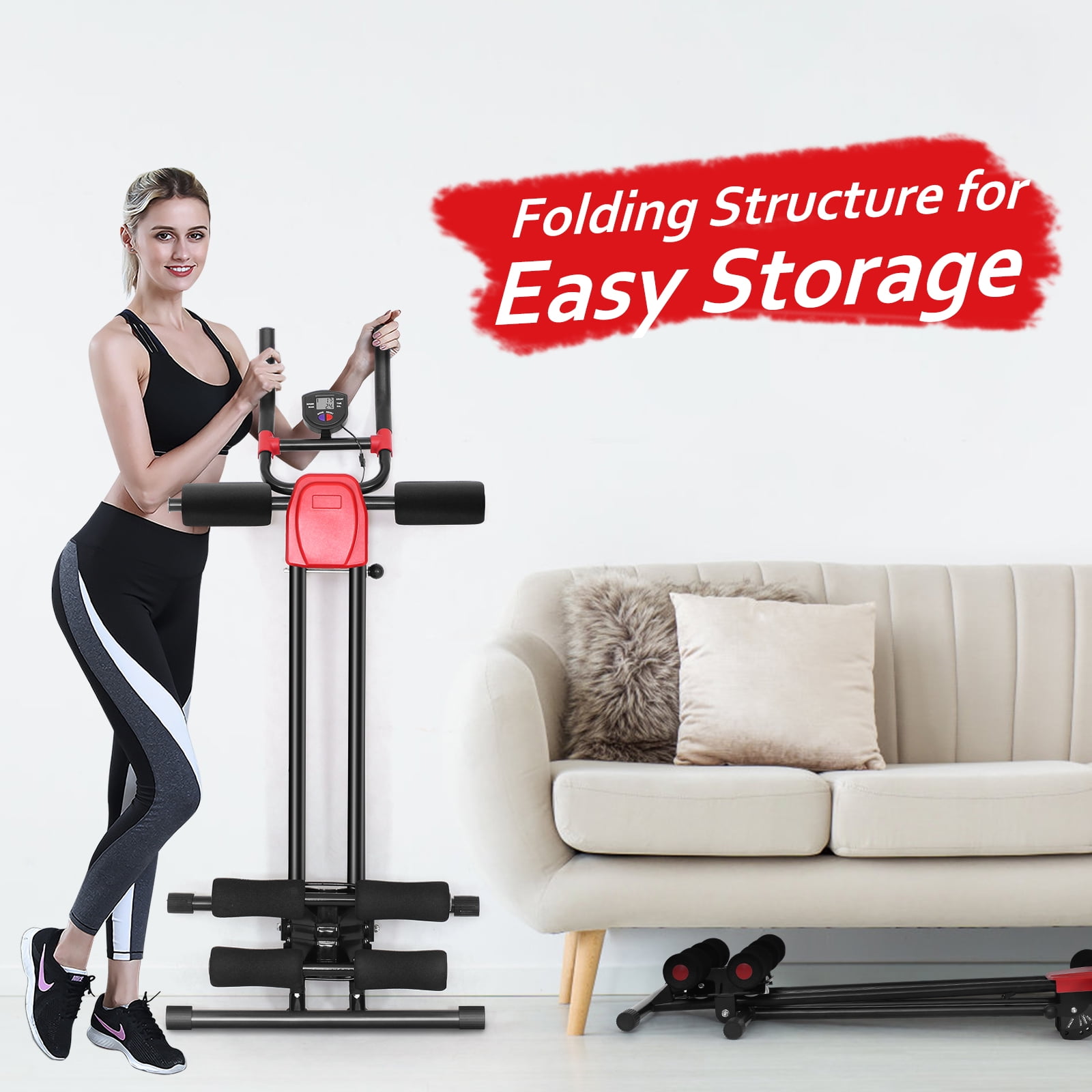 Our abdominal trainer is crafted with sturdy iron and supported by a triangle metal structure, which comes with large weight capacity of 220lbs. 4 different Intensity levels can be adjusted to help you exercise various parts of your body, so that your waist, legs and arms are thinner. Also, there are a comfortable handgrip and soft foam-covered knee cushion to ensure your knees and elbows will get considerate protection while training. Equipped with a large LED screen display, it allows you to check the number of steps, exercise time and calorie data at any time. So you can easily keep track of your progress and physical condition. Take minutes to reach your target and get perfect shape with this ab workout machine! Feature Smart LCD display on the handle clearly shows count, time, calories and speed Sturdy and sturdy iron material offers a steady training experience Cushions on handle offer a better grip, ensuring maximum comfort and safety Easily keep track of your progress and physical condition with LCD monitor 4 Resistance levels can meet different training needs, ideal for beginners and professionals. With 6 foam-covered cushions, the machine offers a comfortable and safe training experience. 4 non-slipping pads not only enhance overall stability but also protect the floor from scratches. Specifications Color: Black+ Red Material: Foam+ Iron+ ABS+ Nylon Overall Dimension: 38”x22”x34” (L x W x H) Folding Dimension: 50.5”x21.5”x6”(L x W x H) Net Weight: 46 lbs Weight Capacity: 220 lbs Package Includes: 1 x Abdominal Trainer 1 x Instructions Specification Color: Black+ Red Material: Foam+ Iron+ ABS+ Nylon Overall Dimension: 38”x22”x34” (L x W x H) Folding Dimension: 50.5”x21.5”x6”(L x W x H) Net Weight: 46 lbs Weight Capacity: 220 lbs Package Includes: 1x Trainer (Need 2xAAA battery, not included) 1 x Instructions