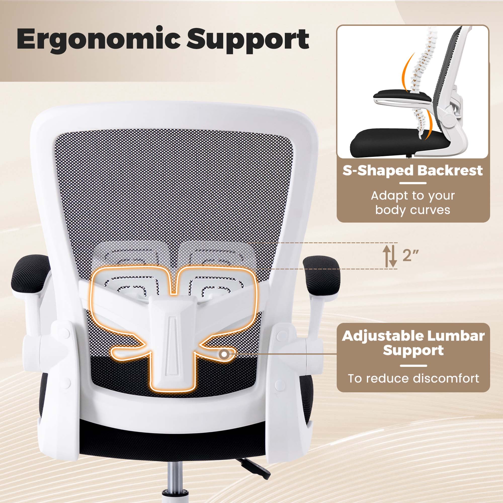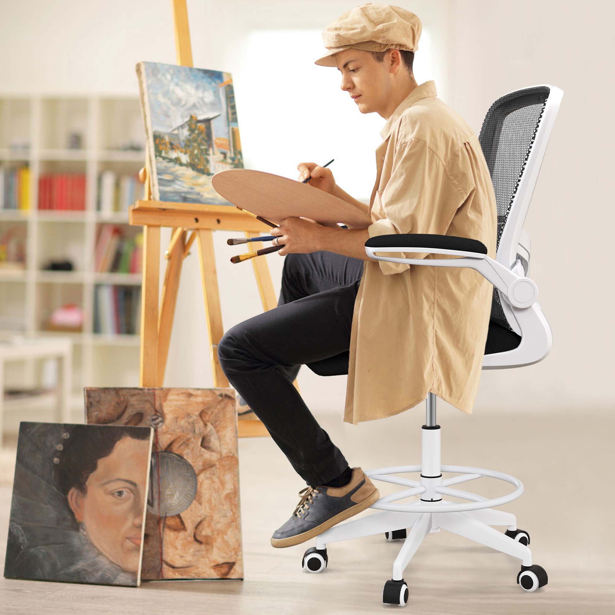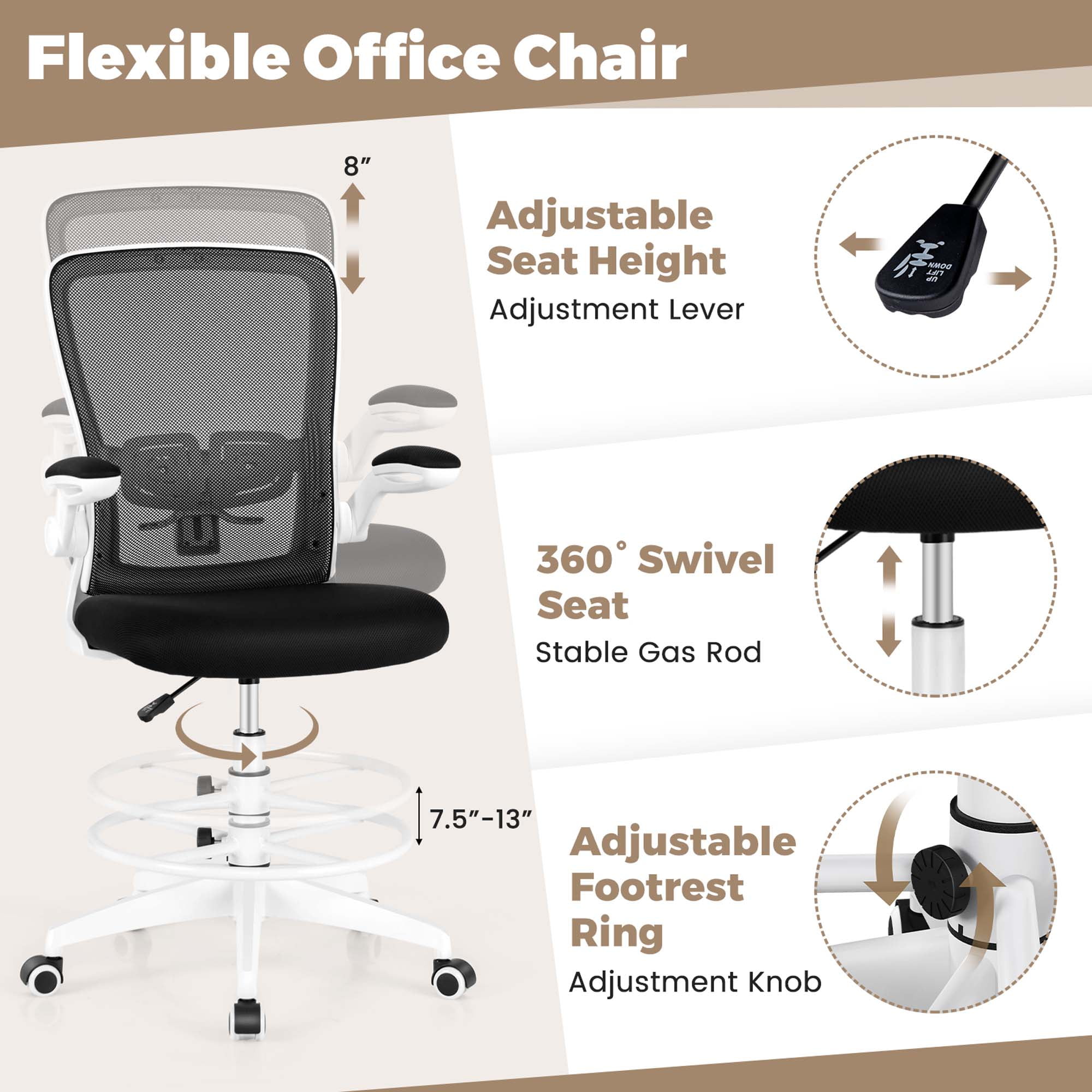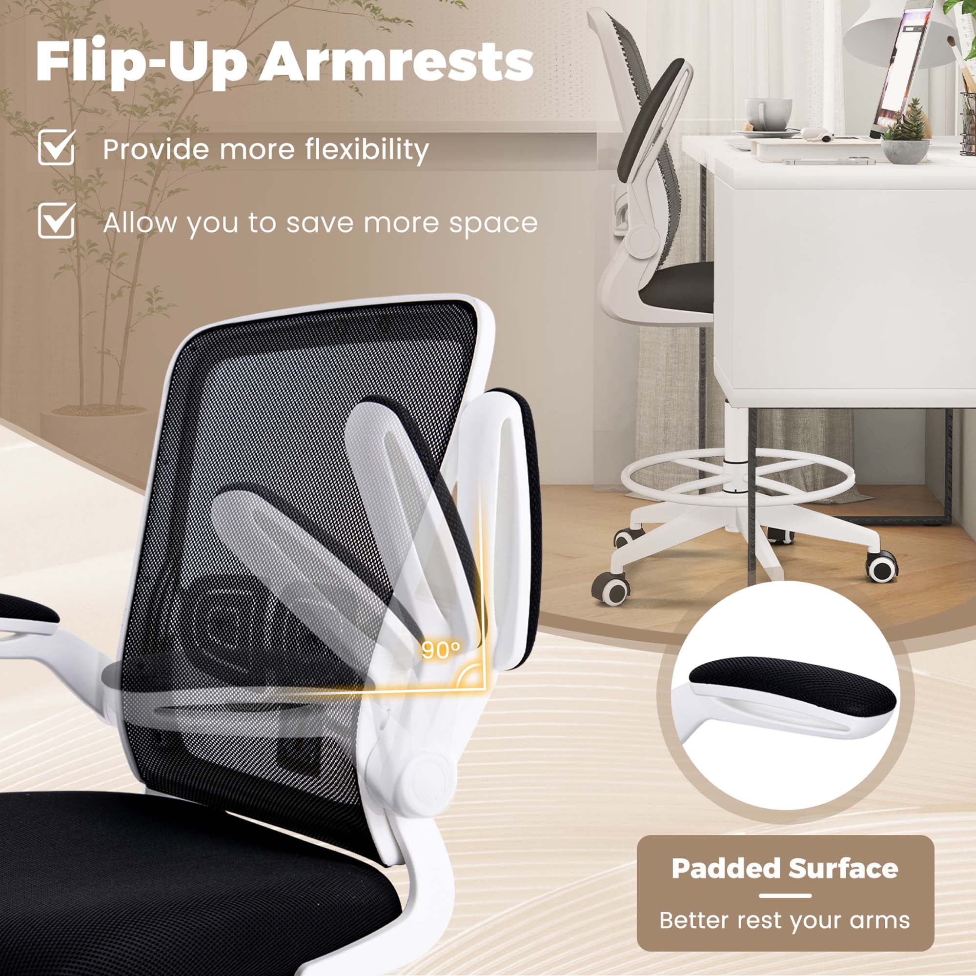 Costway Adults Mesh Fabric/Sponge/ PP indoor Adjustable Drafting Desk Chair, Black/White Adjustable Lumbar Support: 2″ adjustable lumbar support with an S-shaped backrest for proper posture and reduced backaches Cozy & Durable Materials: Breathable mesh fabric and thick sponge padding for comfort and durability Adjustable Swivel Design: Swivel seat with adjustable height from 22.5″ to 30.5″ Adjustable Footrest Ring: Footrest height adjustable from 7.5″ to 13″ for lower body strain relief Flip-Up Padded Armrests: Armrests can be flipped up for extra space or down for added support